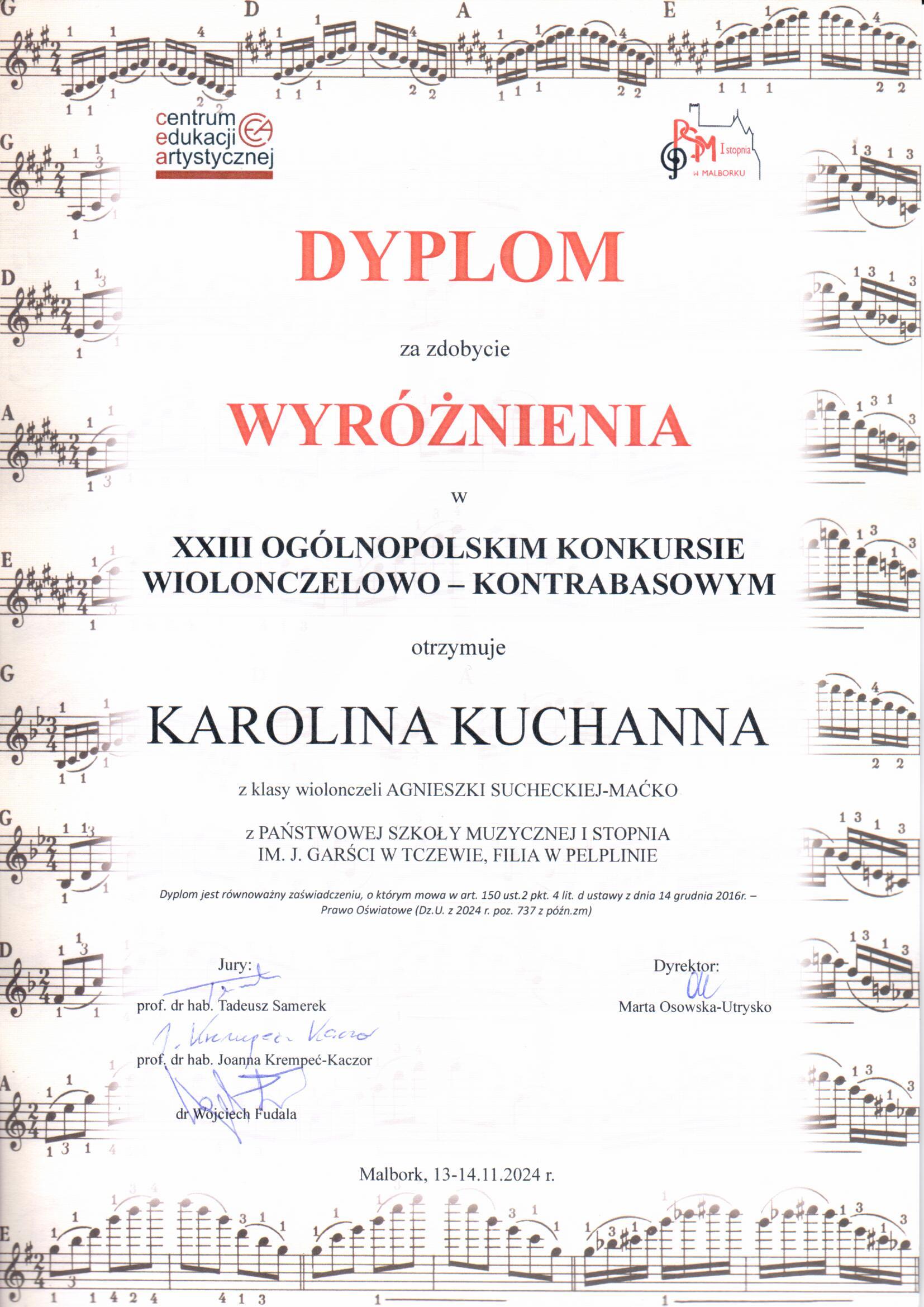 Dnia 13 i 14 listopada 2024 r. w Malborku odbył się XXIII Ogólnopolski Konkurs Wiolonczelowo-Kontrabasowy, podczas którego uczennica Karolina Kuchanna z klasy wiolonczeli pani Agnieszki Sucheckiej-Maćko została wyróżniona w swojej kategorii. Do sukcesu Karoliny przyczyniła się również pięknym akompaniamentem pani Małgorzata Pielak-Januszkiewicz