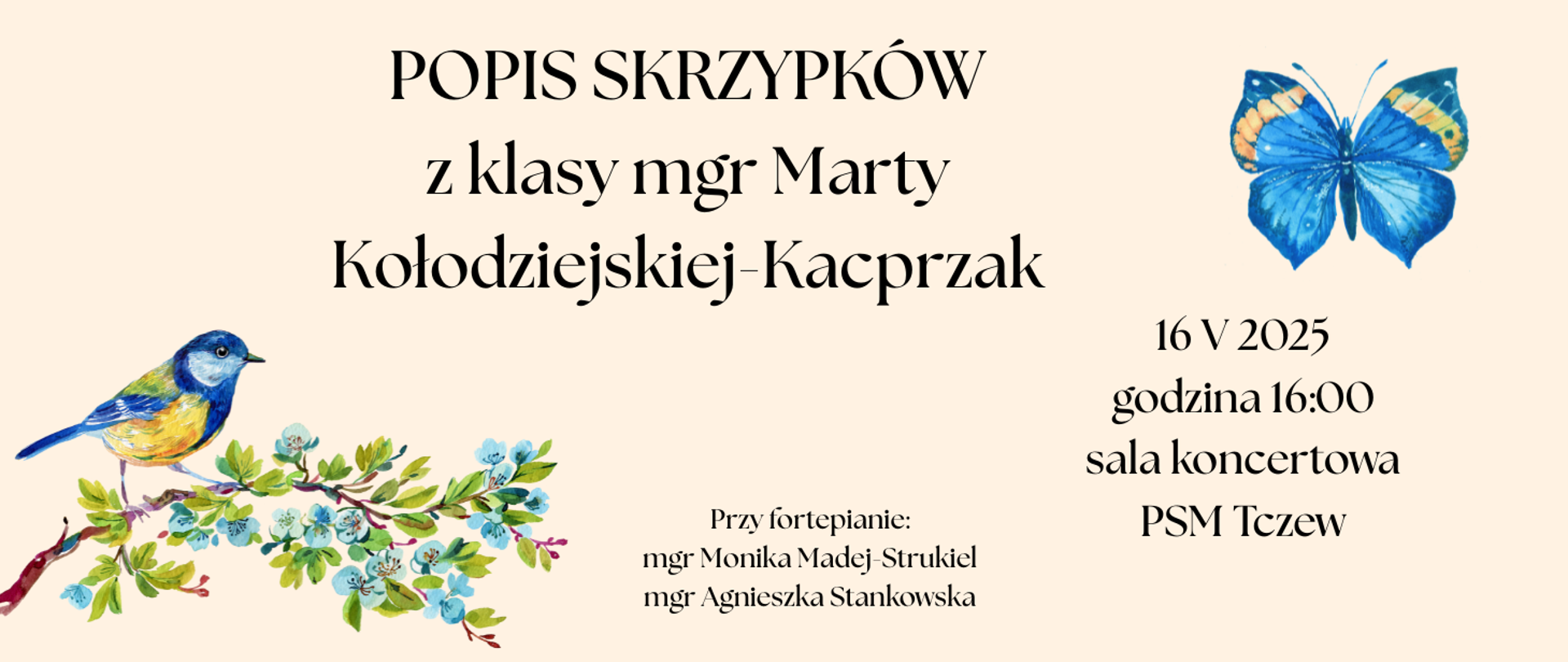 16 maja 2025 r. na godzinę 16:00 zapraszamy do sali koncertowej Szkoły Muzycznej na POPIS SKRZYPKÓW z klasy mgr Marty Kołodziejskiej-Kacprzak. Uczniom przy fortepianie towarzyszyć będą mgr Monika Madej-Strukiel oraz mgr Agnieszka Stankowska.
