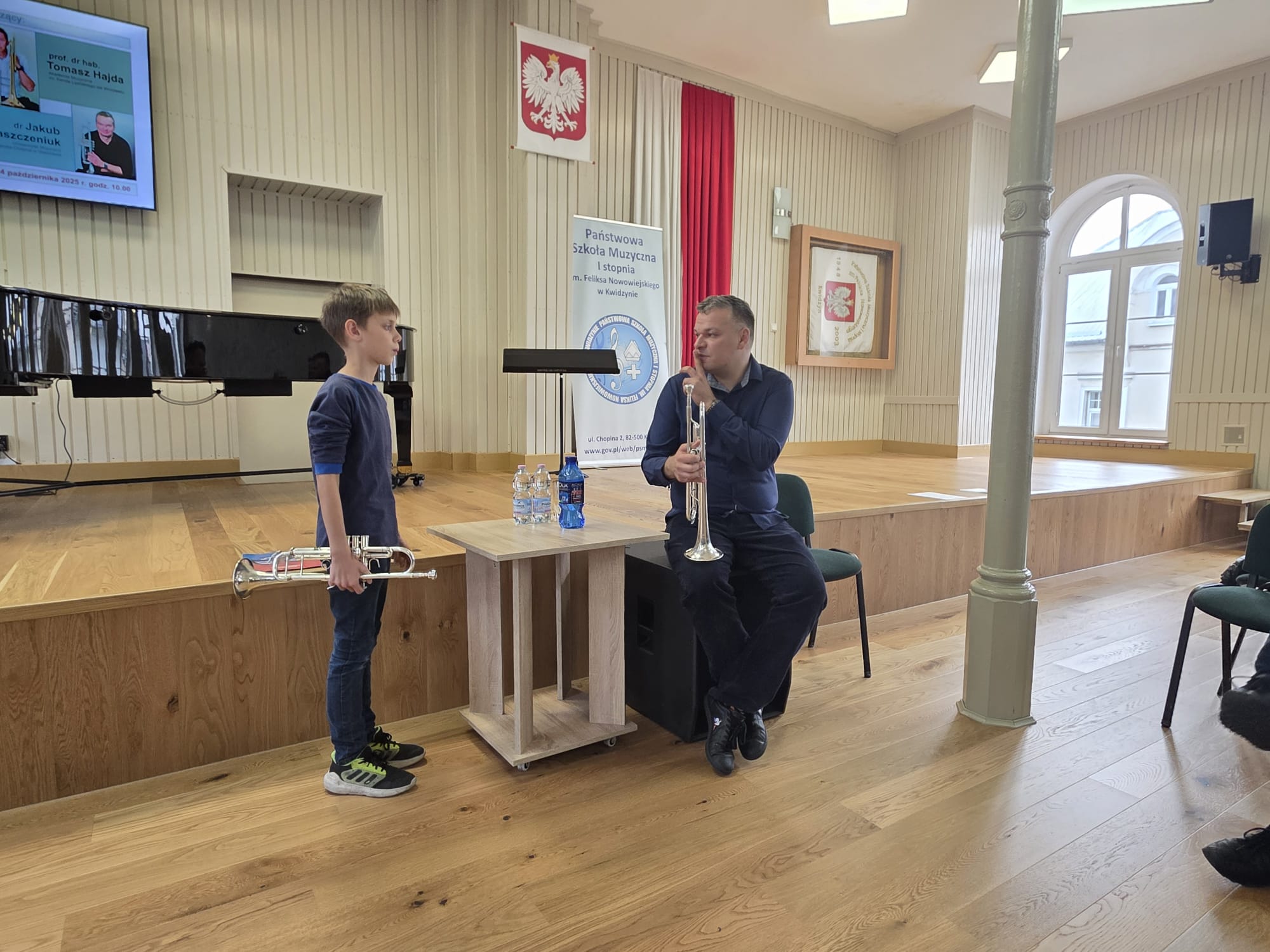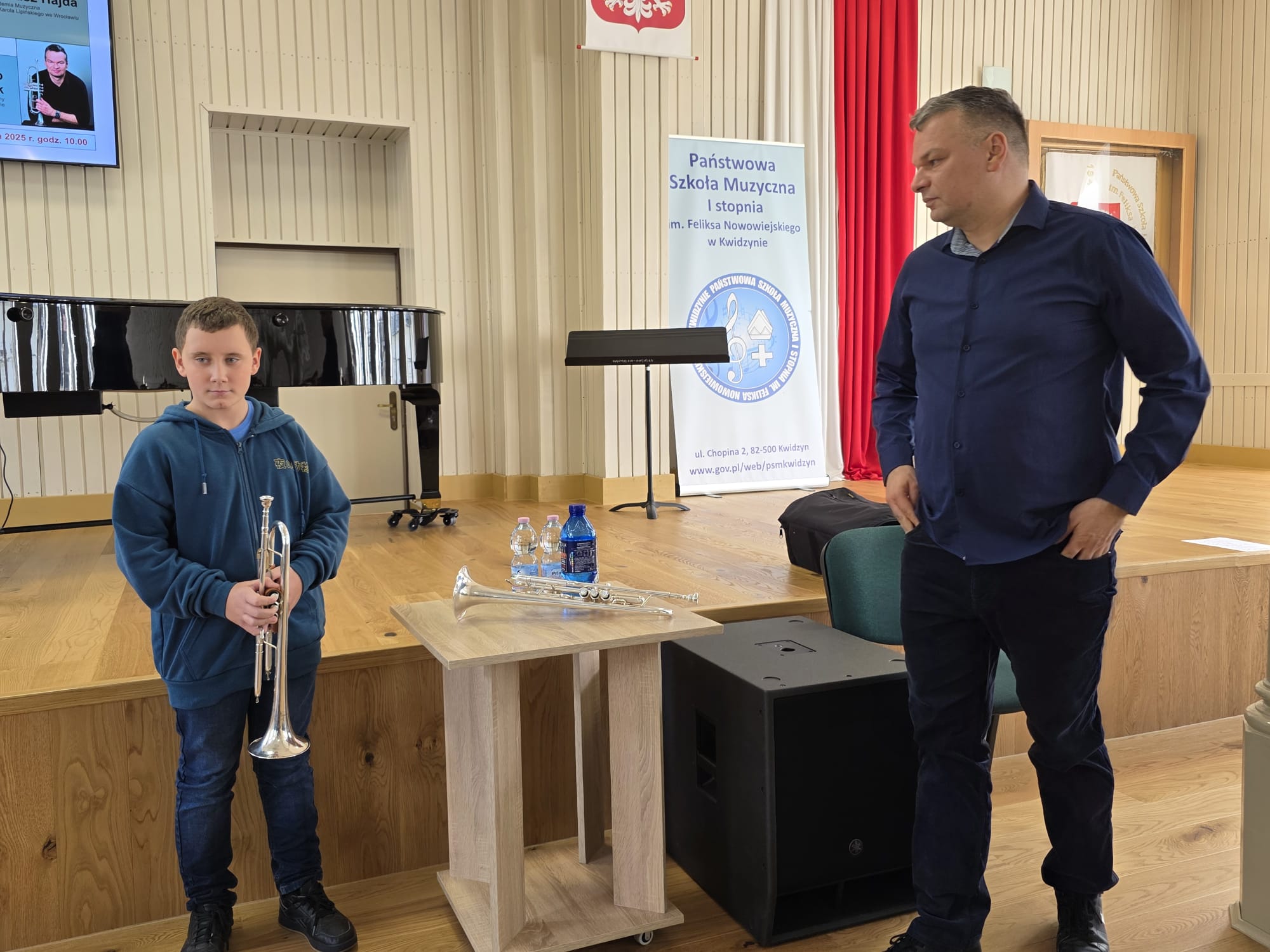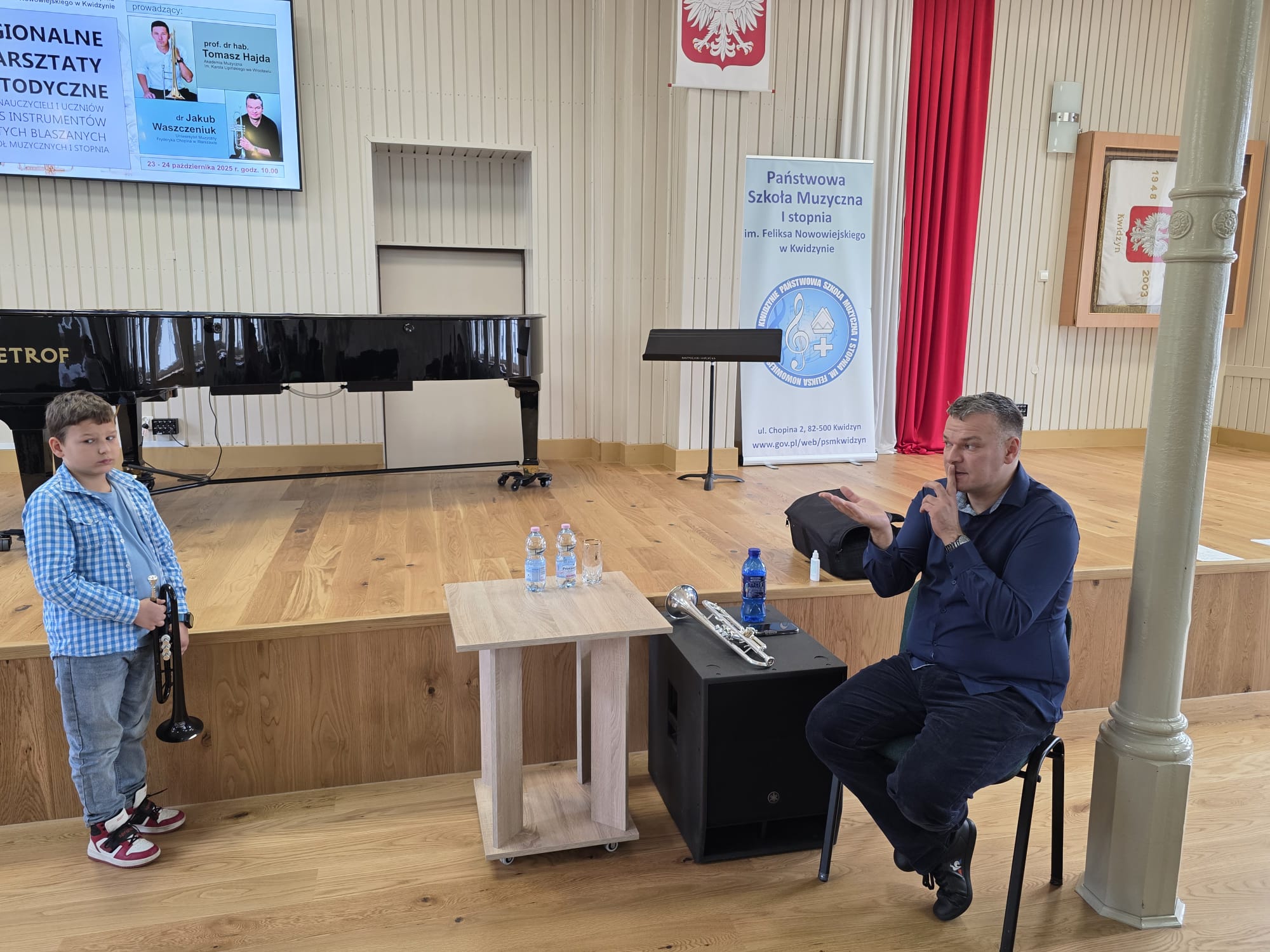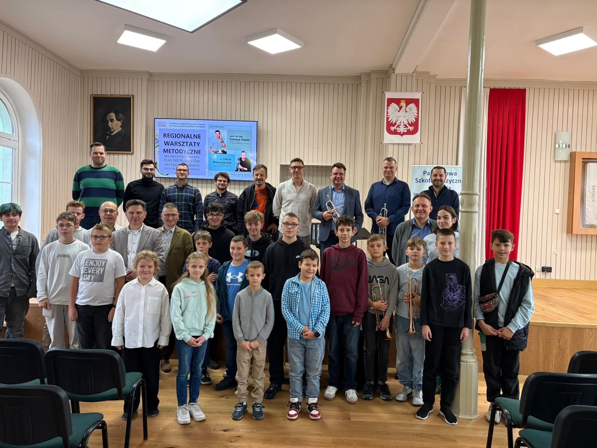 W szkole muzycznej nauka może przybierać różną formę tj. lekcje indywidualne, lekcje grupowe, a także warsztaty solistyczne i zespołowe oraz wiele innych. 23 października 2025 r. trębacze z klasy p. Piotra Kowalkowskiego i p. Konrada Elszkowskiego uczestniczyli wraz ze swoimi nauczycielami w Regionalnych Warsztatach metodycznych dla nauczycieli i uczniów klas instrumentów dętych blaszanych szkół muzycznych I stopnia w PSM I st. w Kwidzynie. Konstanty Liss, Felicjan Gancarz i Franciszek Osowski pracowali na lekcjach indywidualnych z dr Jakubem Waszczeniukiem (Uniwersytet Muzyczny Fryderyka Chopina w Warszawie). Dla naszych uczniów to wielkie wyróżnienie móc czerpać wiedzę od tak znakomitego muzyka. To też wielka motywacja do dalszego rozwoju, doskonalenia aparatu gry i poszukiwaniu ciekawych interpretacji muzycznych.