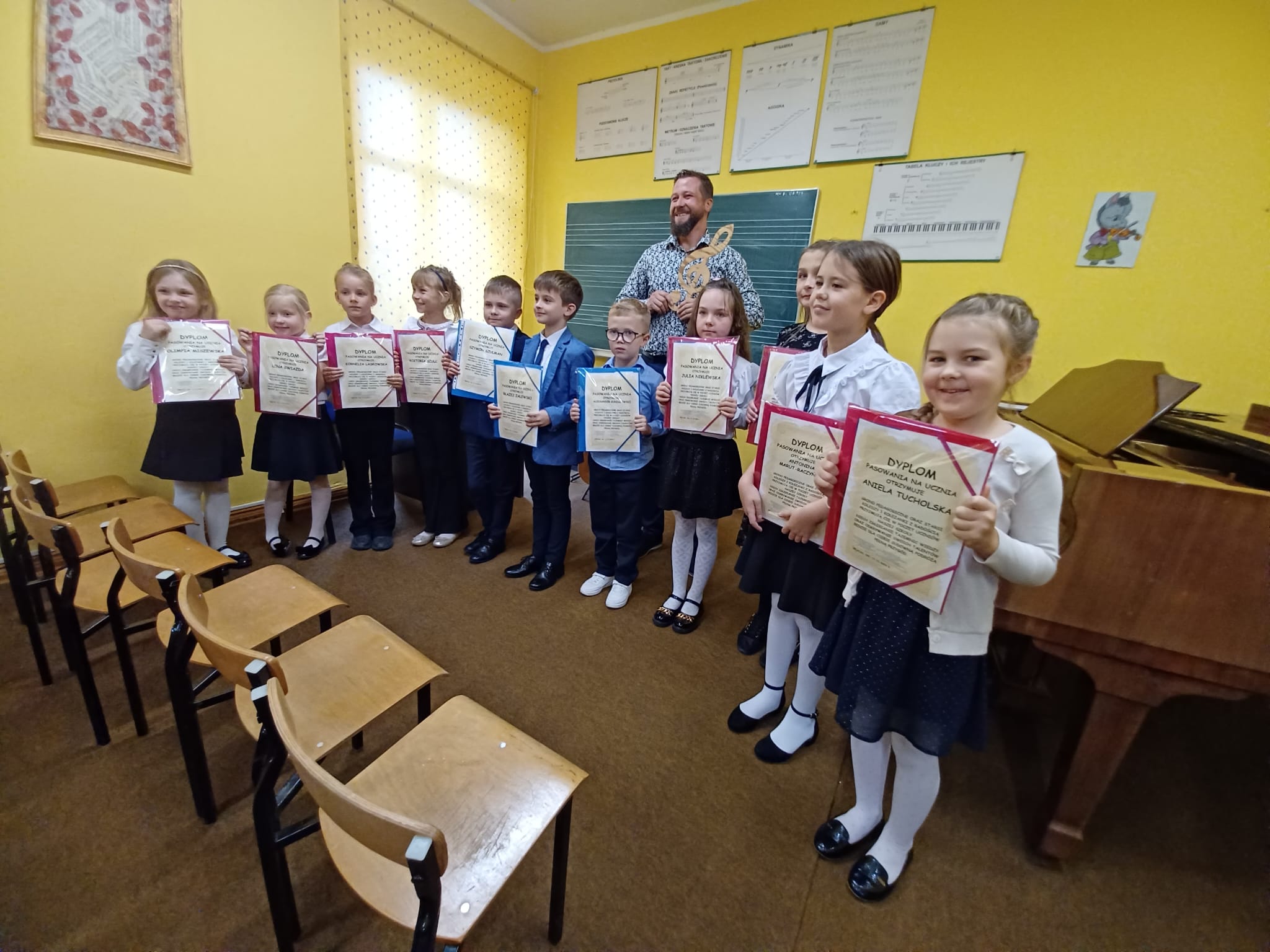 Wczoraj (11.10.2023 r.) w naszej szkole miała miejsce "Uroczystość pasowania na ucznia". Uczniowie pierwszej klasy uroczyście złożyli ślubowanie i obiecali oddać się muzyce z całym sercem. Następnie można było usłyszeć koncert, między innymi w wykonaniu pierwszaków. Dla wielu z nich to był pierwszy występ muzyczny w życiu!