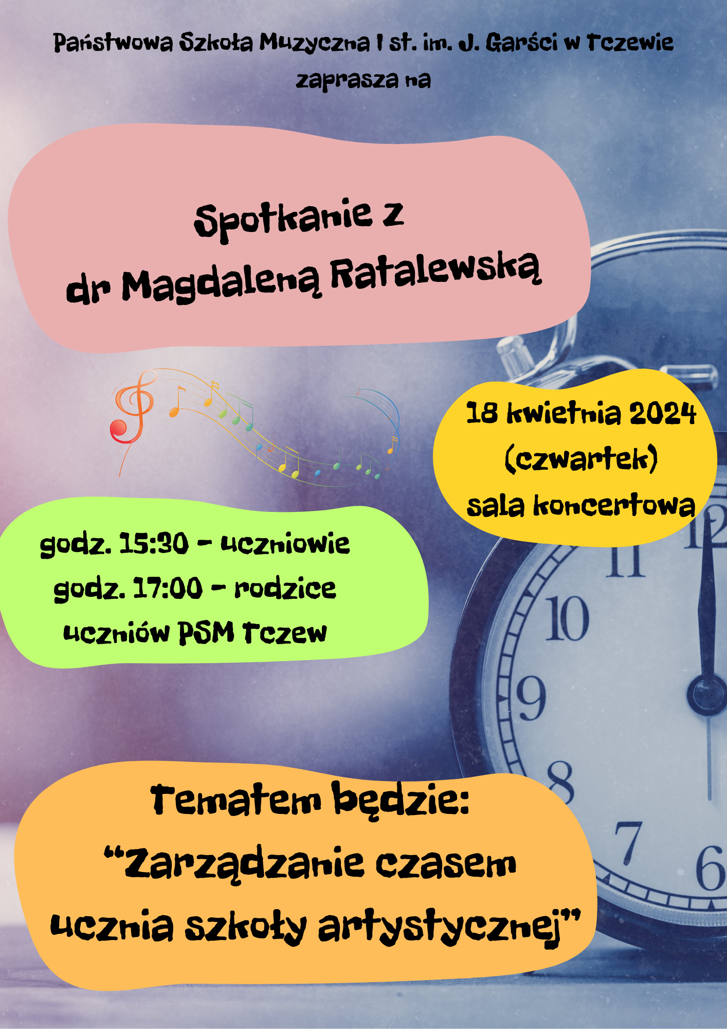 Zapraszamy wszystkich naszych uczniów i rodziców uczniów na niezwykłe spotkanie z psycholog - dr Magdaleną Ratalewską. Tematyką będzie: "Zarządzanie czasem ucznia szkoły artystycznej".