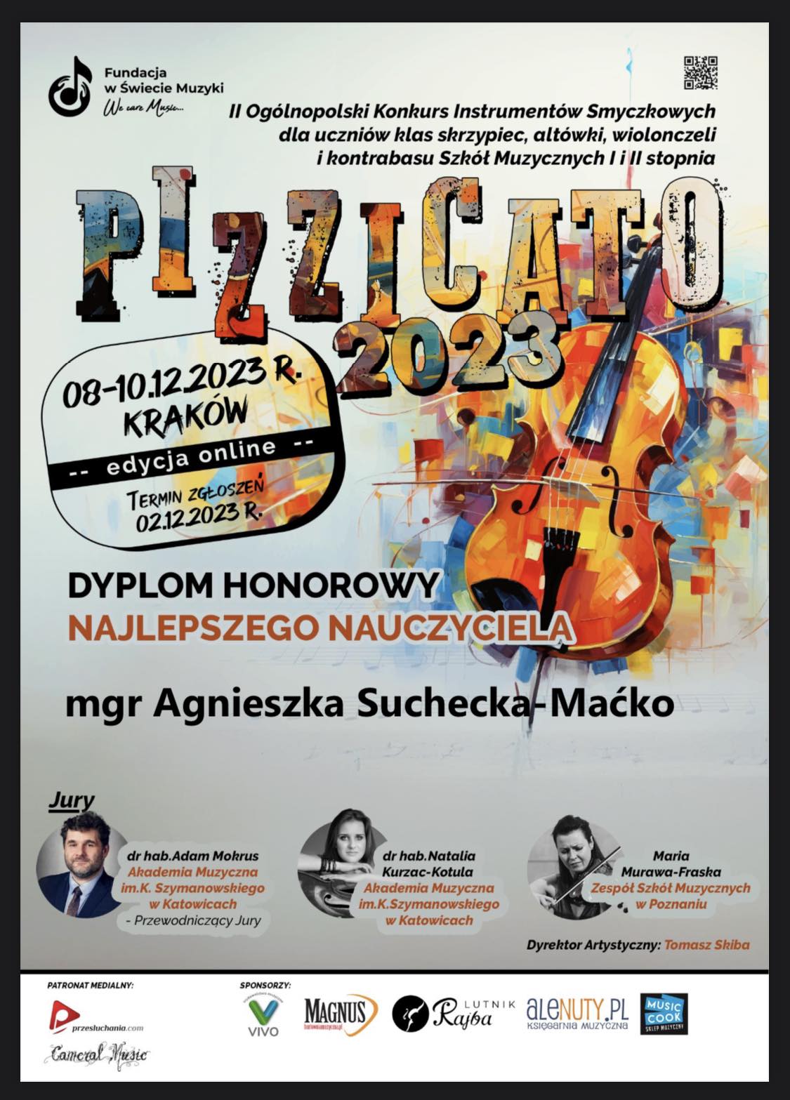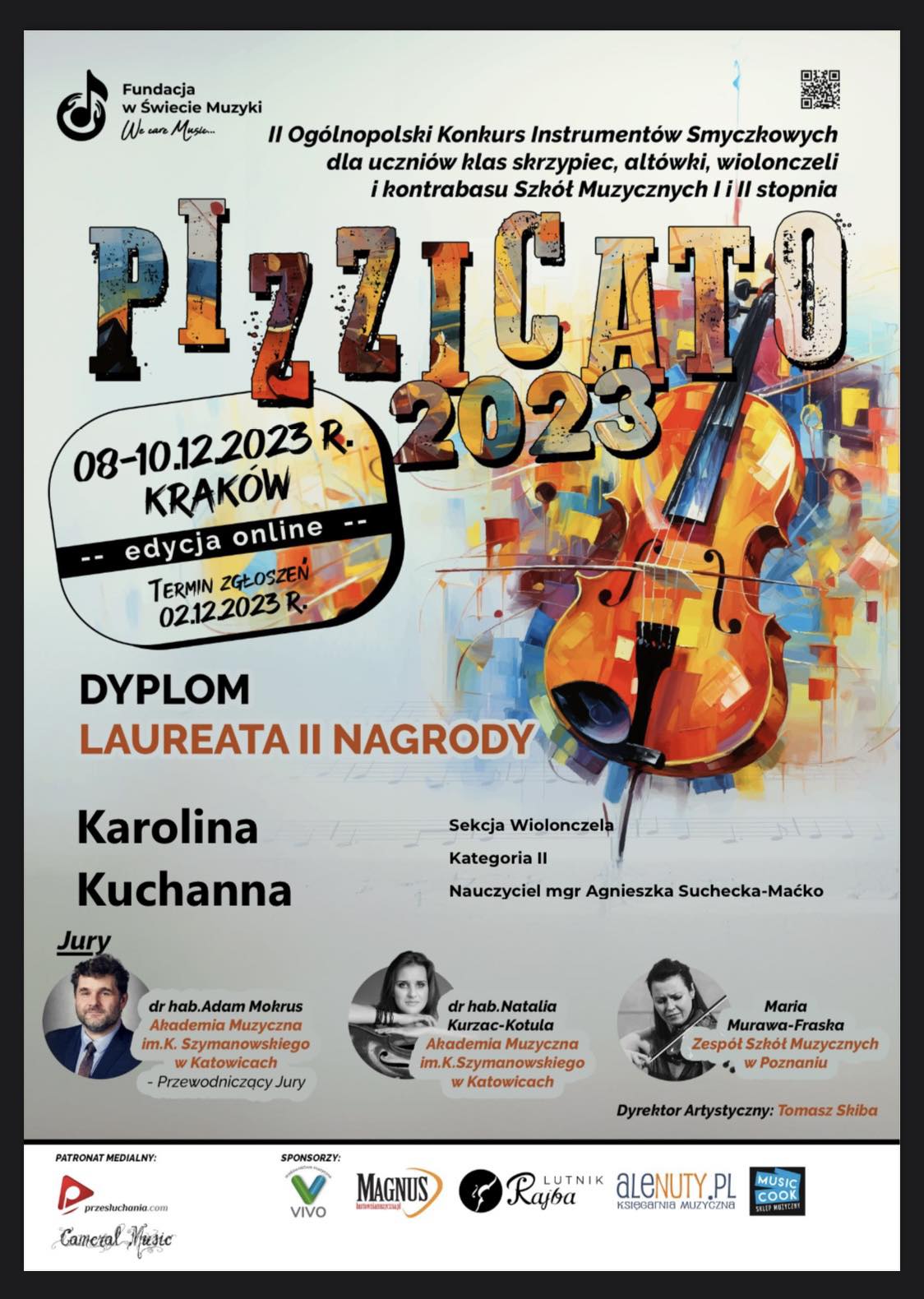 Nasza uczennica Karolina Kuchanna z klasy wiolonczeli pani Agnieszki Sucheckiej-Maćko zdobyła ona II nagrodę w kategorii II na II Ogólnopolskim Konkursie Instrumentów Smyczkowych dla uczniów klas Skrzypiec, Altówki, Wiolonczeli i Kontrabasu Szkół Muzycznych I i II Stopnia PIZZICATO 2023.