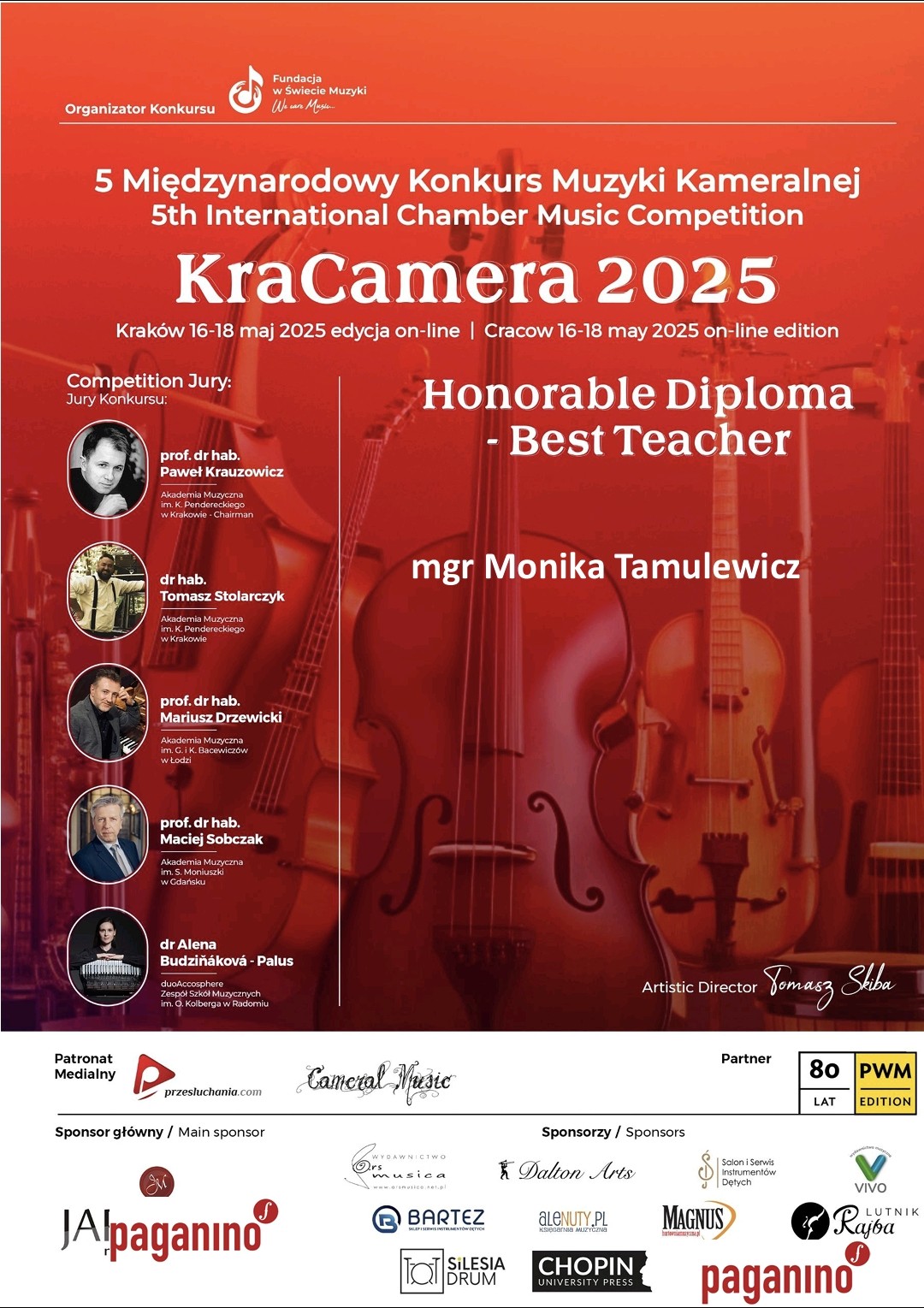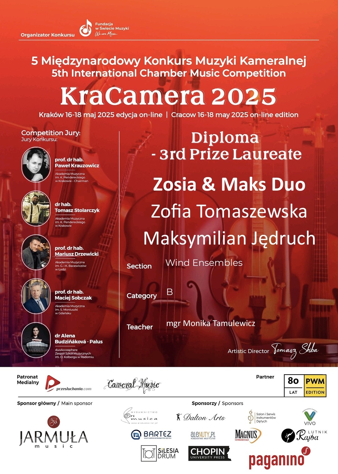 5 Międzynarodowy Konkurs Muzyki Kameralnej „KraCamera 2025”, 16-18.05.2025, Kraków, edycja on-line: Zosia & Maks Duo – Zofia Tomaszewska i Maksymilian Jędruch – III miejsce (kat. B), Dyplom za wyróżniające przygotowanie uczniów – p. Monika Tamulewicz.