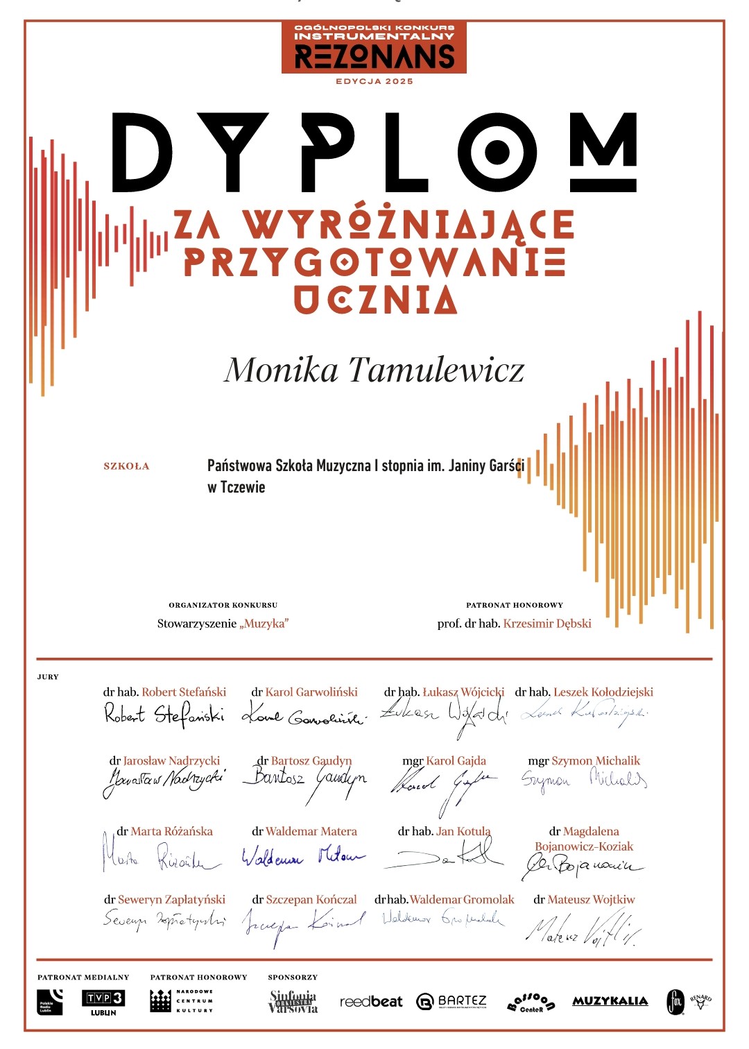 III Ogólnopolski Konkurs Instrumentalny dla uczniów szkół muzycznych I i II st. „VIRTUOSO!”, 14-30.04.2025 r. , Toruń: Maksymilian Jędruch – Wyróżnienie I st. (gr. 1, kat. B), Zofia Tomaszewska – Wyróżnienie II st. (gr. 1, kat. B), Dyplom uznania za wyróżniające przygotowanie ucznia – p. Monika Tamulewicz, Dyplom uznania za wyróżniający akompaniament – p. Marcin Hinz.