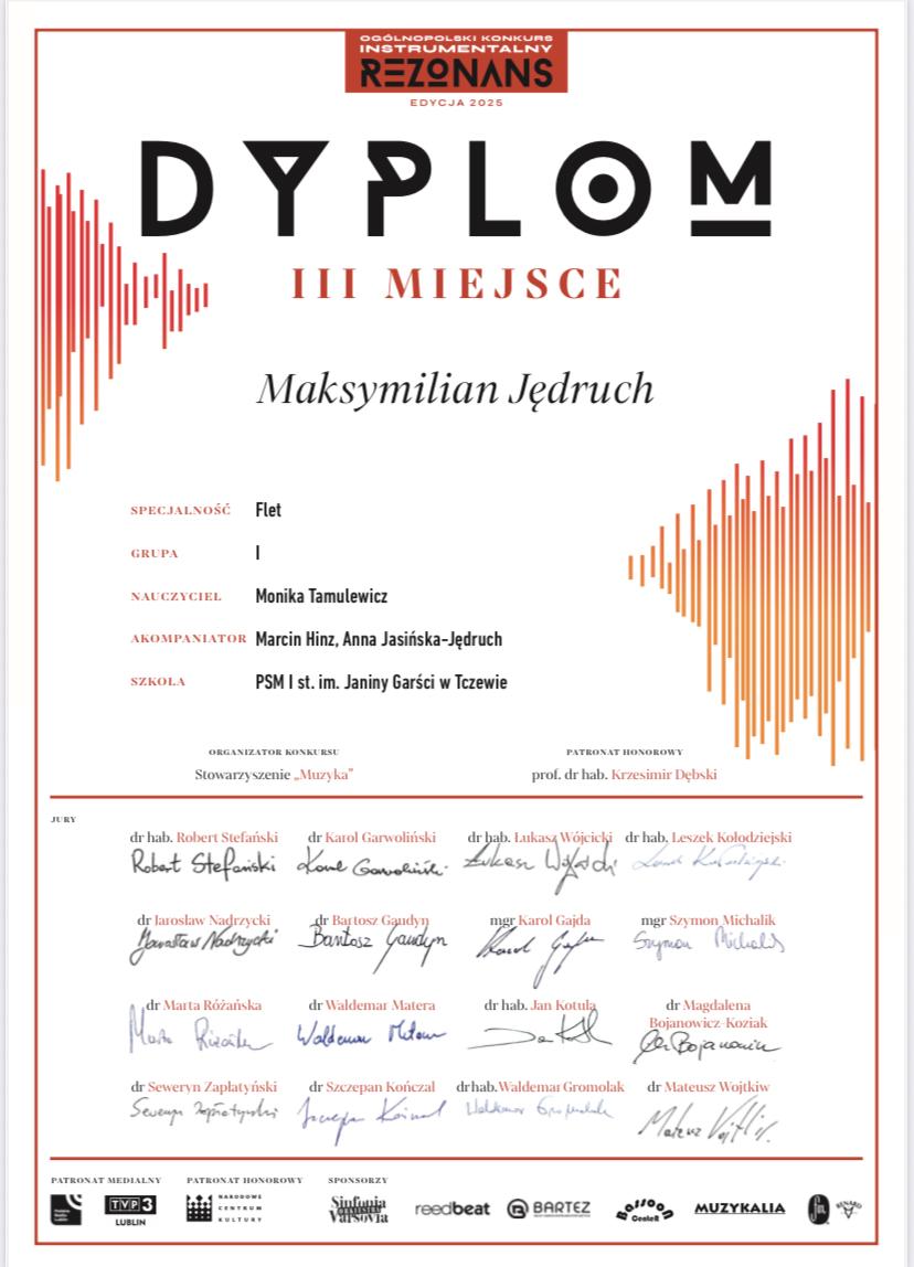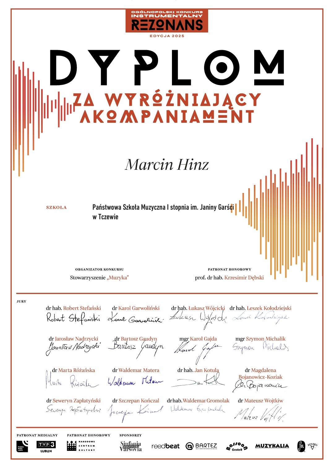 Ogólnopolski Konkurs Instrumentalny „REZONANS 2025”, edycja on-line, pod patronatem honorowym Krzesimira Dębskiego: Maksymilian Jędruch – III miejsce, Dyplom za wyróżniający akompaniament – p. Anna Jasińska-Jędruch, Dyplom za wyróżniające przygotowanie ucznia – p. Monika Tamulewicz, Dyplom za wyróżniający akompaniament – Marcin Hinz.