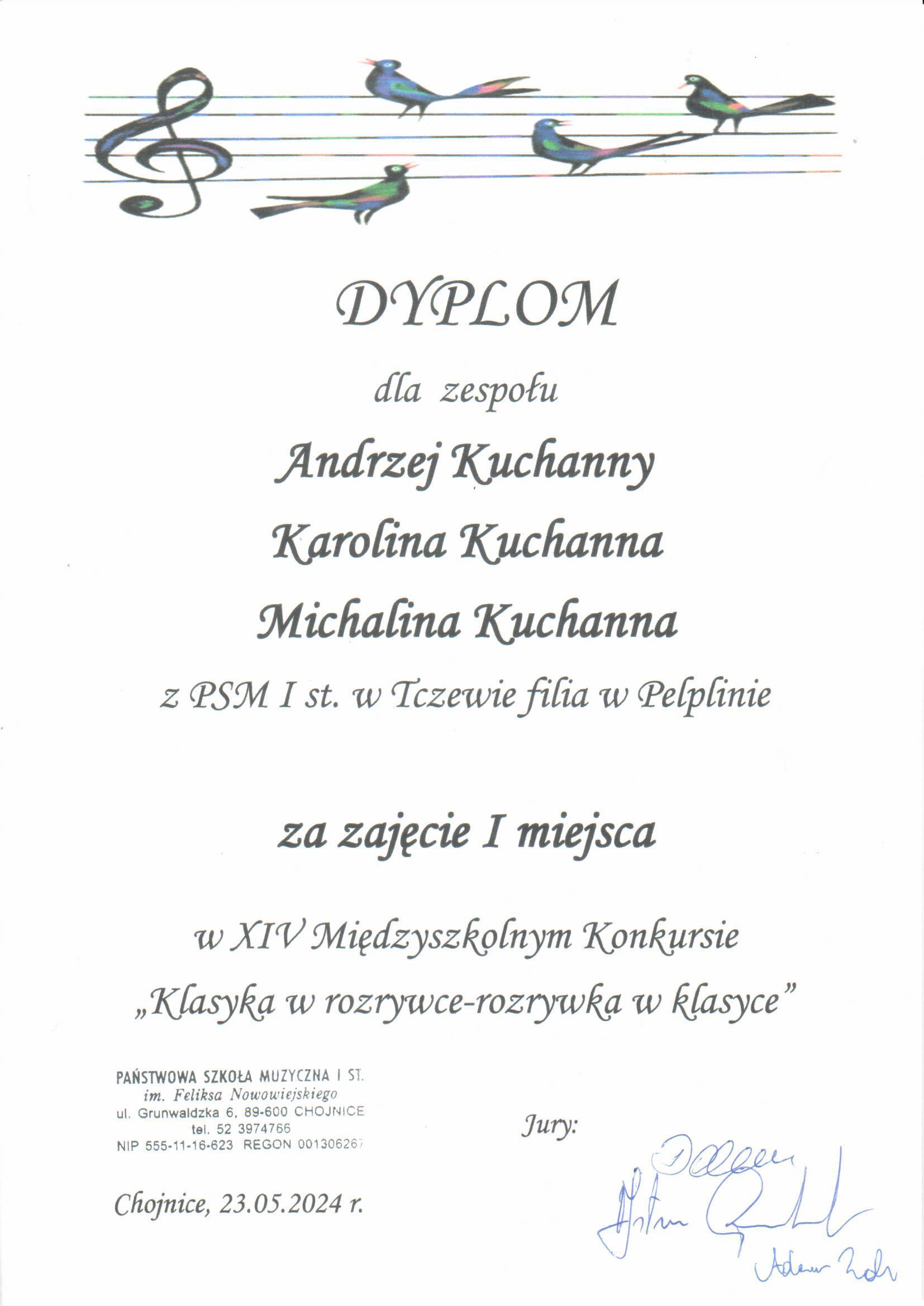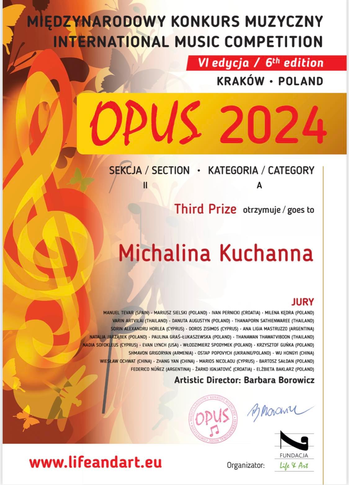- Michalina Kuchanna - III miejsce w sekcji II, kategorii A, na Międzynarodowym Konkursie Muzycznym "Opus 2024"