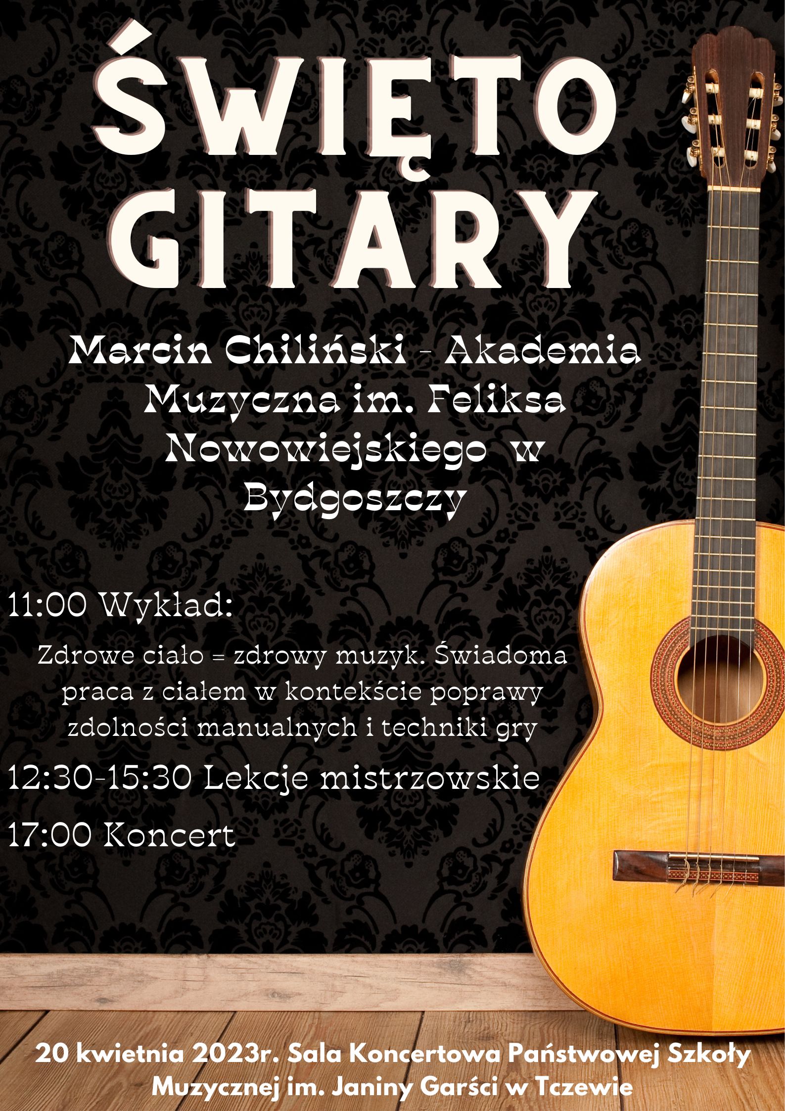Serdecznie zapraszamy na ŚWIĘTO GITARY, które odbędzie się 20 kwietnia 2023 r. (czwartek). Przez cały dzień to gitara będzie w centrum naszych zainteresowań, a naszym gościem specjalnym, prowadzącym wykład oraz wspaniałym artystą, który na zakończenie wystąpi z koncertem, będzie mgr Marcin Chiliński z Akademii Muzycznej im. Feliksa Nowowiejskiego w Bydgoszczy. Harmonogram Święta gitary: