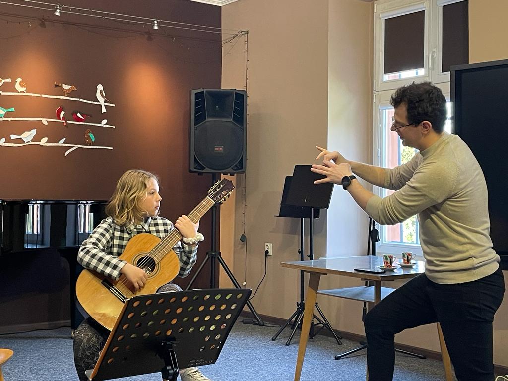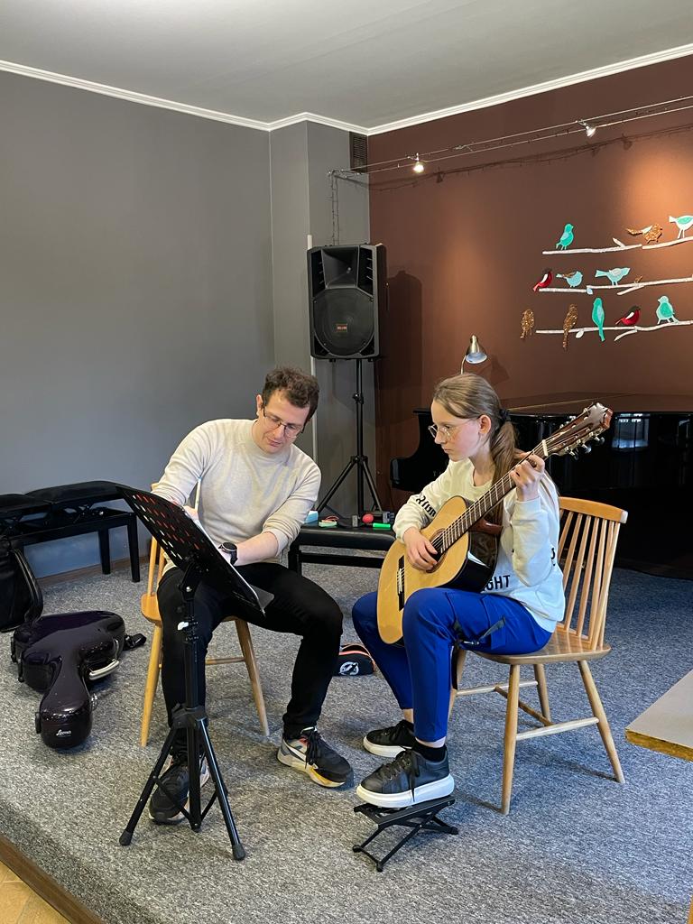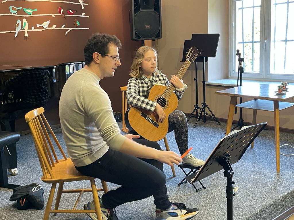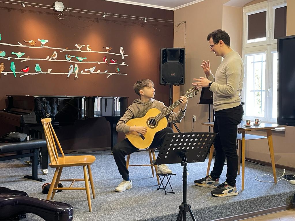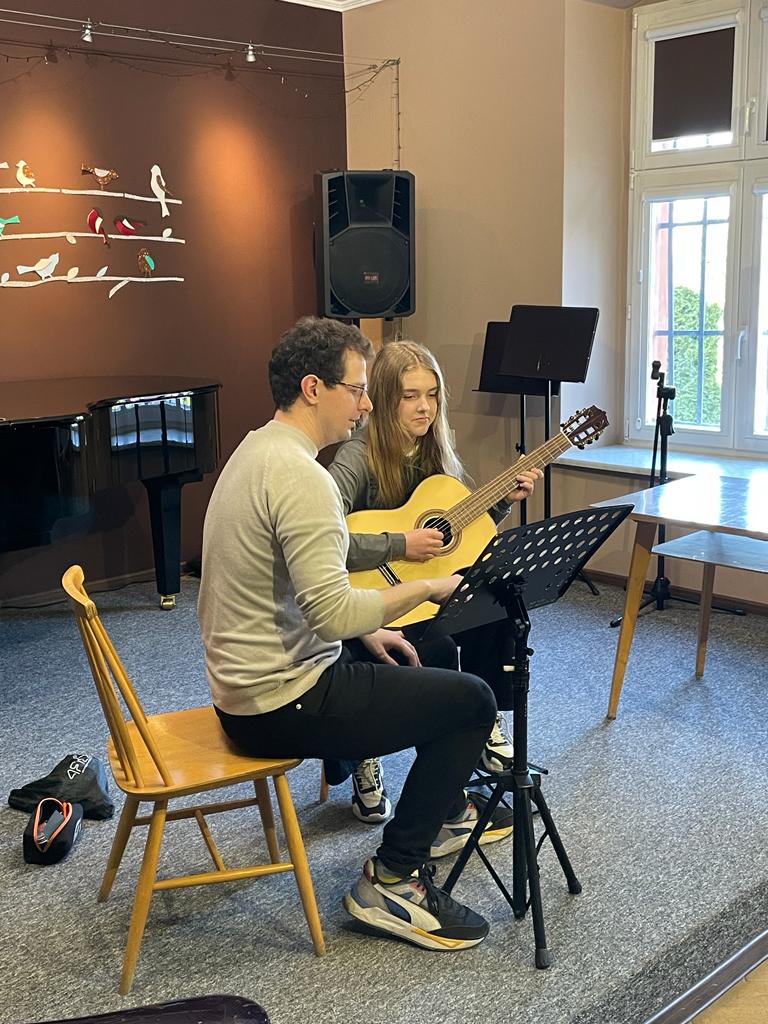 Od 12:30 do 15:30 trwały lekcje mistrzowskie, które znakomicie prowadził p. Marcin Chiliński. Były to bardzo ciekawe zajęcia z wykorzystaniem różnych "gadżetów", które wspomagają ćwiczenie techniki gitarowej. Co dla nas bardzo ważne w lekcjach z mistrzem udział wzięli uczniowie z Tczewa oraz z naszej Pelplińskiej Filii.