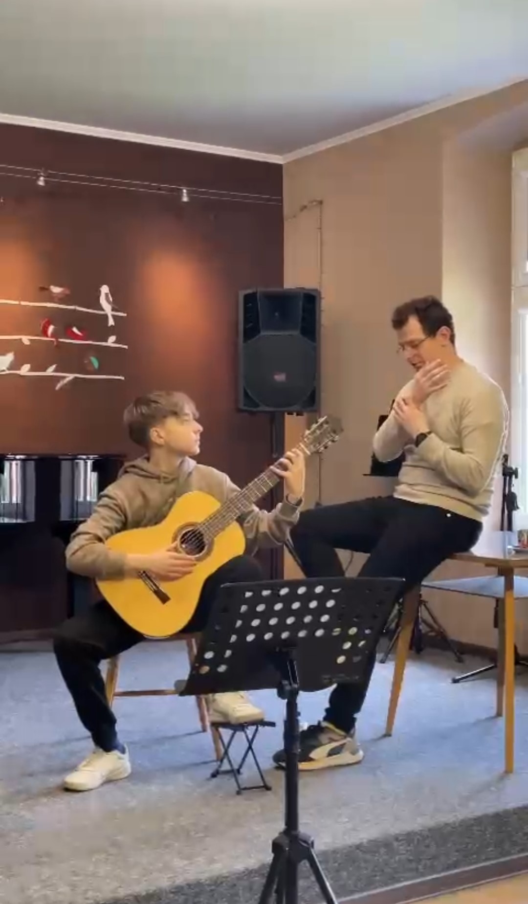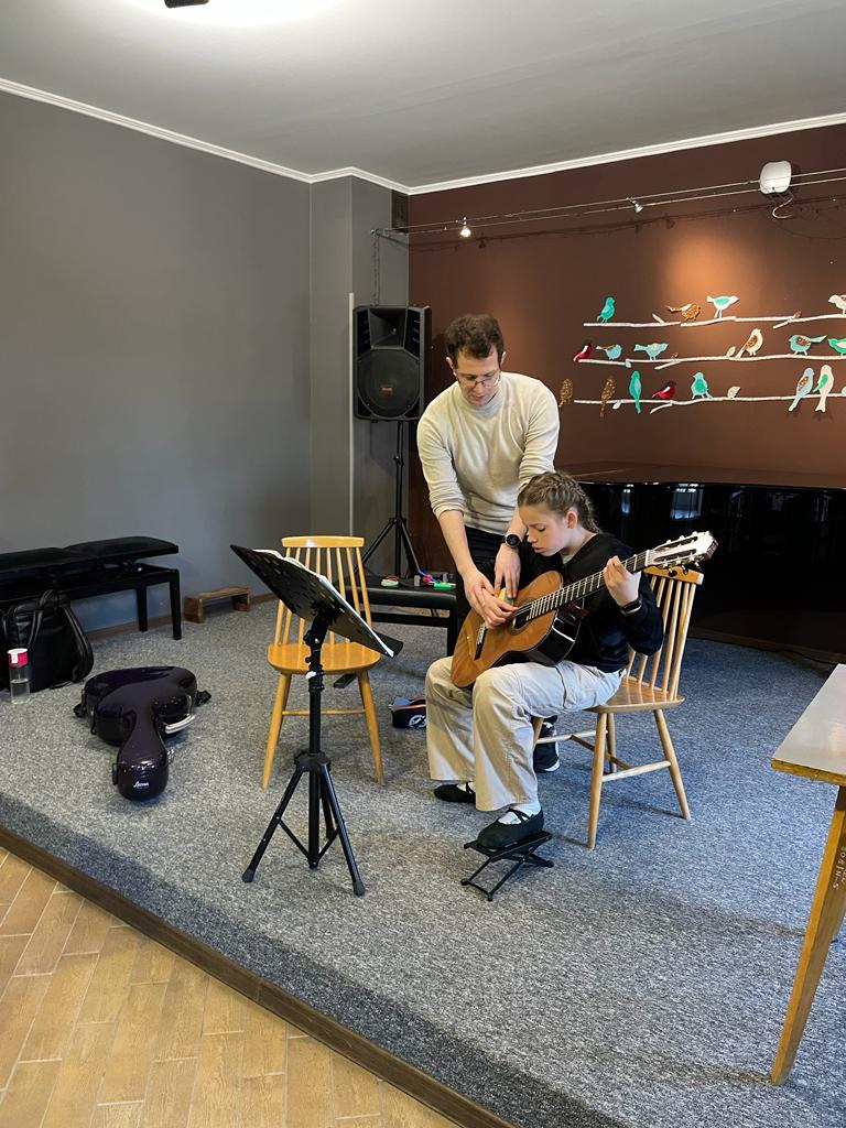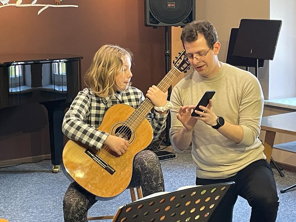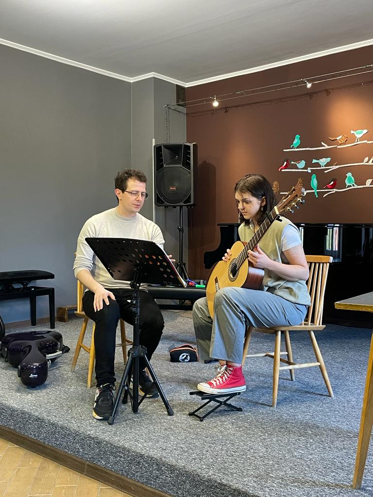 Od 12:30 do 15:30 trwały lekcje mistrzowskie, które znakomicie prowadził p. Marcin Chiliński. Były to bardzo ciekawe zajęcia z wykorzystaniem różnych "gadżetów", które wspomagają ćwiczenie techniki gitarowej. Co dla nas bardzo ważne w lekcjach z mistrzem udział wzięli uczniowie z Tczewa oraz z naszej Pelplińskiej Filii.