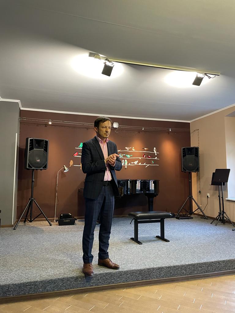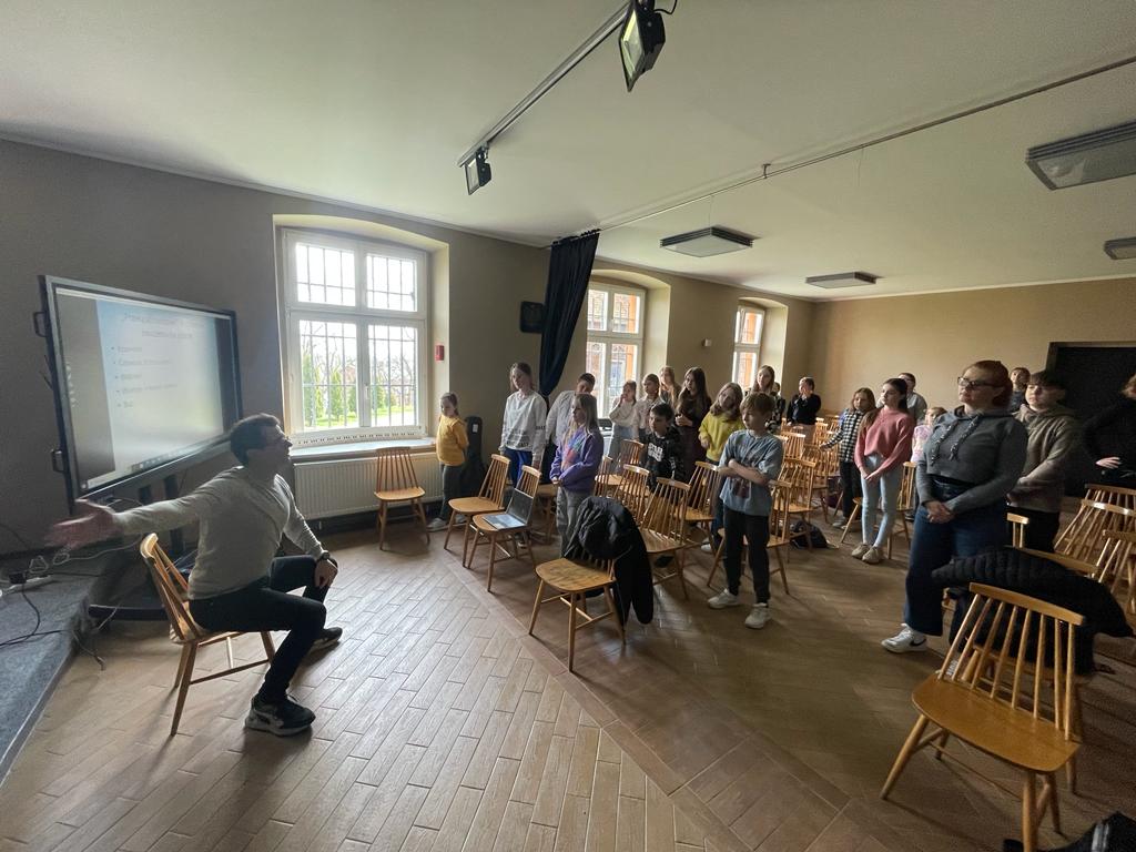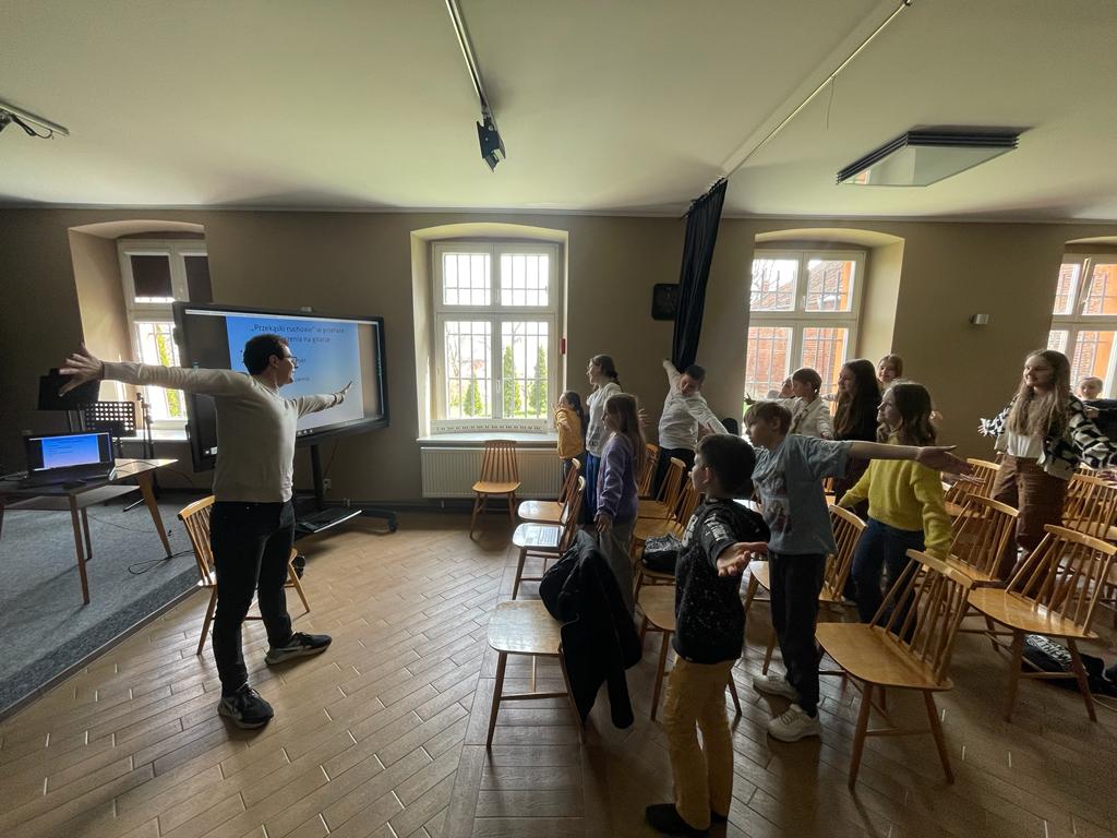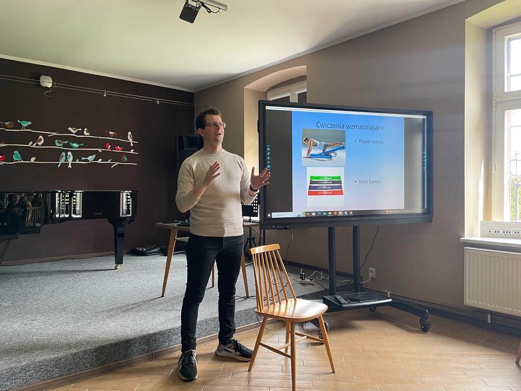 O godzinie 11:00 rozpoczęliśmy wykładem - a właściwie my (uczniowie i nauczyciele) byliśmy słuchaczami i uczestnikami wykładu-warsztatów, które poprowadził mgr Marcin Chiliński z Akademii Muzycznej im. Feliksa Nowowiejskiego w Bydgoszczy. Podczas warsztatów nauczycliśmy się wielu sposobów na szybką "regenerację zmęczonych rąk" oraz tego jak poprawić sprawność i wytrzymałość naszych mięśni.