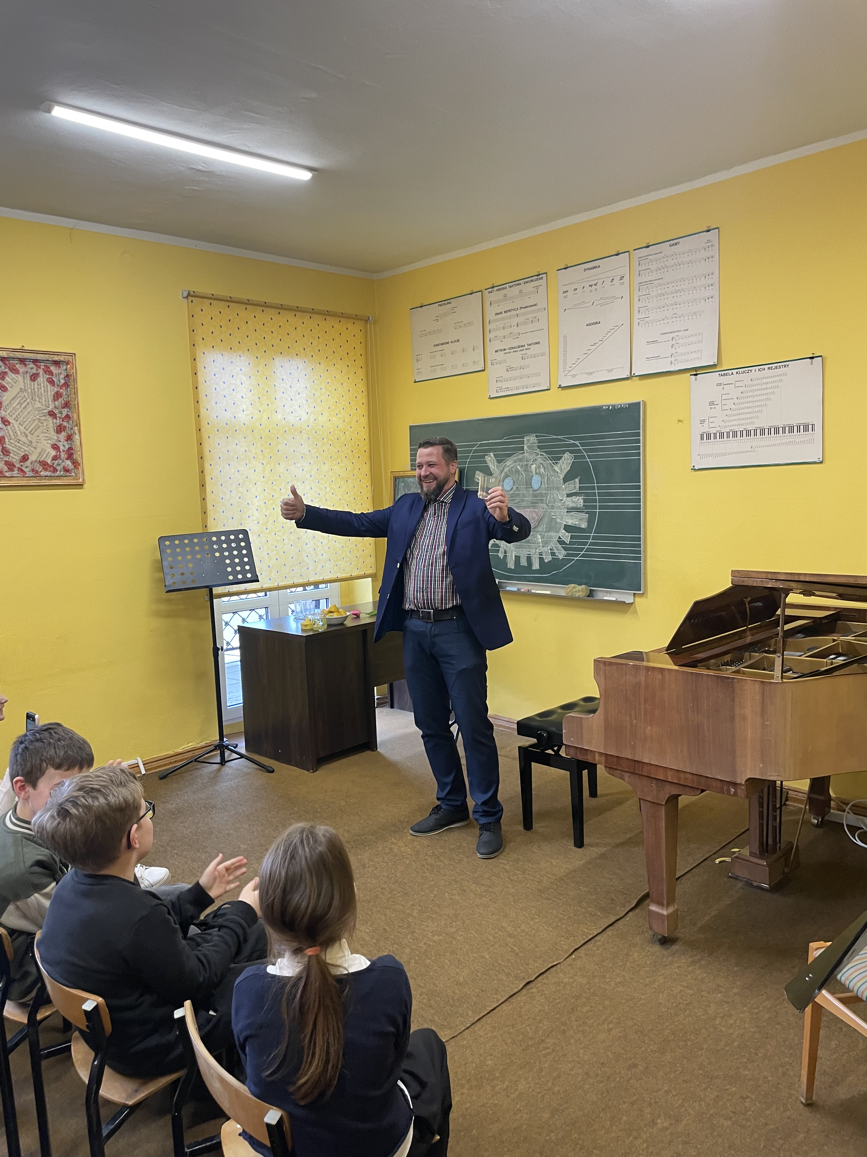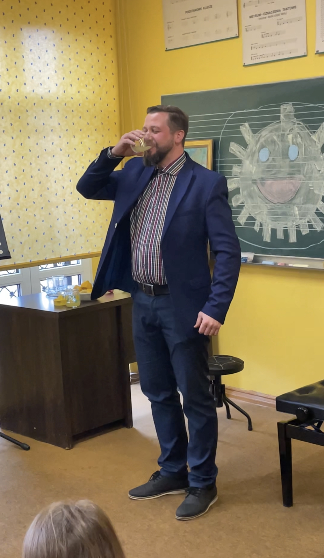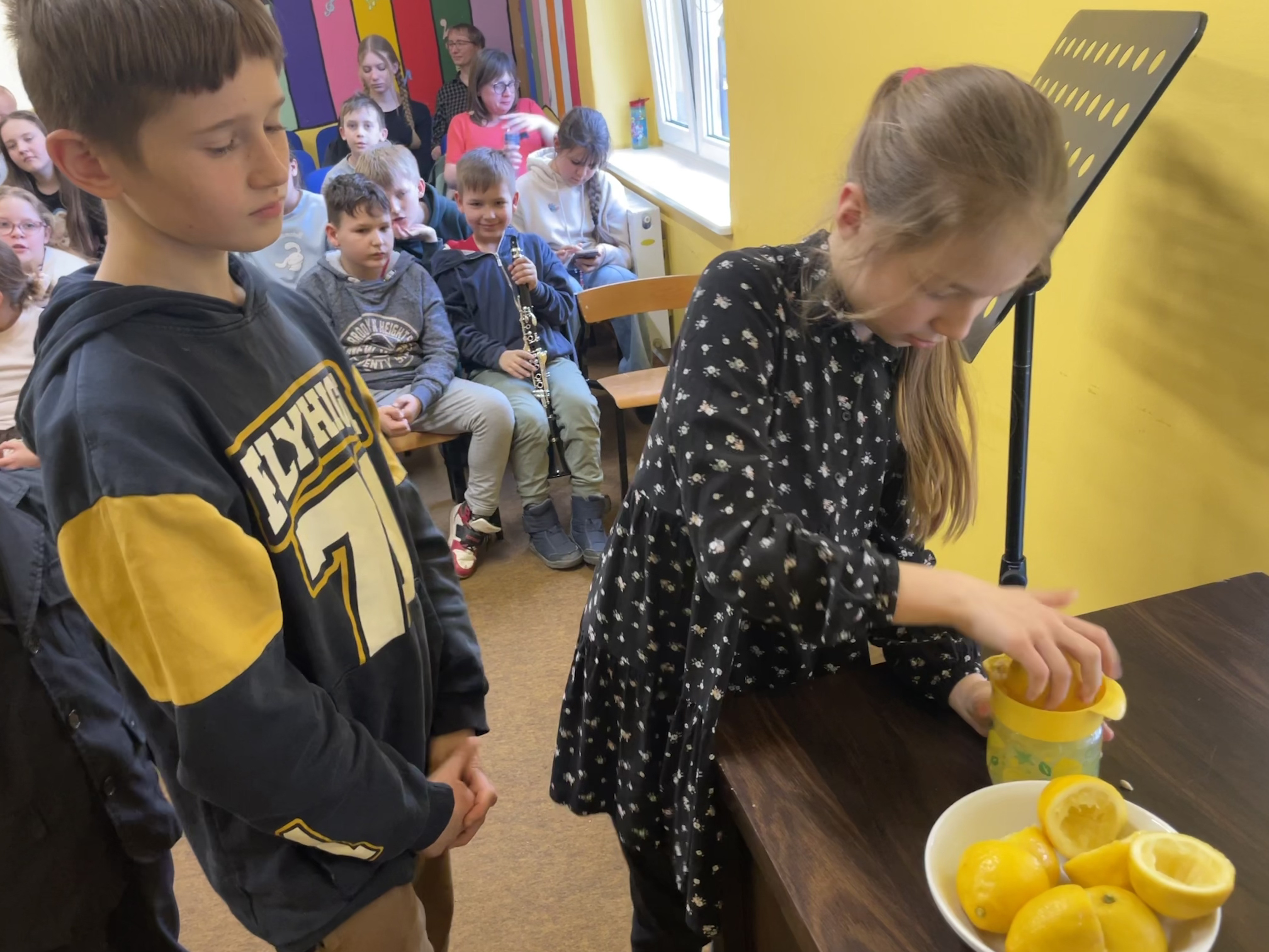 Na scenie wystąpili zarówno uczniowie, jak i nauczyciele naszej szkoły 🎻🎹. Pomiędzy kolejnymi utworami nie zabrakło także elementu zabawy – dzieci wyciskały sok z cytryny 🍋, który następnie dzielnie wypił pan kierownik Filii Grzegorz Kwaśny 😄.