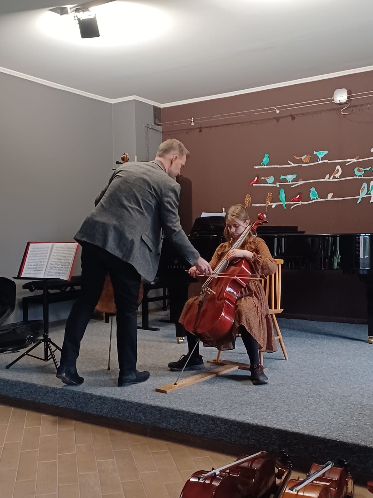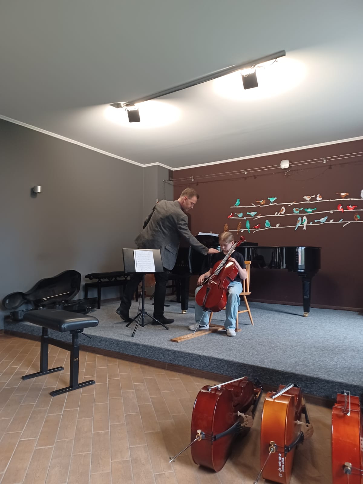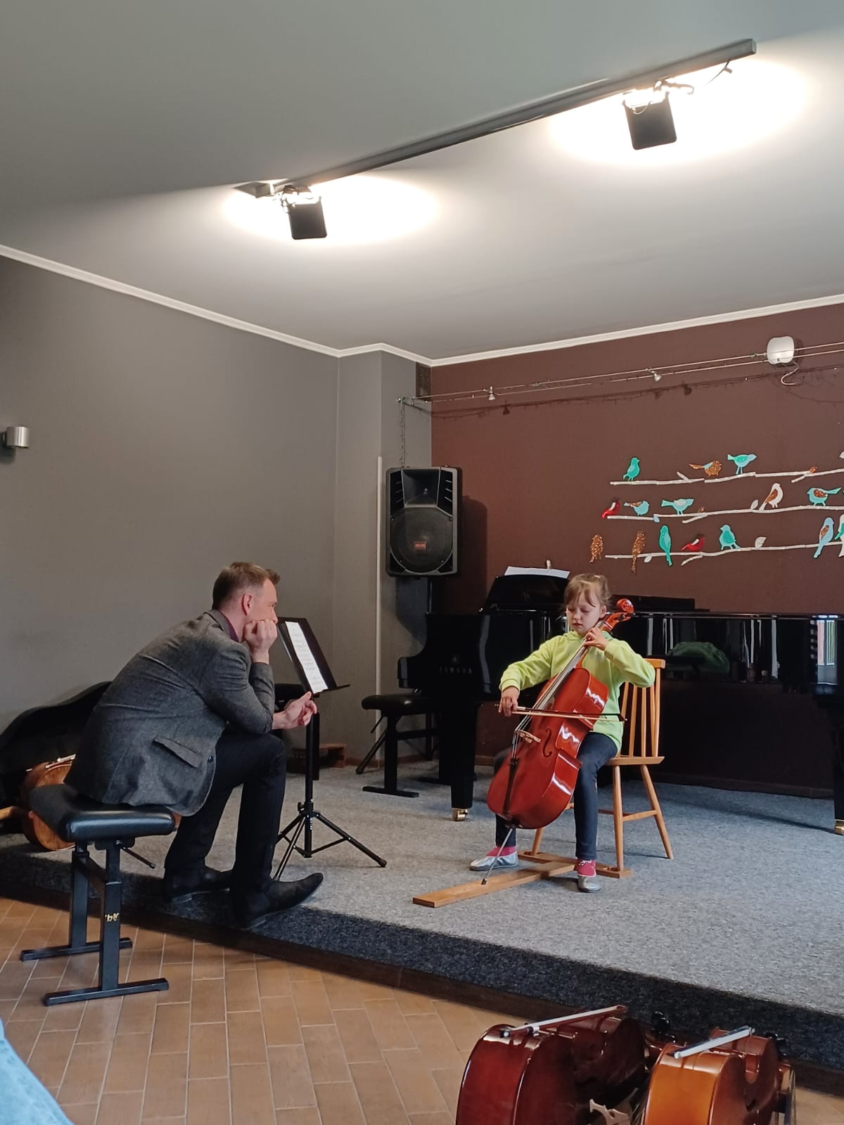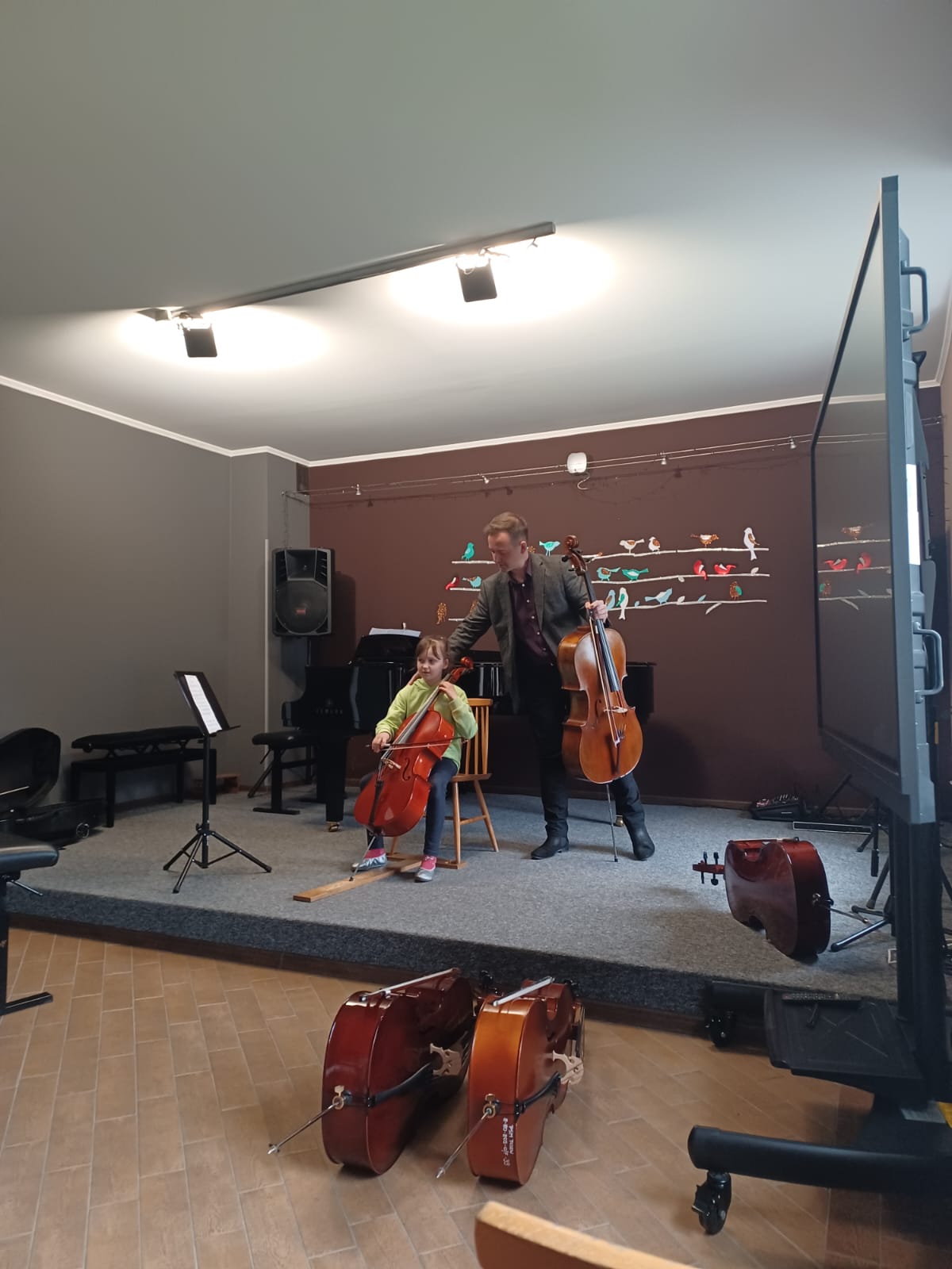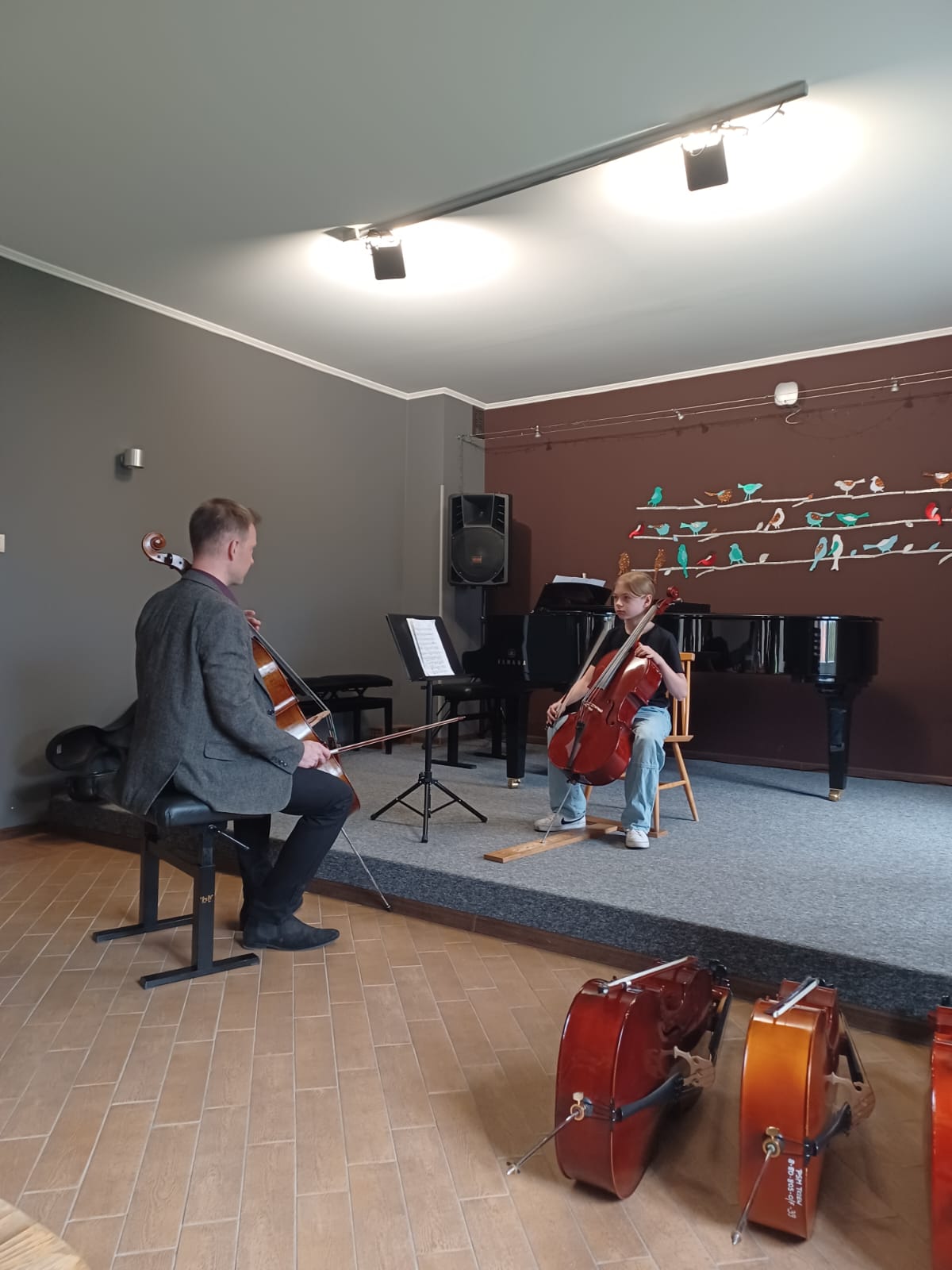 27 kwietnia 2023 r. w naszej szkole swoje święto mieli wiolonczeliści. Najpierw doskonalili swój warsztat podczas lekcji mistrzowskich z dr hab. Błażejem Golińskim i mgr Jakubem Grzelachowskim. Podczas lekcji z profesorami usłyszeli bardzo dużo cennych wskazówek, które pozytywnie wpłyną na grę i ćwiczenie na wiolonczeli. Następnie mogliśmy wysłuchać wspaniałego koncertu w mistrzowskim wykonaniu. Specjalnie dla nas na scenie wystąpili wiolonczeliści: dr hab. Błażej Goliński oraz mgr Jakub Grzelachowski oraz pianista - mgr Filip Grzelachowski. Dziękujemy za wspaniały koncert oraz doskonałe lekcje mistrzowskie.