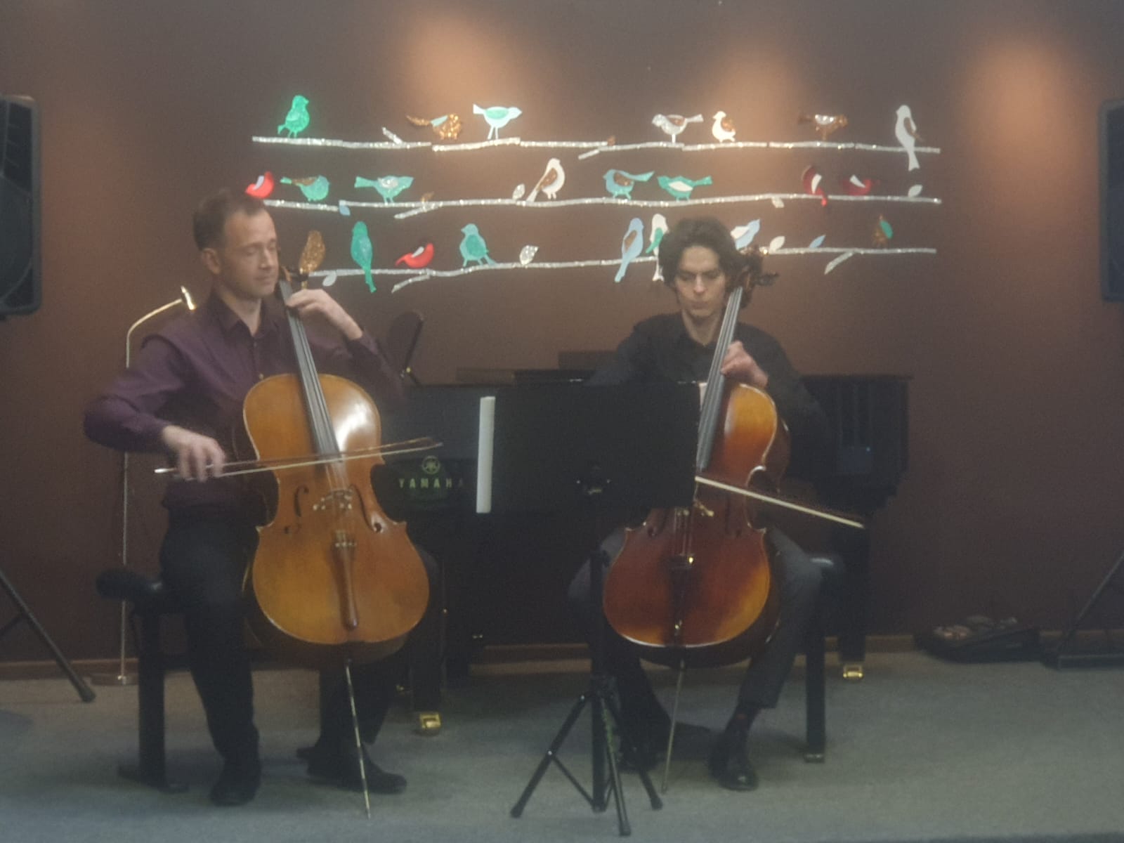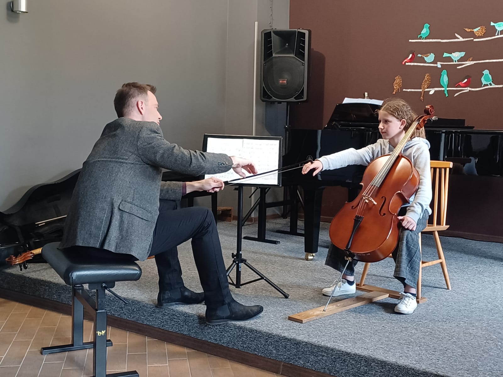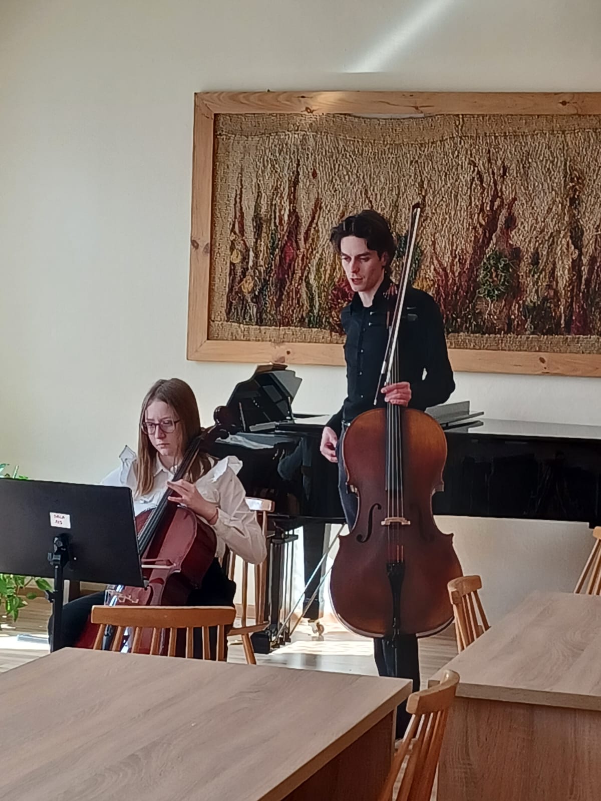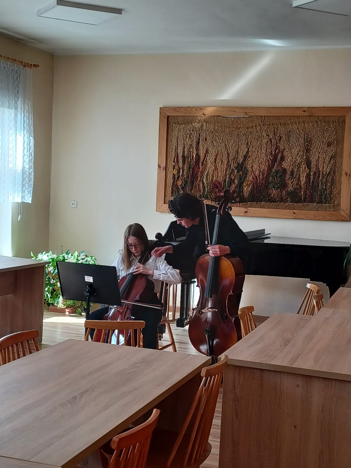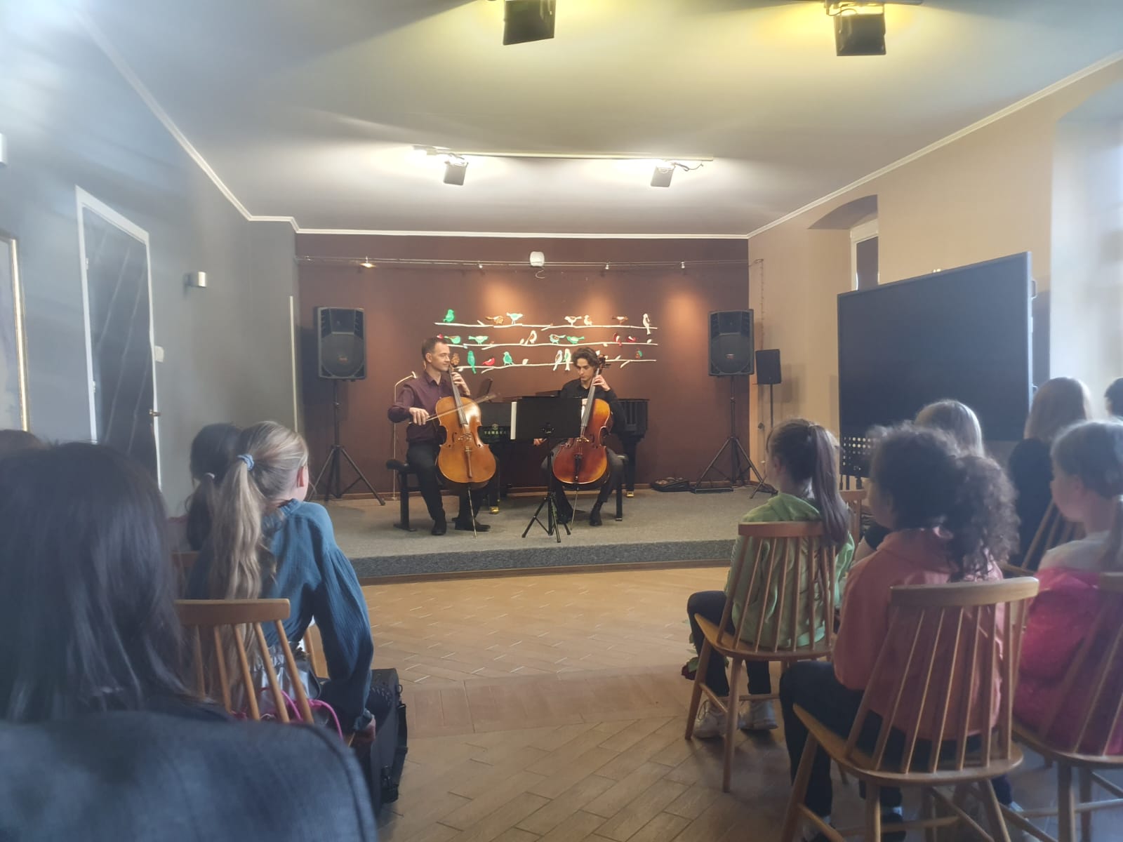 27 kwietnia 2023 r. w naszej szkole swoje święto mieli wiolonczeliści. Najpierw doskonalili swój warsztat podczas lekcji mistrzowskich z dr hab. Błażejem Golińskim i mgr Jakubem Grzelachowskim. Podczas lekcji z profesorami usłyszeli bardzo dużo cennych wskazówek, które pozytywnie wpłyną na grę i ćwiczenie na wiolonczeli. Następnie mogliśmy wysłuchać wspaniałego koncertu w mistrzowskim wykonaniu. Specjalnie dla nas na scenie wystąpili wiolonczeliści: dr hab. Błażej Goliński oraz mgr Jakub Grzelachowski oraz pianista - mgr Filip Grzelachowski. Dziękujemy za wspaniały koncert oraz doskonałe lekcje mistrzowskie.