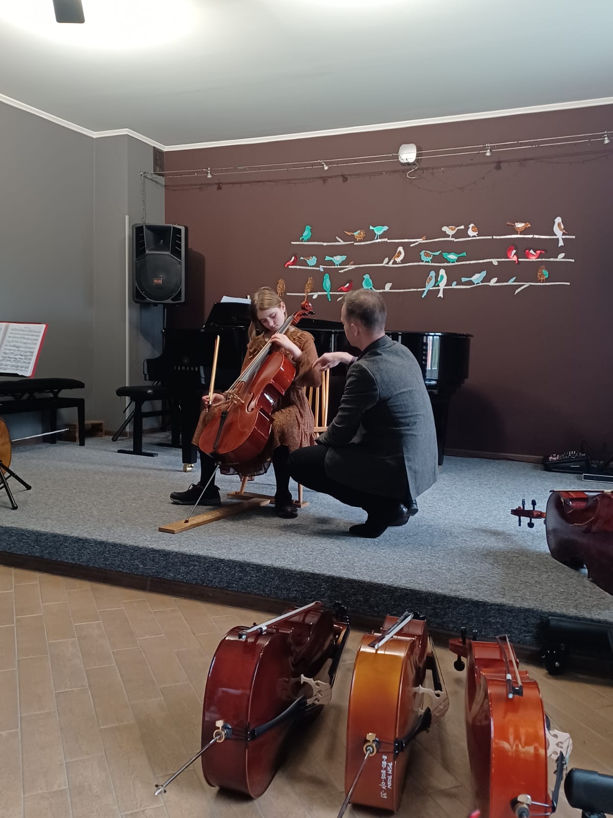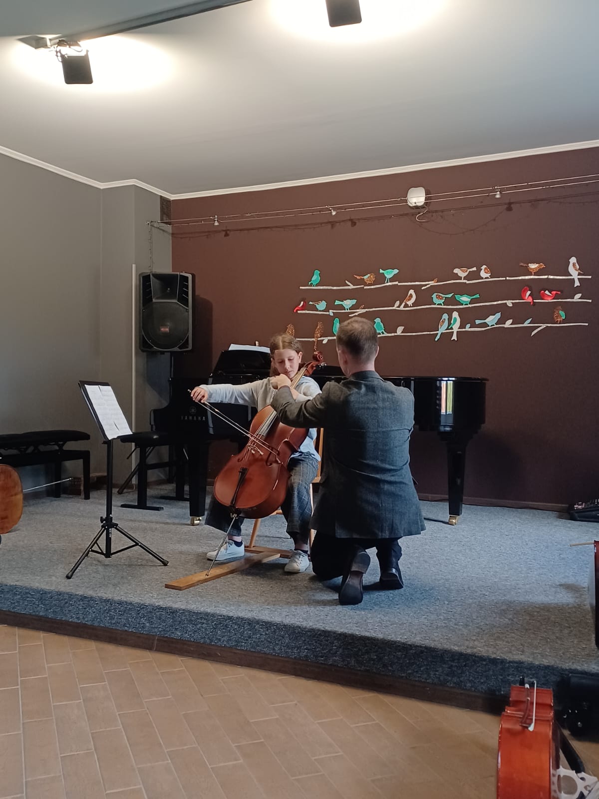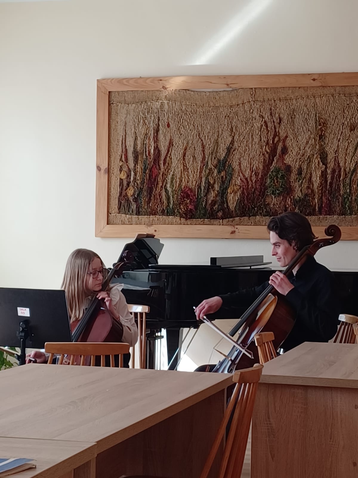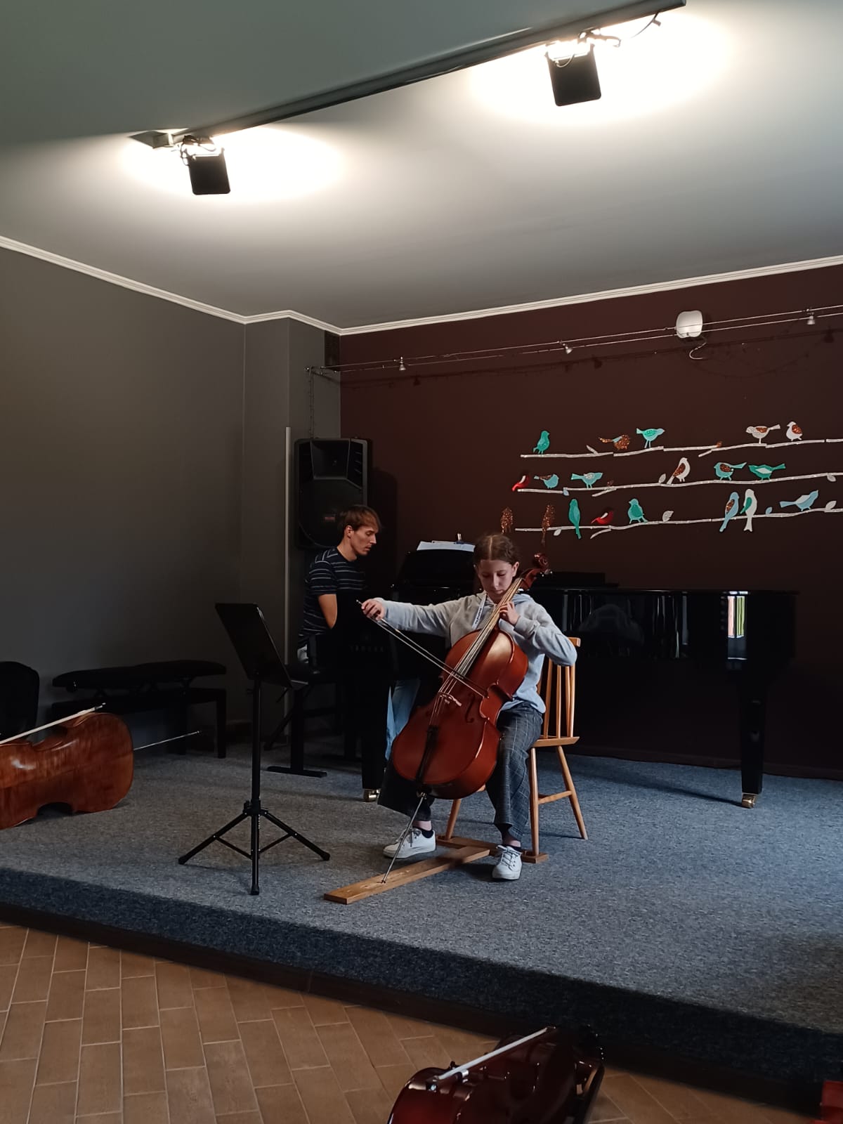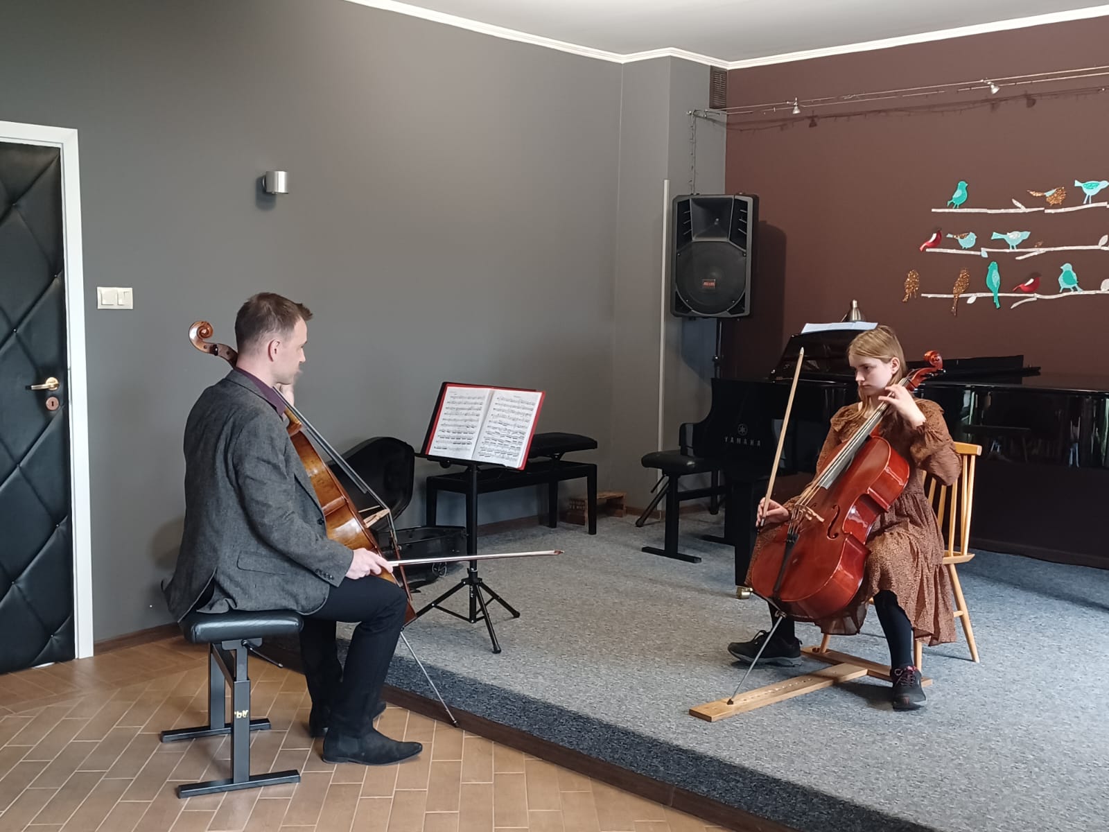 27 kwietnia 2023 r. w naszej szkole swoje święto mieli wiolonczeliści. Najpierw doskonalili swój warsztat podczas lekcji mistrzowskich z dr hab. Błażejem Golińskim i mgr Jakubem Grzelachowskim. Podczas lekcji z profesorami usłyszeli bardzo dużo cennych wskazówek, które pozytywnie wpłyną na grę i ćwiczenie na wiolonczeli. Następnie mogliśmy wysłuchać wspaniałego koncertu w mistrzowskim wykonaniu. Specjalnie dla nas na scenie wystąpili wiolonczeliści: dr hab. Błażej Goliński oraz mgr Jakub Grzelachowski oraz pianista - mgr Filip Grzelachowski. Dziękujemy za wspaniały koncert oraz doskonałe lekcje mistrzowskie.