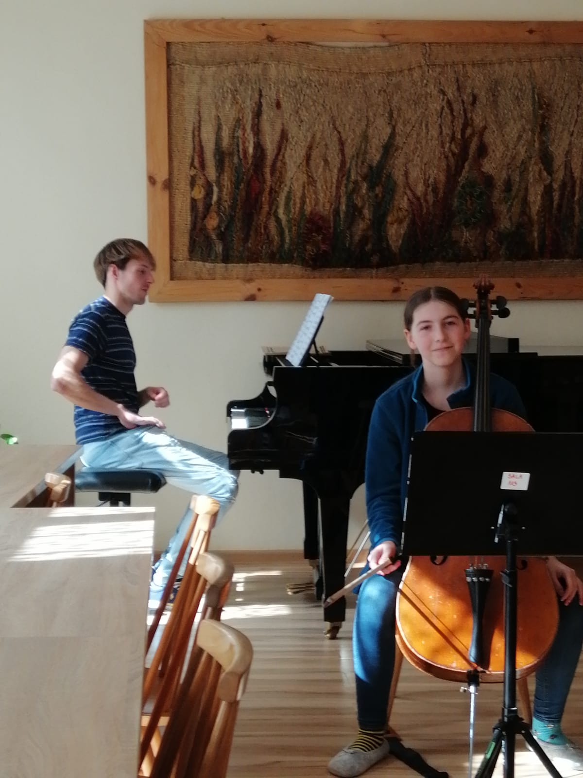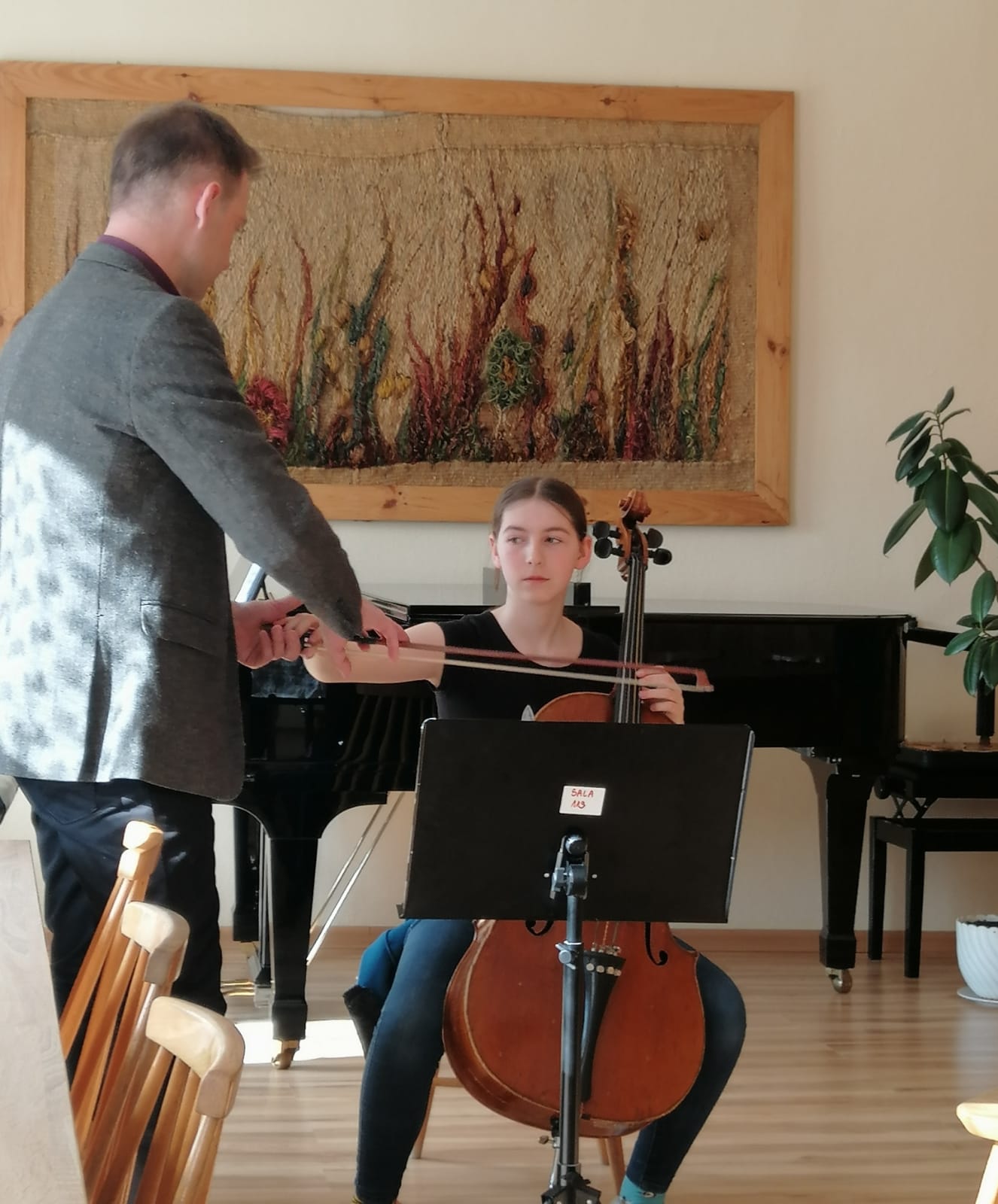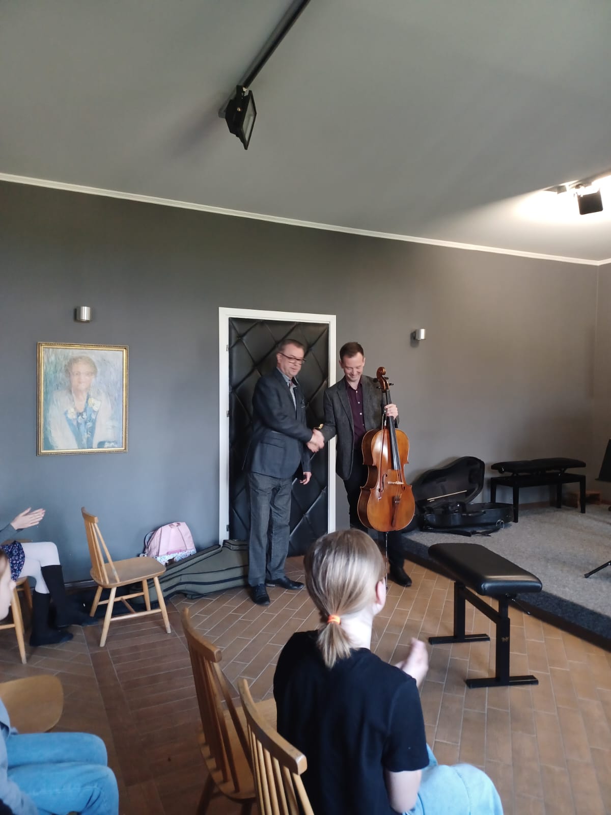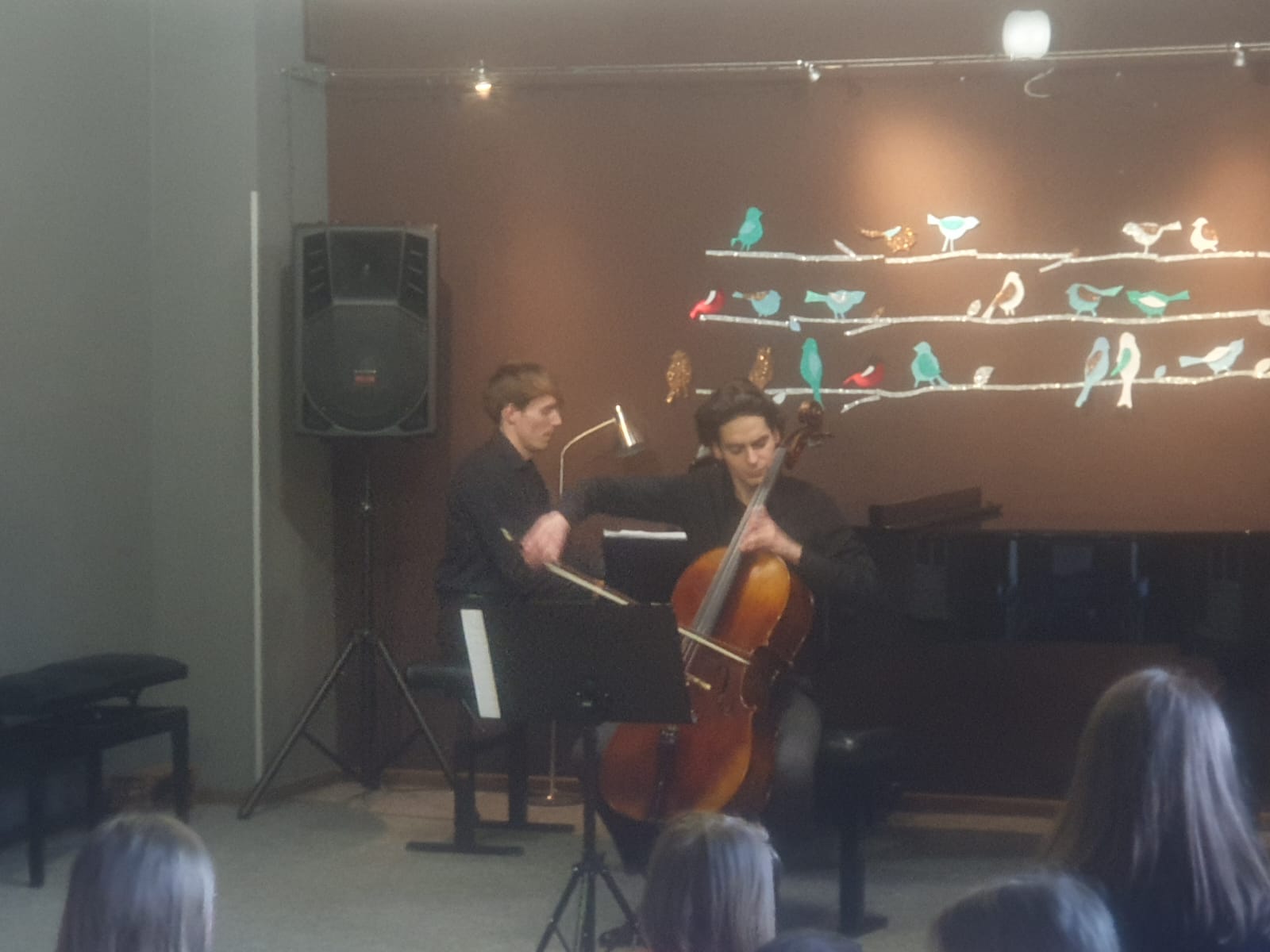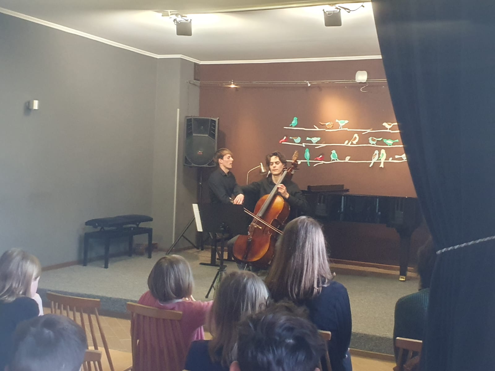 27 kwietnia 2023 r. w naszej szkole swoje święto mieli wiolonczeliści. Najpierw doskonalili swój warsztat podczas lekcji mistrzowskich z dr hab. Błażejem Golińskim i mgr Jakubem Grzelachowskim. Podczas lekcji z profesorami usłyszeli bardzo dużo cennych wskazówek, które pozytywnie wpłyną na grę i ćwiczenie na wiolonczeli. Następnie mogliśmy wysłuchać wspaniałego koncertu w mistrzowskim wykonaniu. Specjalnie dla nas na scenie wystąpili wiolonczeliści: dr hab. Błażej Goliński oraz mgr Jakub Grzelachowski oraz pianista - mgr Filip Grzelachowski. Dziękujemy za wspaniały koncert oraz doskonałe lekcje mistrzowskie.