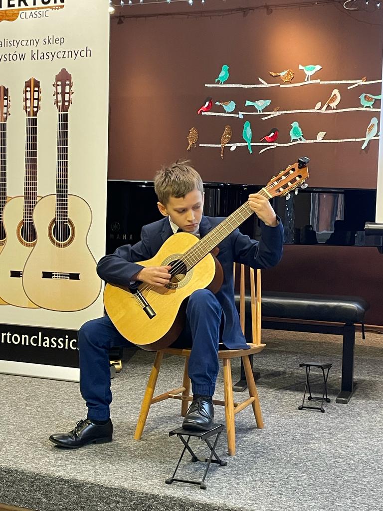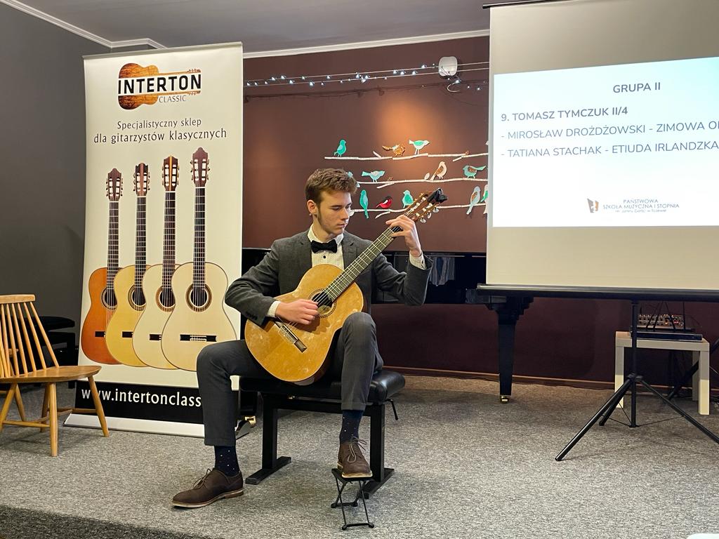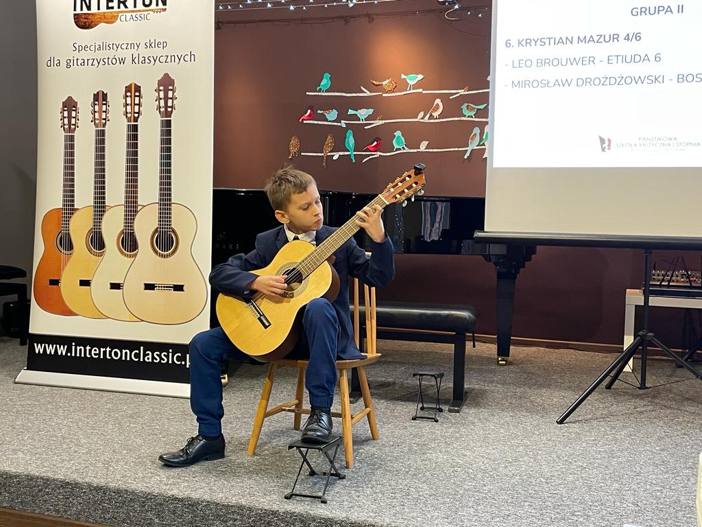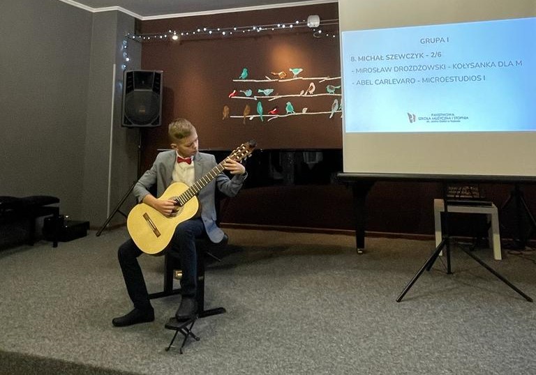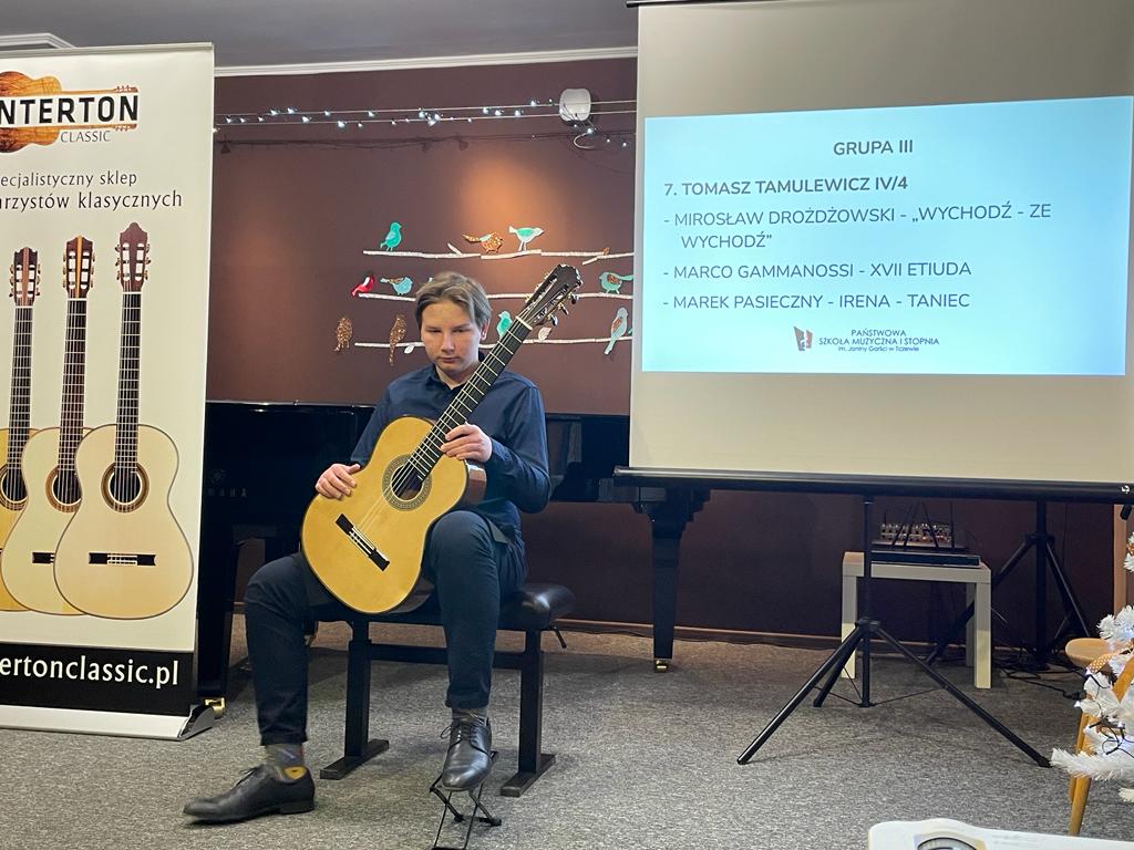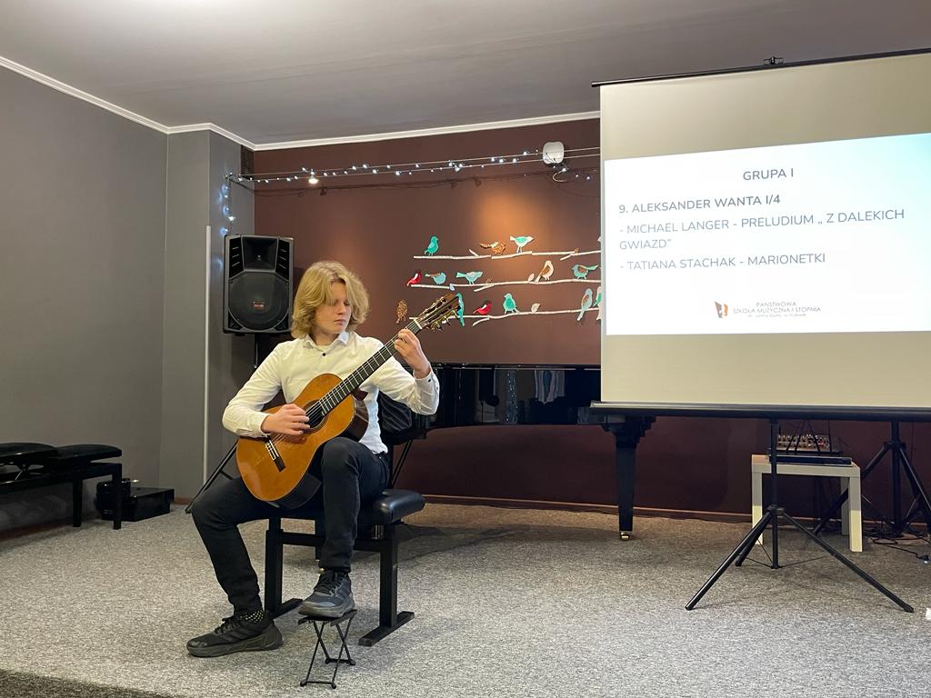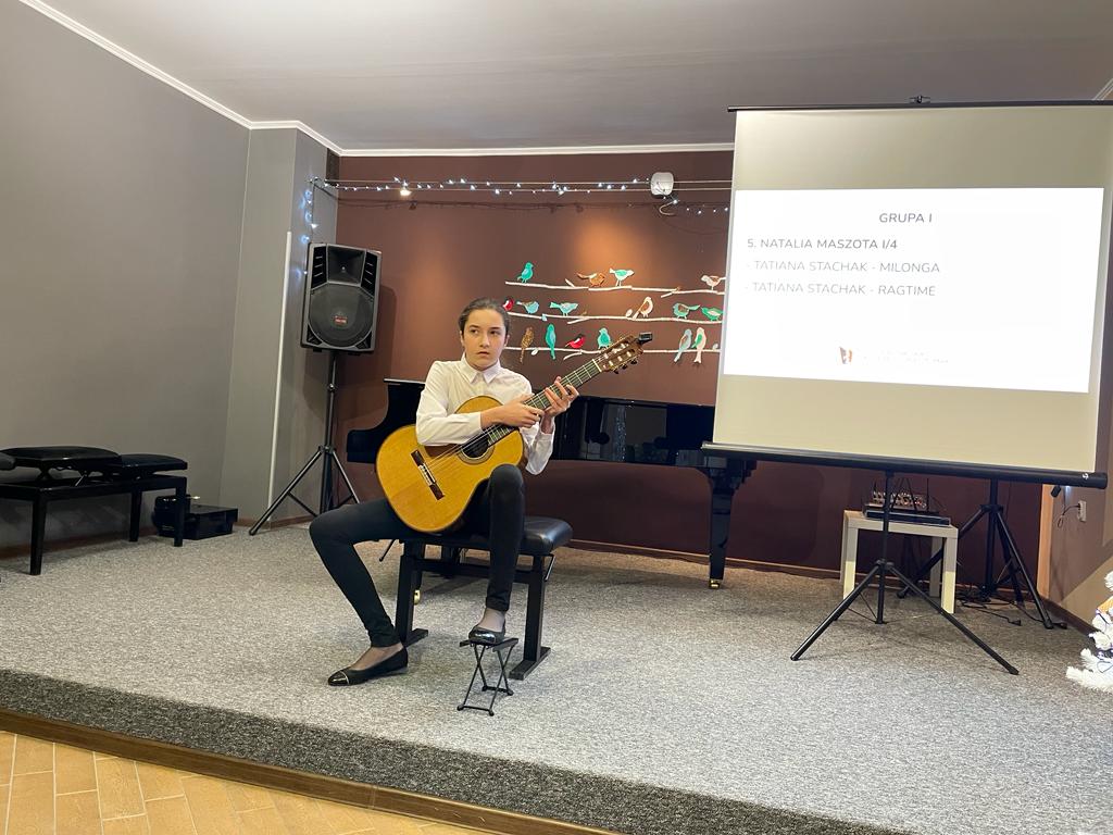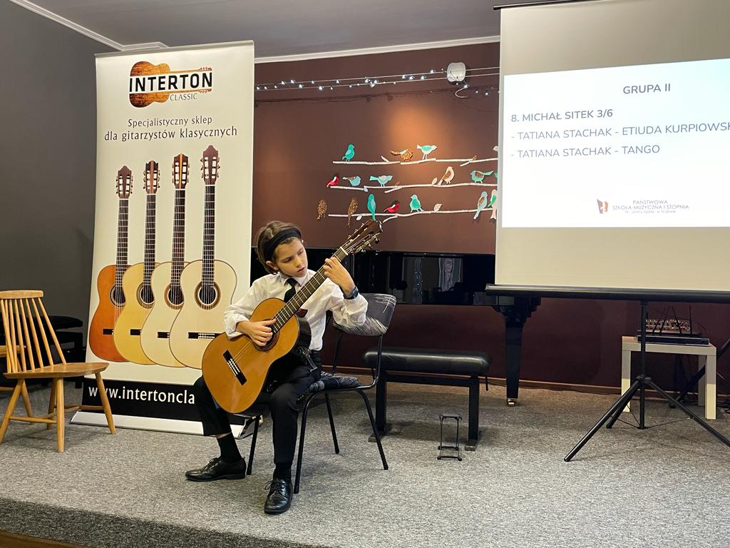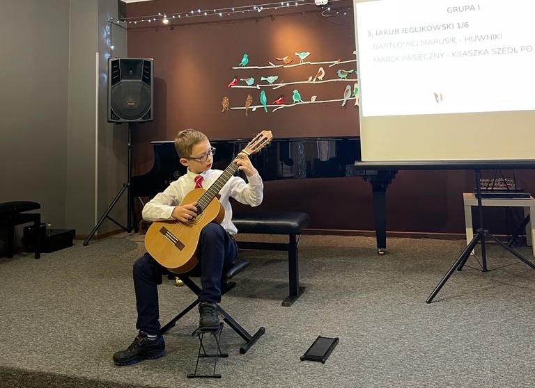 1 grudnia 2022 r. w naszej szkole odbył się VI Festiwal Polskiej Muzyki Gitarowej "Współczesna muzyka gitarowa". W przesłuchaniach konkursowych w 3 kategoriach wiekowych wzięło udział 25 uczniów, w tym trzech reprezentantów naszej szkoły: Julia Kajzer kl. 2/6 i Maja Kaczyńska kl. 3/6 - uczennice p. Anny Bukowskiej oraz Aleksander Wanta kl. 1/4 - uczeń p. Antoniego Jędrzejewskiego. Uczestników oceniało jury w składzie: prof. Mirosław Drożdżowski - przewodniczący jury, dr Monika Dżuła-Radkiewicz, mgr Magdalena Jenda-Kujawa. Pełne wyniki znajdują się w zakładce festiwalu. A nasz uczeń - Aleksander Wanta - otrzymał WYRÓŻNIENIE. Gratulujemy!!