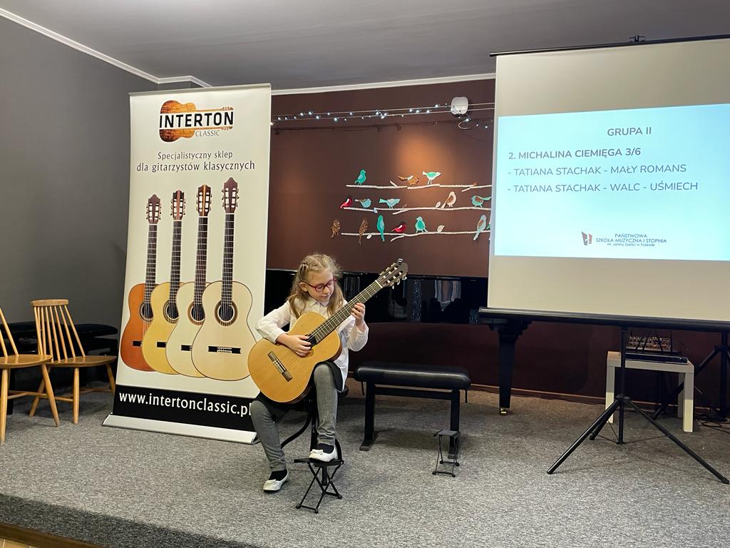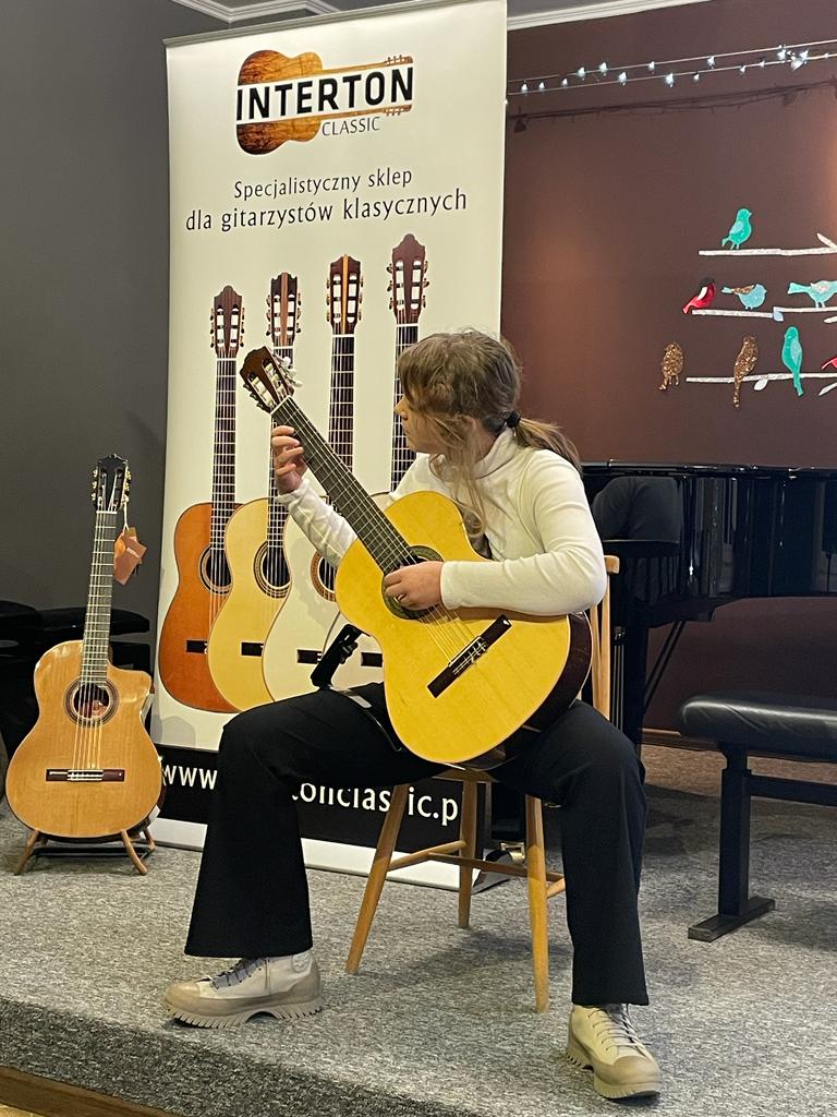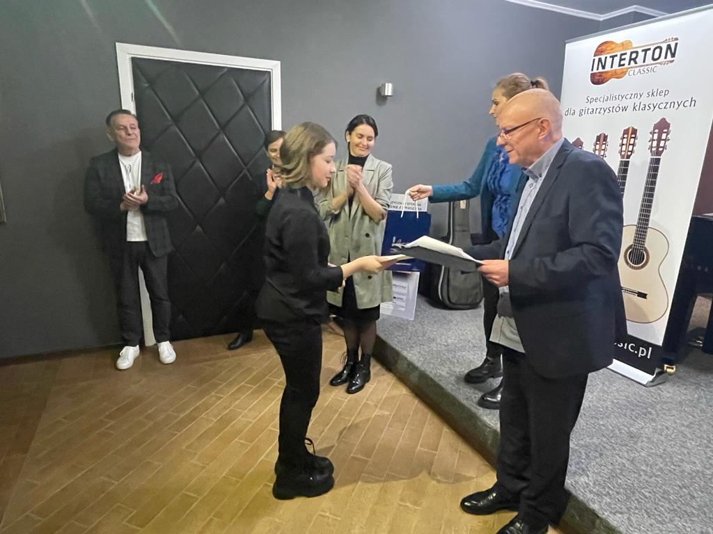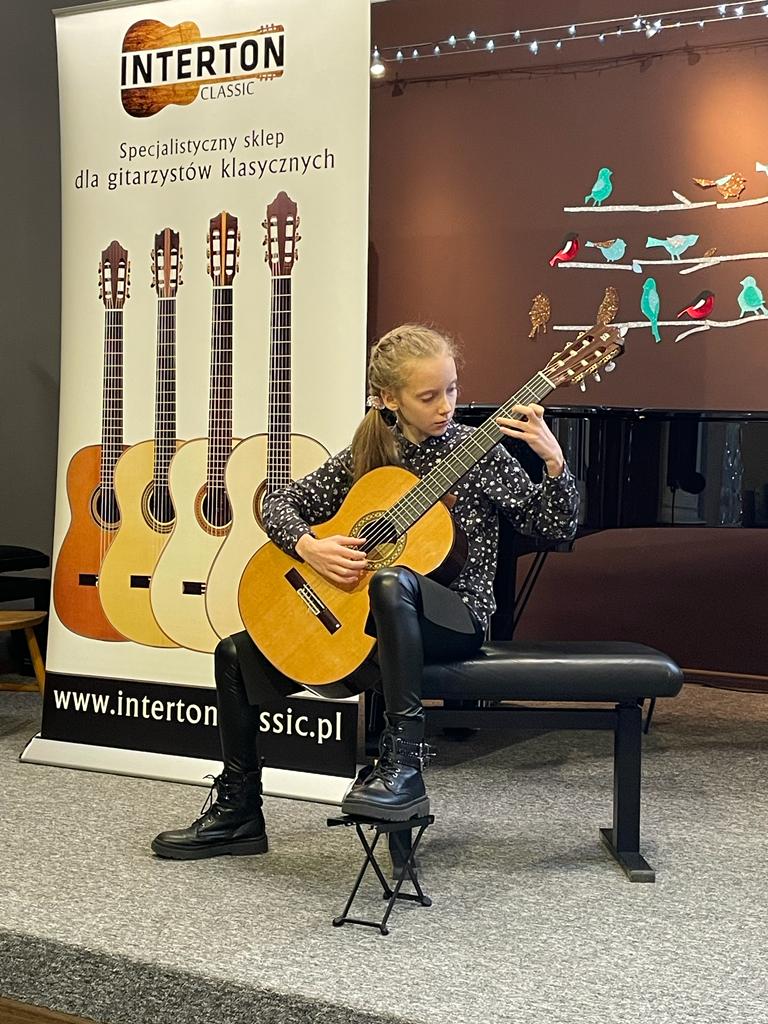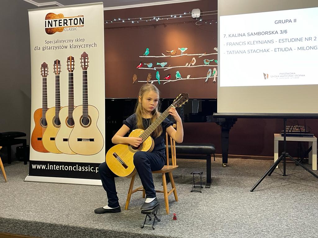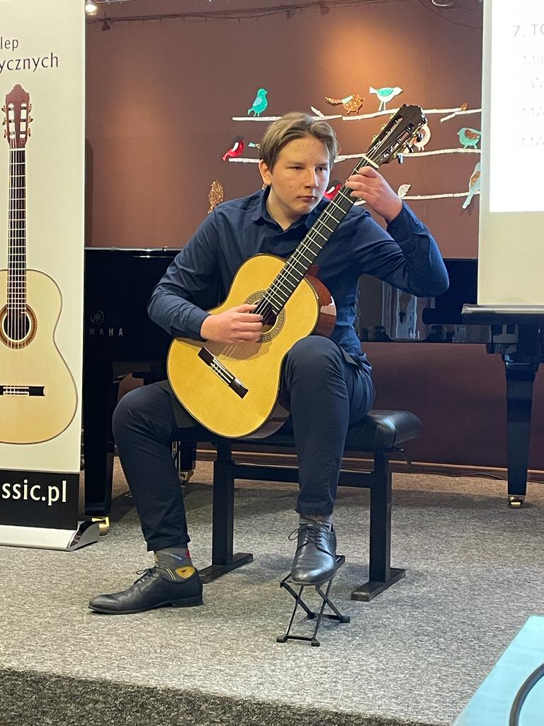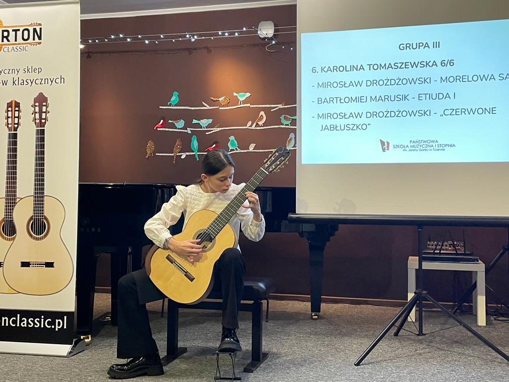 1 grudnia 2022 r. w naszej szkole odbył się VI Festiwal Polskiej Muzyki Gitarowej "Współczesna muzyka gitarowa". W przesłuchaniach konkursowych w 3 kategoriach wiekowych wzięło udział 25 uczniów, w tym trzech reprezentantów naszej szkoły: Julia Kajzer kl. 2/6 i Maja Kaczyńska kl. 3/6 - uczennice p. Anny Bukowskiej oraz Aleksander Wanta kl. 1/4 - uczeń p. Antoniego Jędrzejewskiego. Uczestników oceniało jury w składzie: prof. Mirosław Drożdżowski - przewodniczący jury, dr Monika Dżuła-Radkiewicz, mgr Magdalena Jenda-Kujawa. Pełne wyniki znajdują się w zakładce festiwalu. A nasz uczeń - Aleksander Wanta - otrzymał WYRÓŻNIENIE. Gratulujemy!!