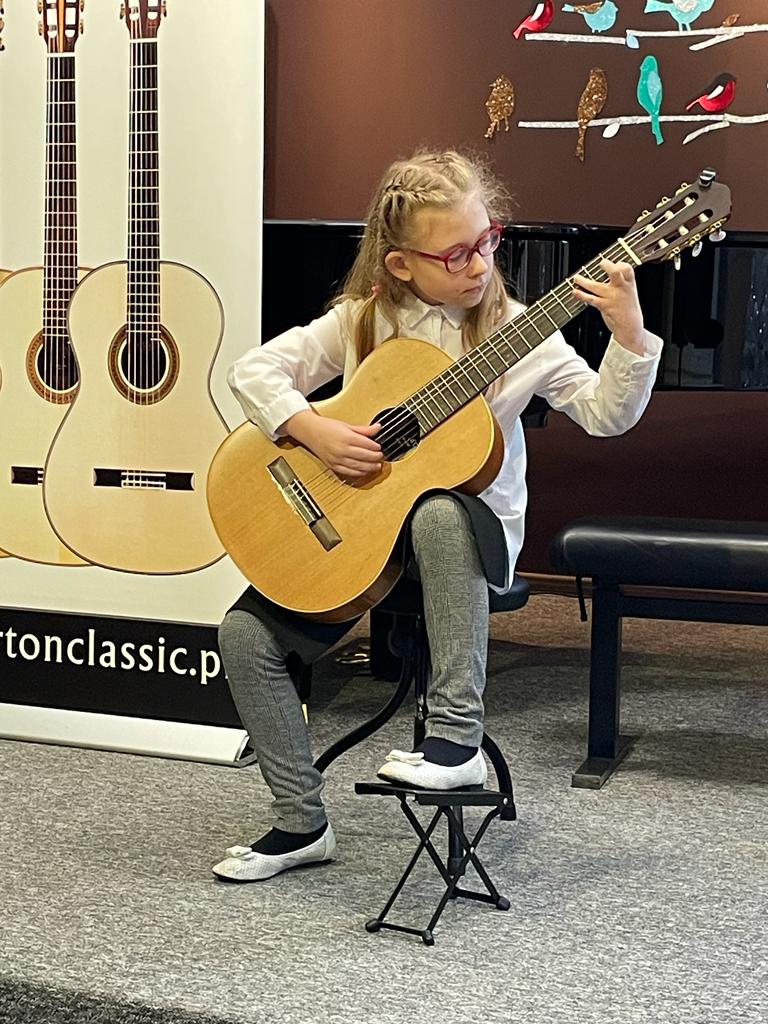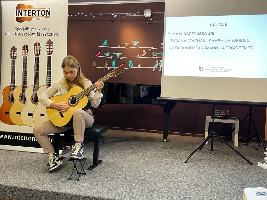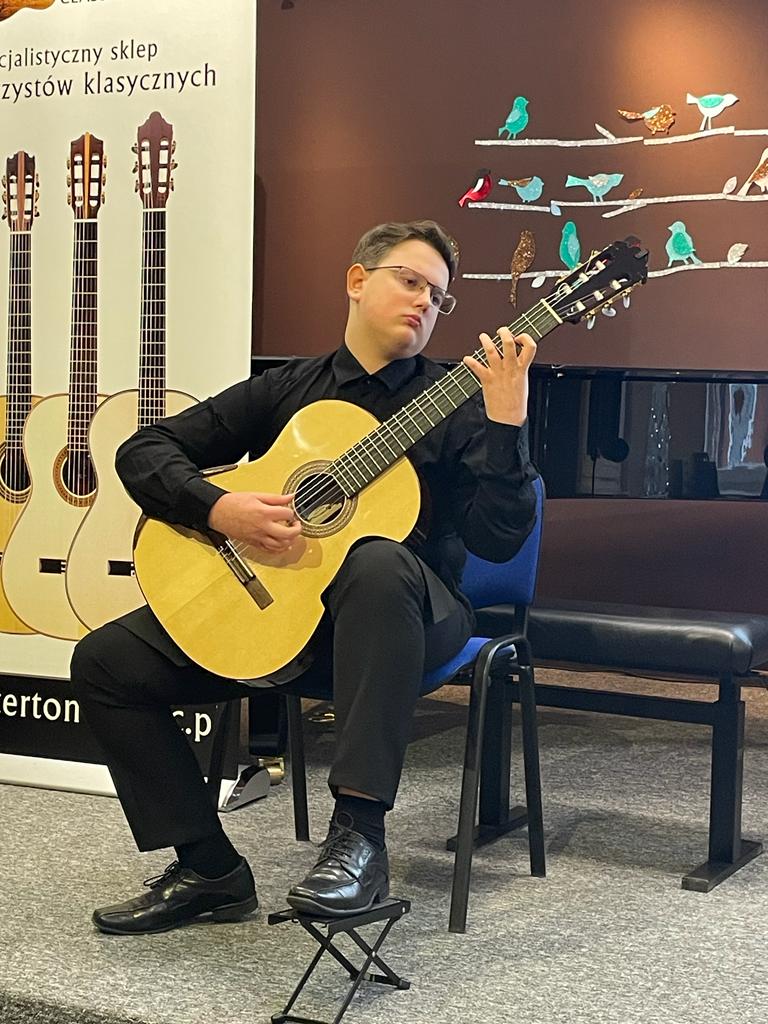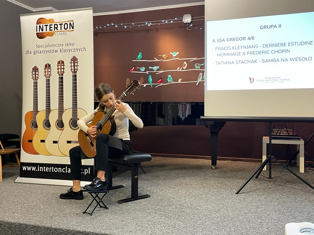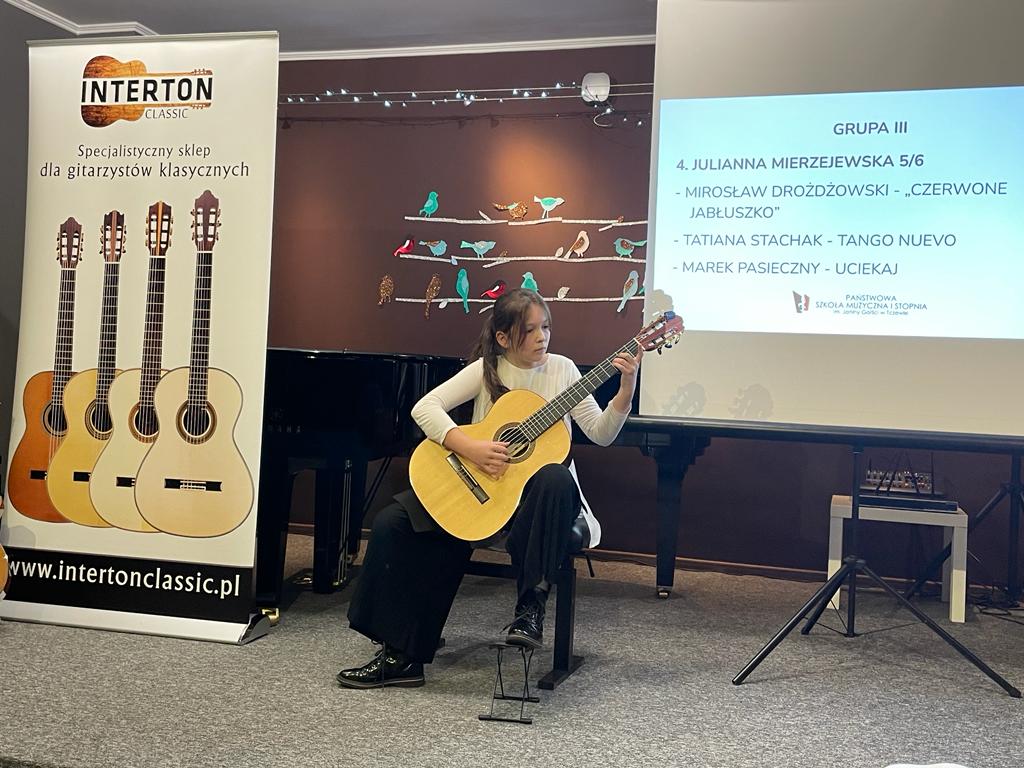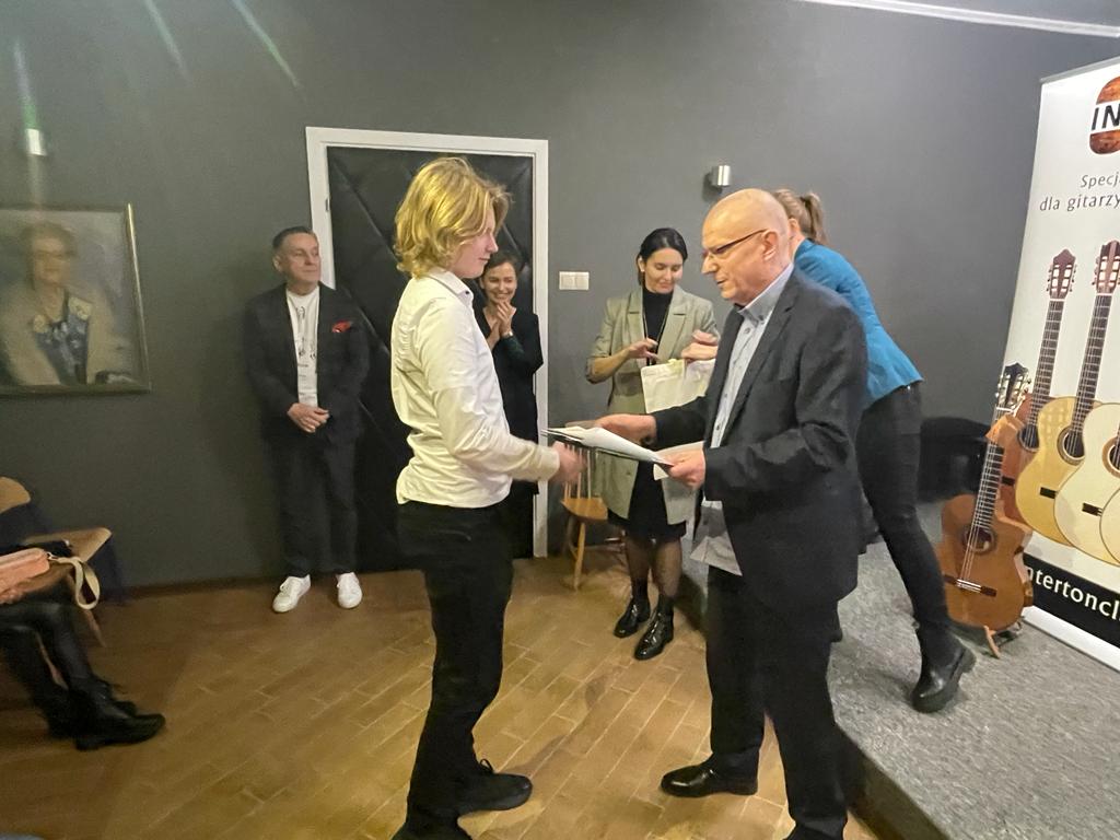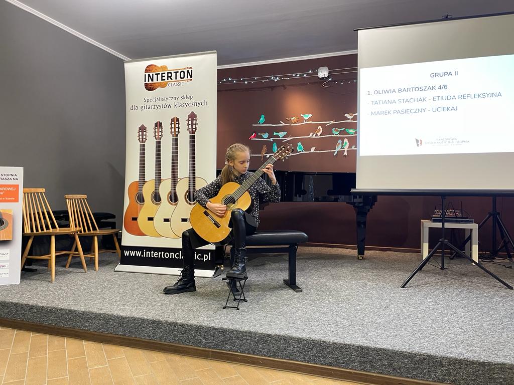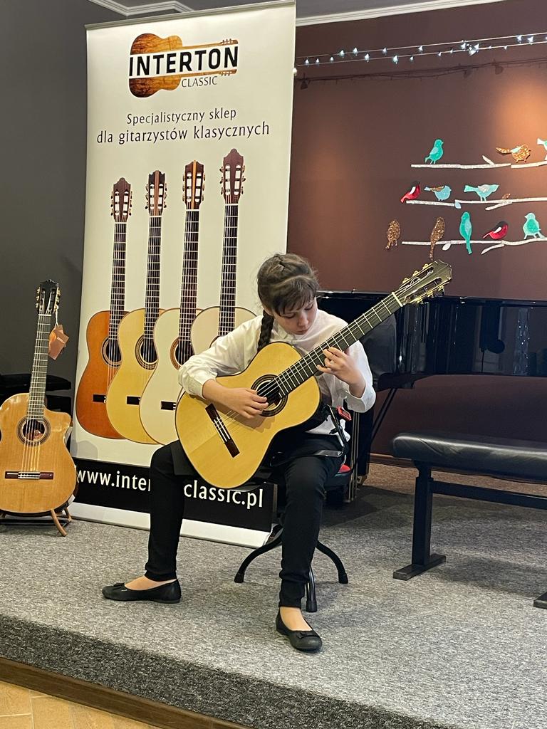1 grudnia 2022 r. w naszej szkole odbył się VI Festiwal Polskiej Muzyki Gitarowej "Współczesna muzyka gitarowa". W przesłuchaniach konkursowych w 3 kategoriach wiekowych wzięło udział 25 uczniów, w tym trzech reprezentantów naszej szkoły: Julia Kajzer kl. 2/6 i Maja Kaczyńska kl. 3/6 - uczennice p. Anny Bukowskiej oraz Aleksander Wanta kl. 1/4 - uczeń p. Antoniego Jędrzejewskiego. Uczestników oceniało jury w składzie: prof. Mirosław Drożdżowski - przewodniczący jury, dr Monika Dżuła-Radkiewicz, mgr Magdalena Jenda-Kujawa. Pełne wyniki znajdują się w zakładce festiwalu. A nasz uczeń - Aleksander Wanta - otrzymał WYRÓŻNIENIE. Gratulujemy!!