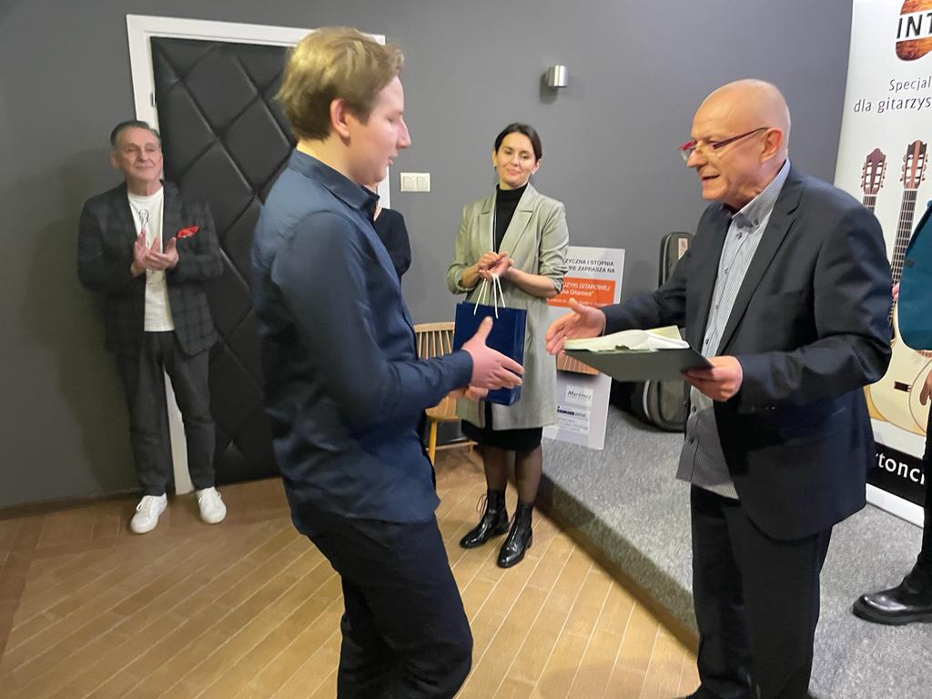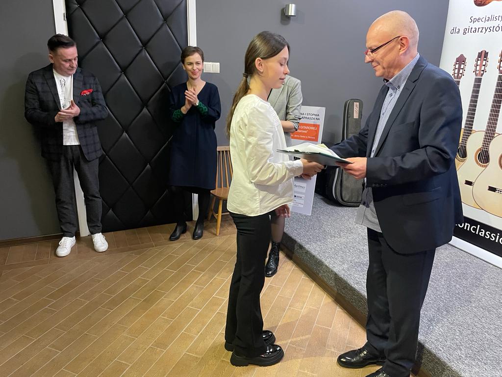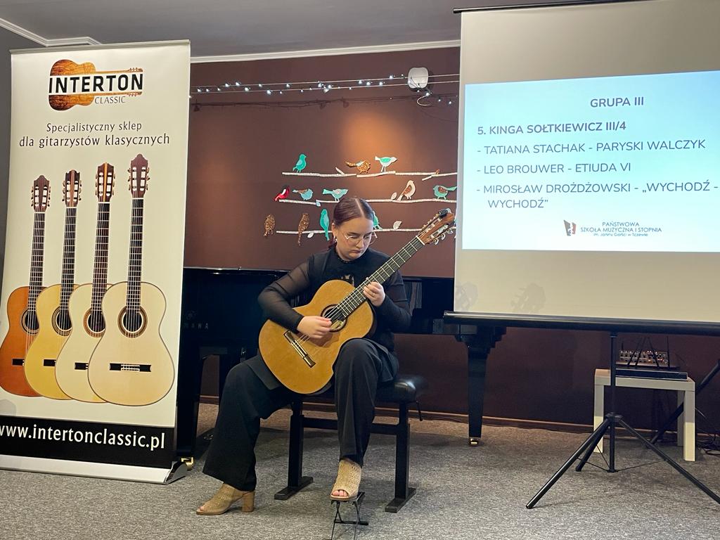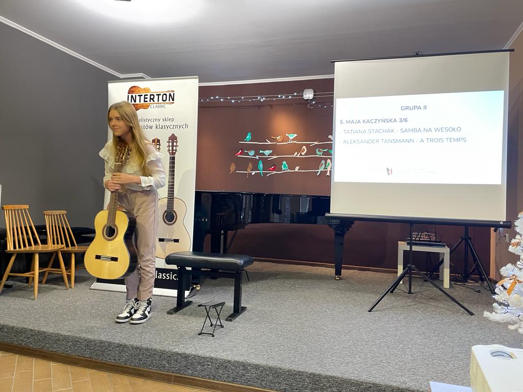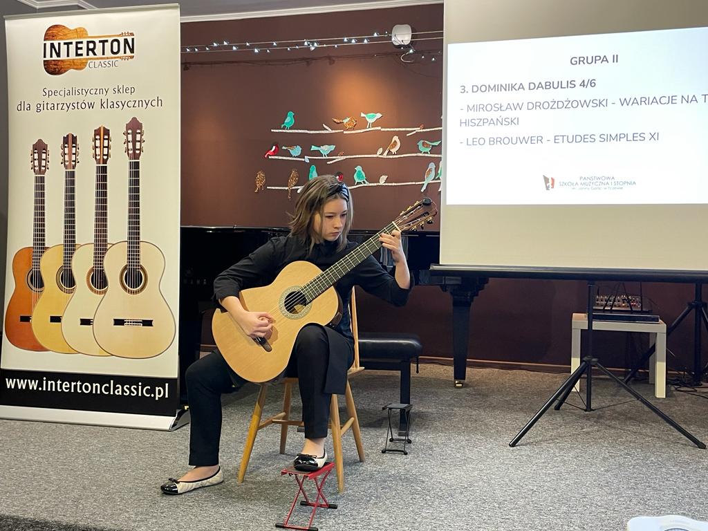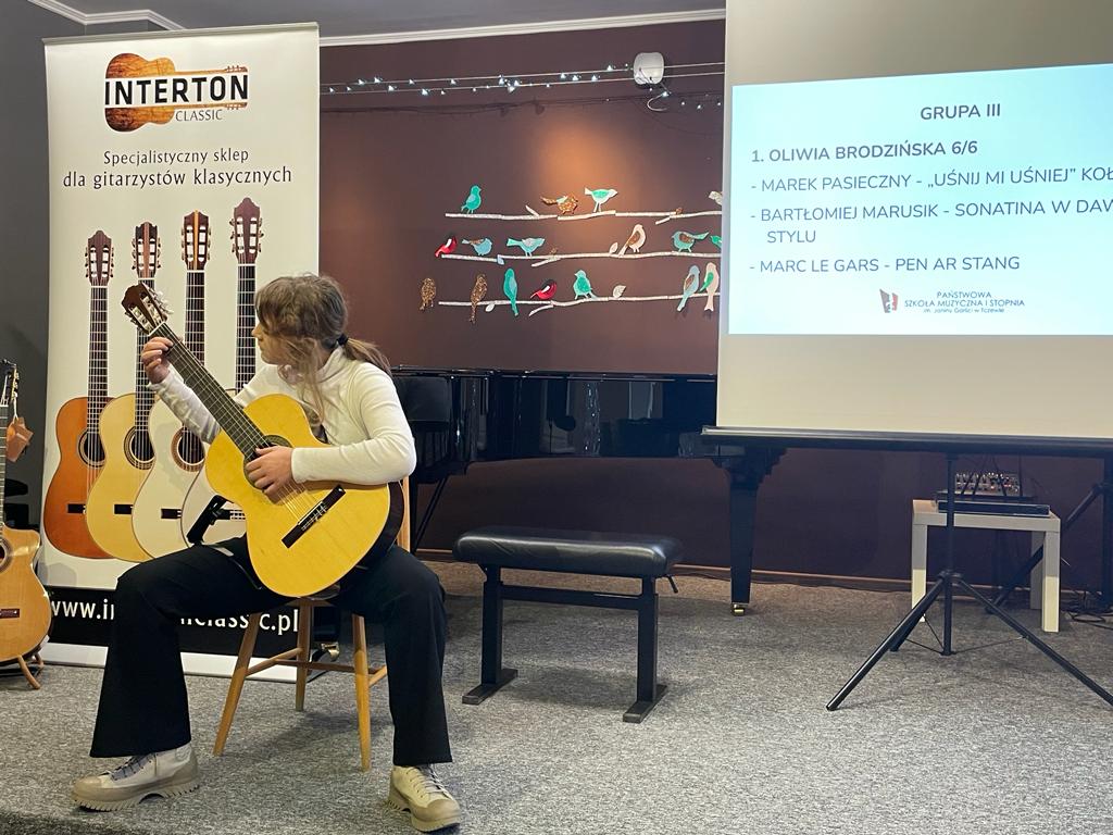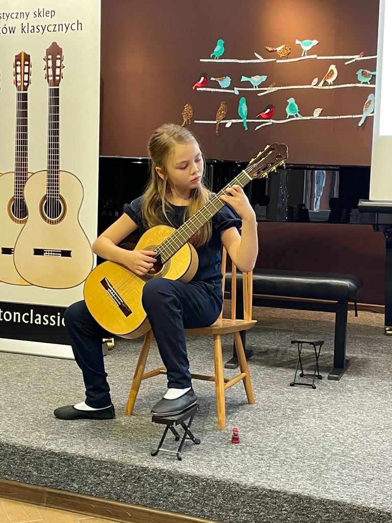 1 grudnia 2022 r. w naszej szkole odbył się VI Festiwal Polskiej Muzyki Gitarowej "Współczesna muzyka gitarowa". W przesłuchaniach konkursowych w 3 kategoriach wiekowych wzięło udział 25 uczniów, w tym trzech reprezentantów naszej szkoły: Julia Kajzer kl. 2/6 i Maja Kaczyńska kl. 3/6 - uczennice p. Anny Bukowskiej oraz Aleksander Wanta kl. 1/4 - uczeń p. Antoniego Jędrzejewskiego. Uczestników oceniało jury w składzie: prof. Mirosław Drożdżowski - przewodniczący jury, dr Monika Dżuła-Radkiewicz, mgr Magdalena Jenda-Kujawa. Pełne wyniki znajdują się w zakładce festiwalu. A nasz uczeń - Aleksander Wanta - otrzymał WYRÓŻNIENIE. Gratulujemy!!