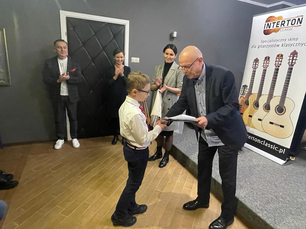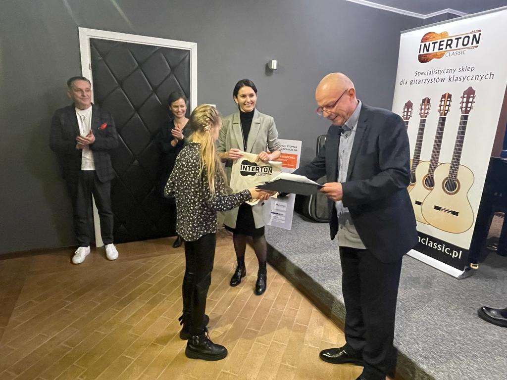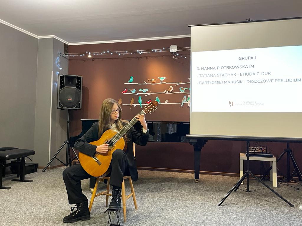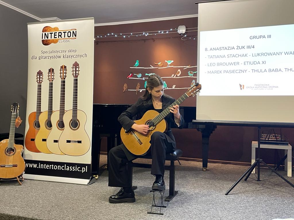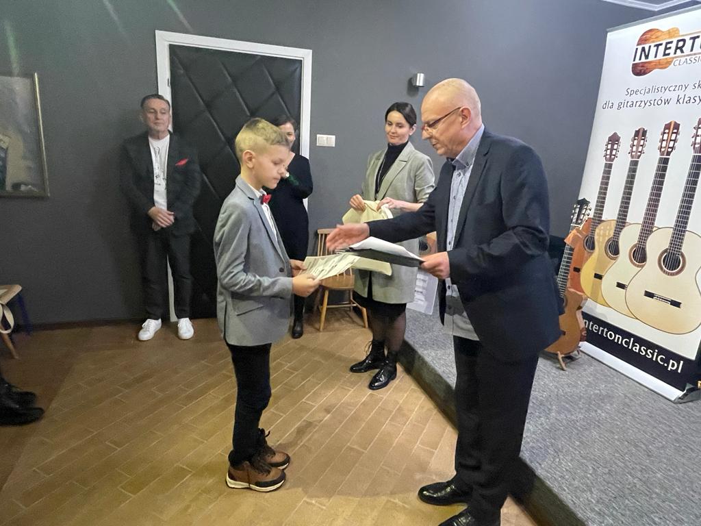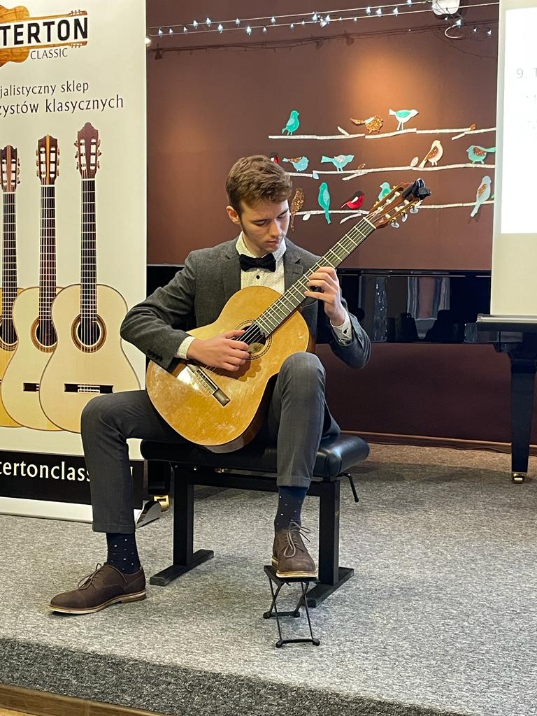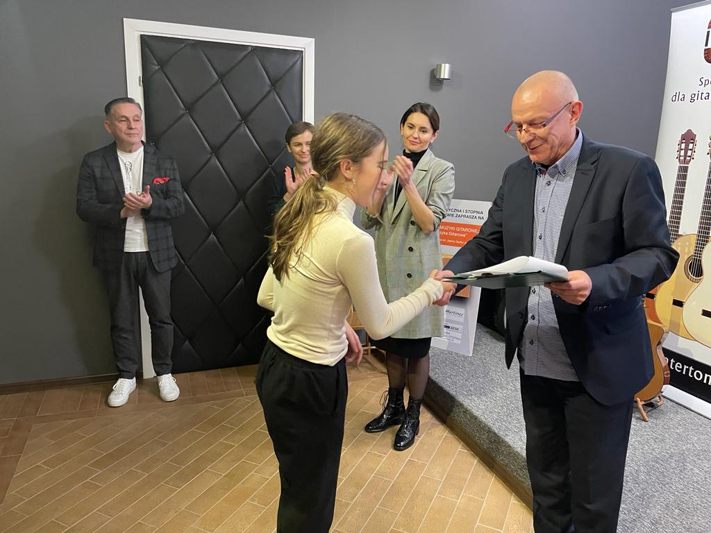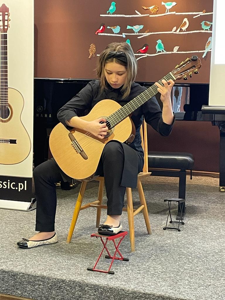 1 grudnia 2022 r. w naszej szkole odbył się VI Festiwal Polskiej Muzyki Gitarowej "Współczesna muzyka gitarowa". W przesłuchaniach konkursowych w 3 kategoriach wiekowych wzięło udział 25 uczniów, w tym trzech reprezentantów naszej szkoły: Julia Kajzer kl. 2/6 i Maja Kaczyńska kl. 3/6 - uczennice p. Anny Bukowskiej oraz Aleksander Wanta kl. 1/4 - uczeń p. Antoniego Jędrzejewskiego. Uczestników oceniało jury w składzie: prof. Mirosław Drożdżowski - przewodniczący jury, dr Monika Dżuła-Radkiewicz, mgr Magdalena Jenda-Kujawa. Pełne wyniki znajdują się w zakładce festiwalu. A nasz uczeń - Aleksander Wanta - otrzymał WYRÓŻNIENIE. Gratulujemy!!