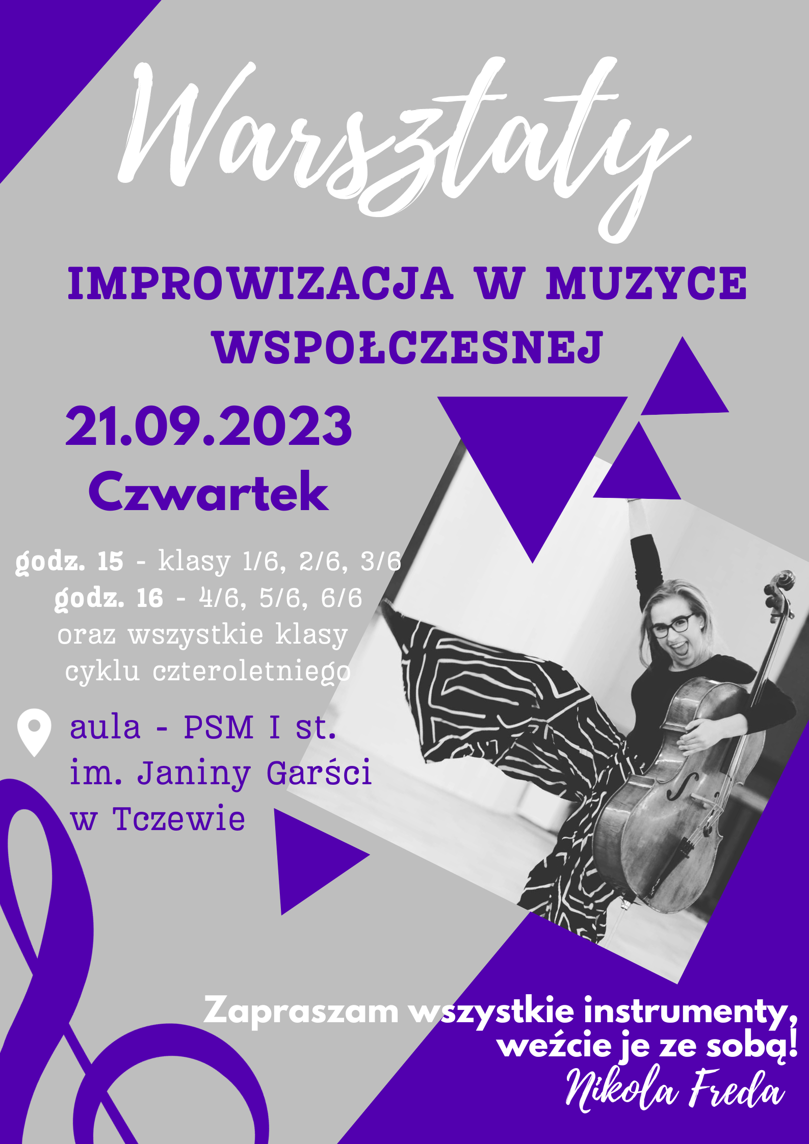Zapraszamy na "Warsztaty - Improwizacja w muzyce współczesnej", które odbędą się 21 września 2023 r. (czwartek) o godzinie 15:00 dla - klasy 1/6, 2/6, 3/6, a o godzinie 16:00 - dla klas 4/6, 5/6, 6/6 oraz wszystkich klas cyklu czteroletniego. Warsztaty odbywać się będą w Auli PSM I st. im. Janiny Garści w Tczewie.