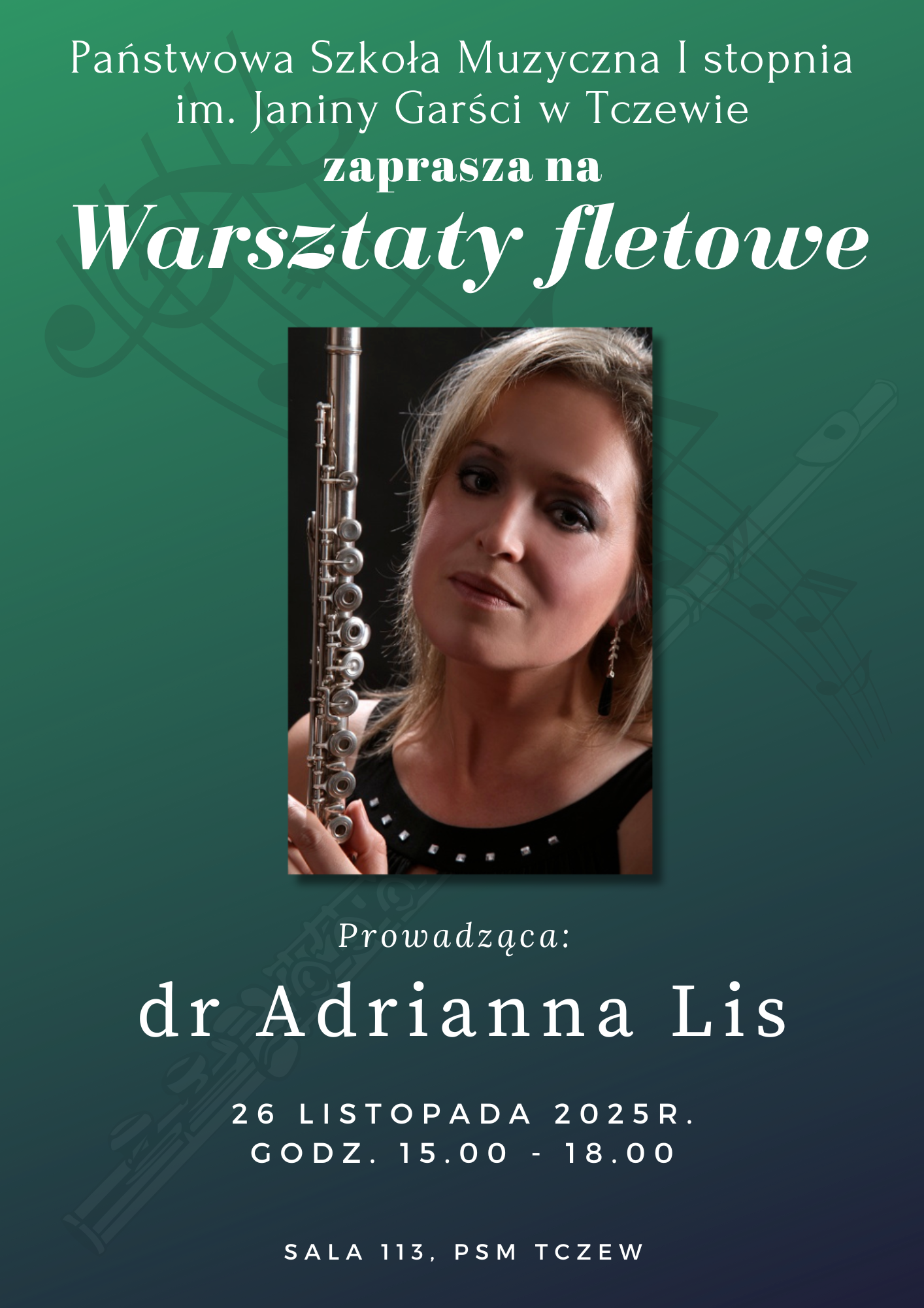 Już 26 listopada 2025 r. nasi fleciści po raz kolejny będą mogli popracować pod czujnym okiem i uchem dr Adrianny Lis. Warsztaty fletowe odbędą się w godzinach 15:00-18:00 w sali 113. Obecność wszystkich flecistów obowiązkowa, a dokładny harmonogram lekcji dostępny u nauczycielek fletu.