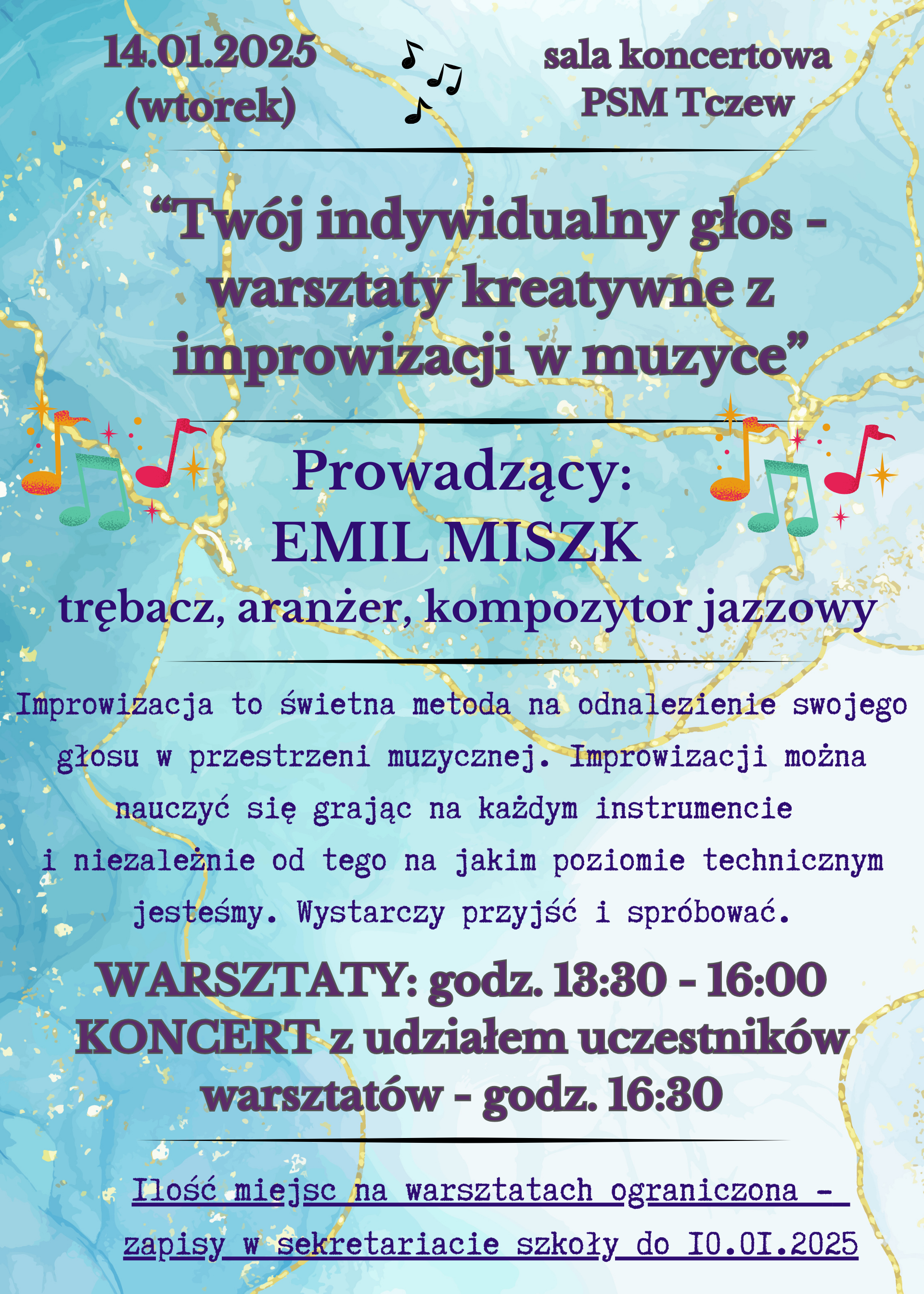 14 stycznia 2025 roku zapraszamy na Warsztaty improwizacji, które poprowadzi p. Emil Miszk. Warsztaty odbędą się w sali koncertowej naszej szkoły, w godzinach 13:30 - 16:00, a zwieńczy je KONCERT z udziałem uczestników warsztatów, który odbędzie się o 16:30. Szczegóły na plakacie.