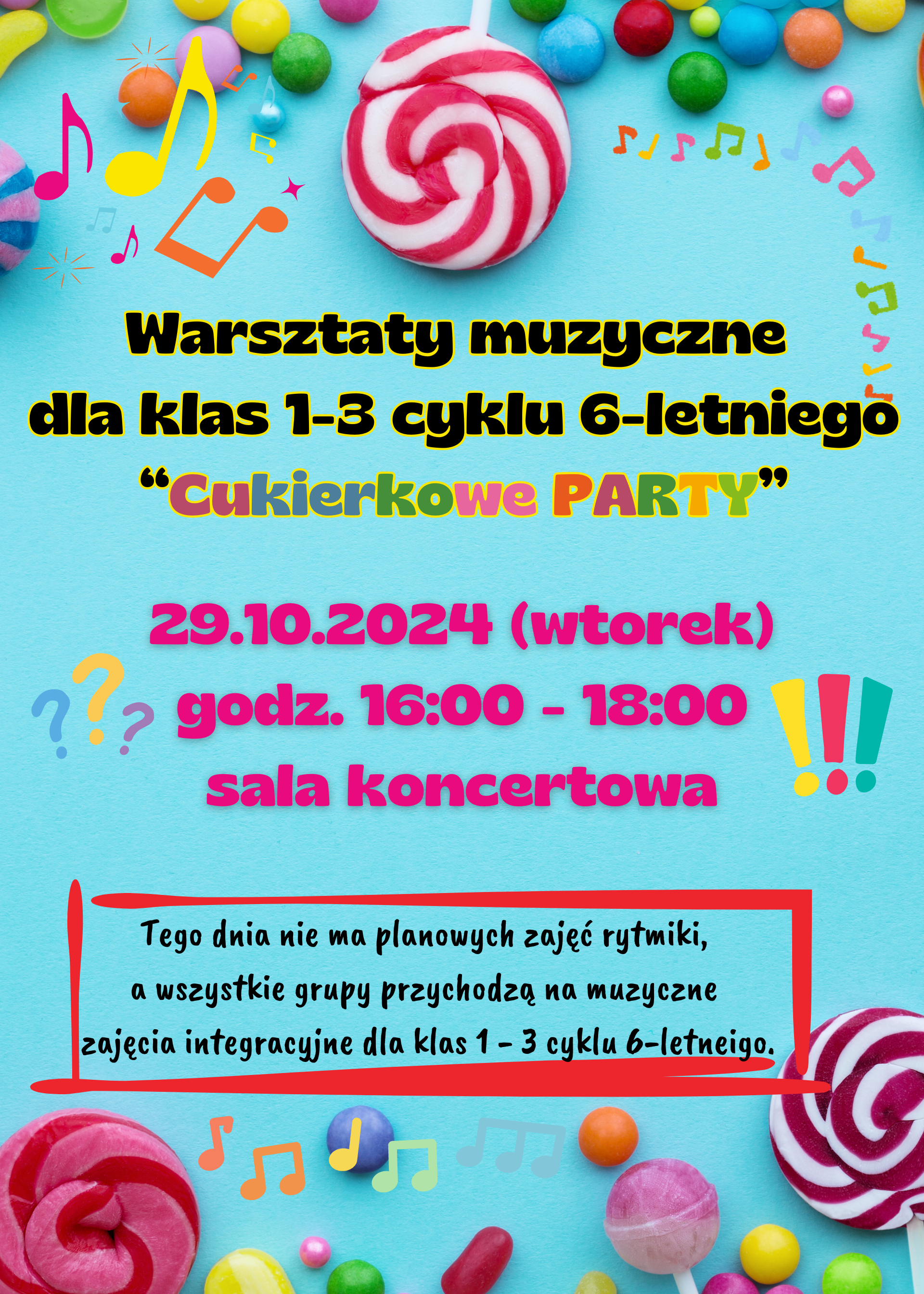 29 października 2024 r. wszystkich uczniów klas 1 - 3 cyklu 6-letniego zapraszamy na Warsztaty muzyczne "Cukierkowe PARTY". Tego dnia nie ma planowych zajęć rytmiki, a warsztaty potrwają od godziny 16:00 do 18:00 w sali koncertowej. ZAPRASZAMY!