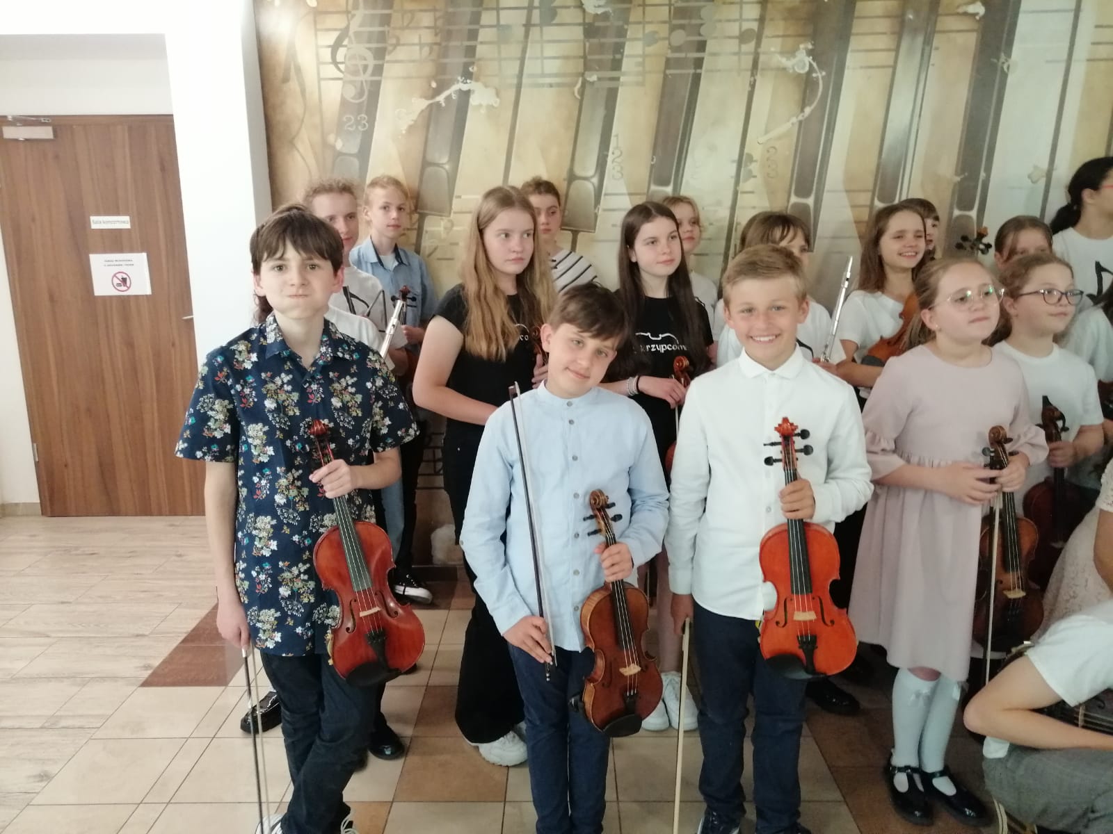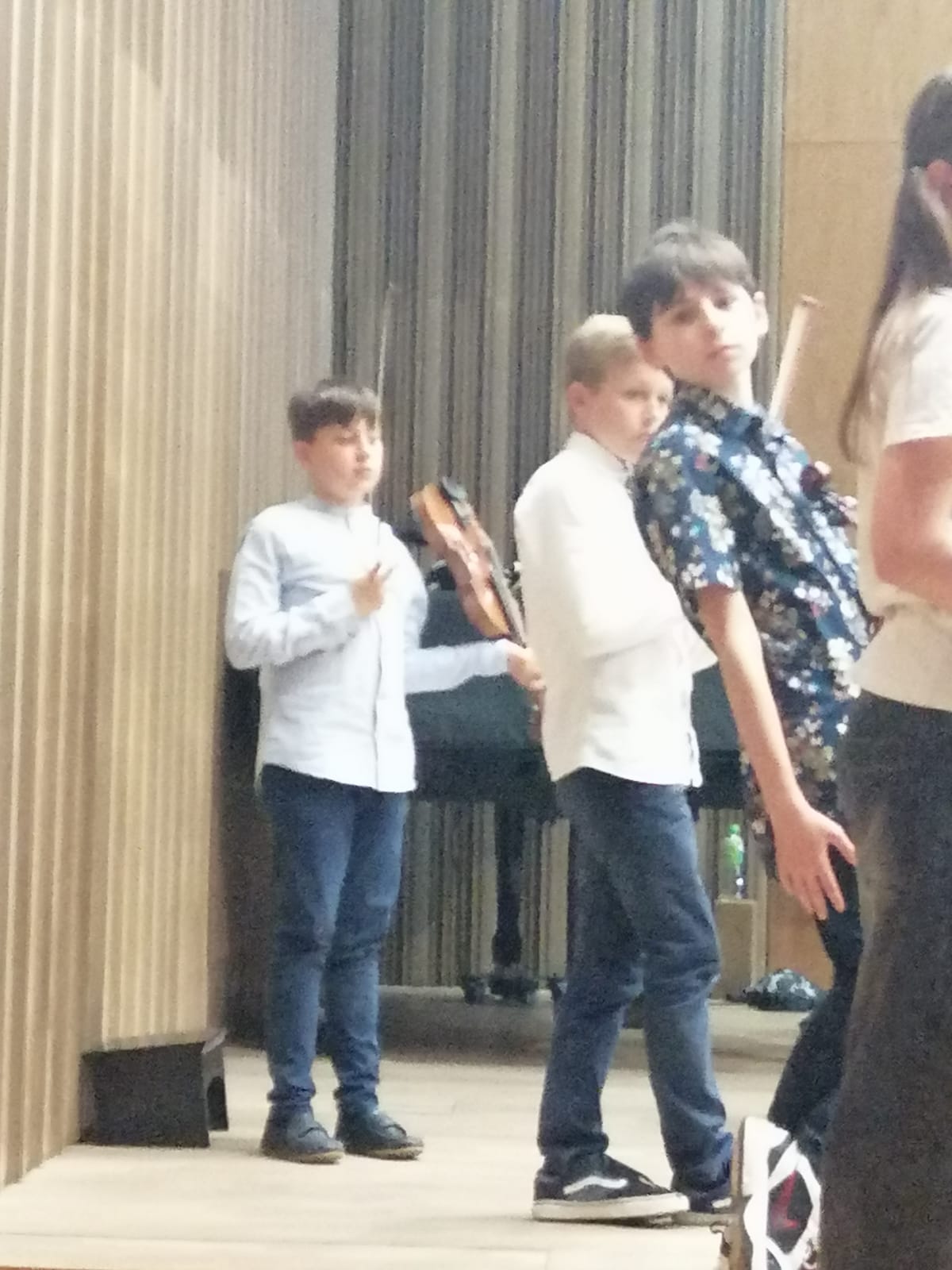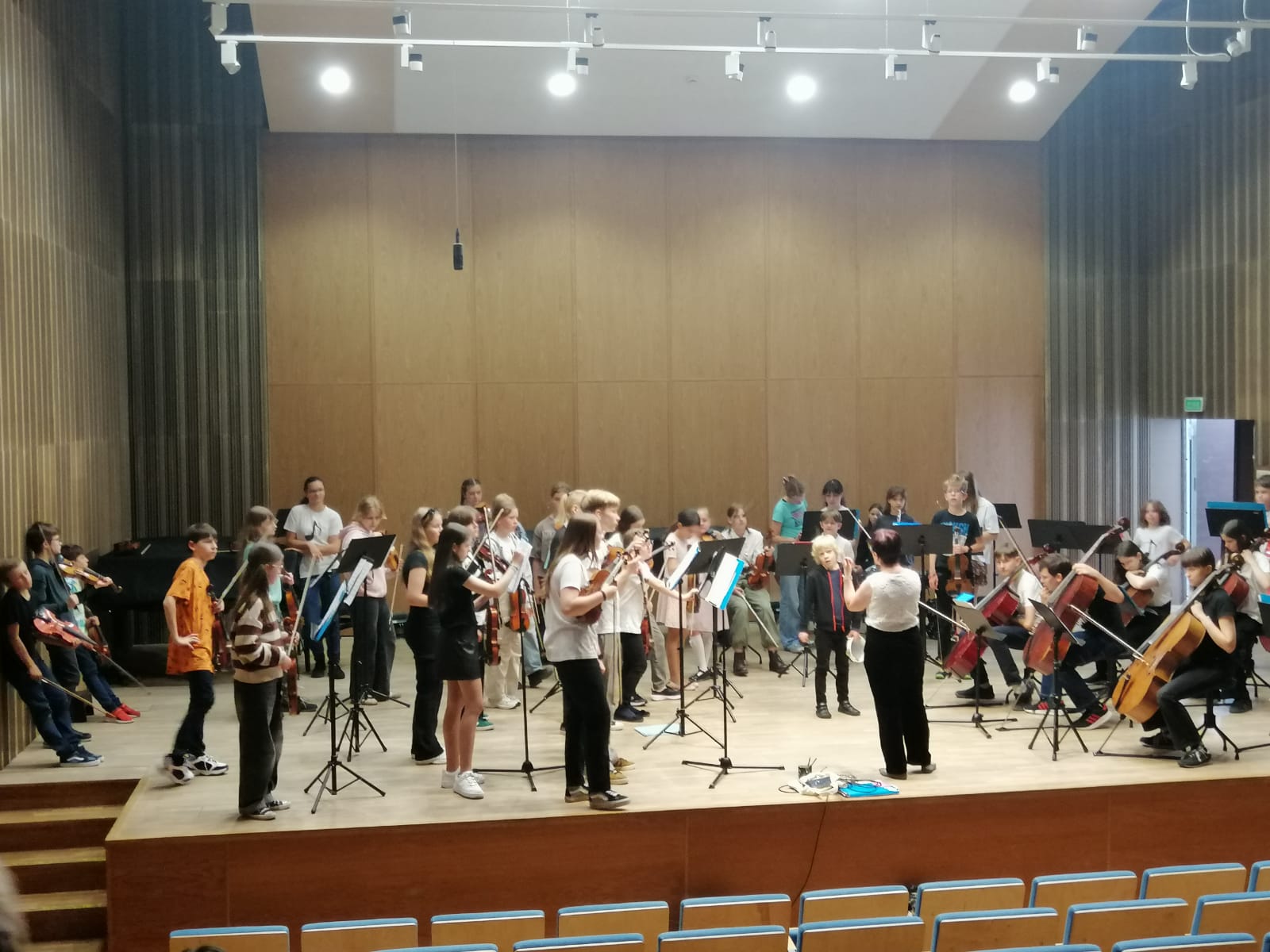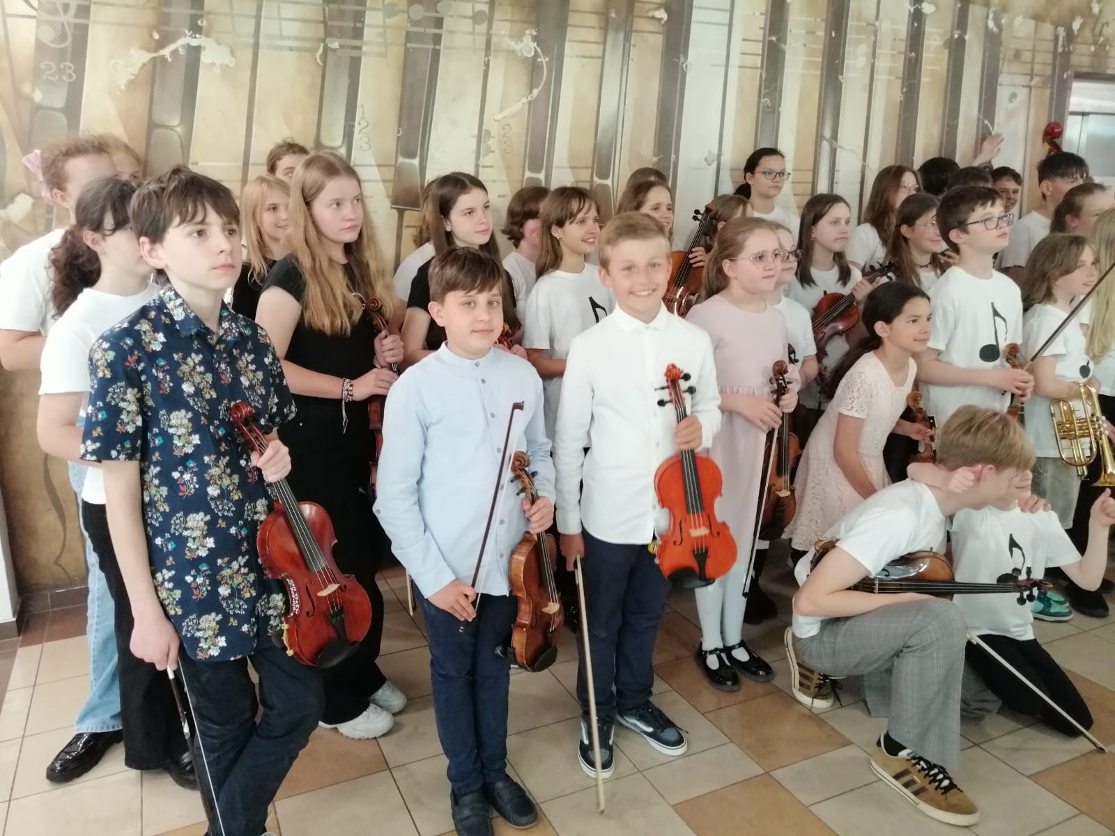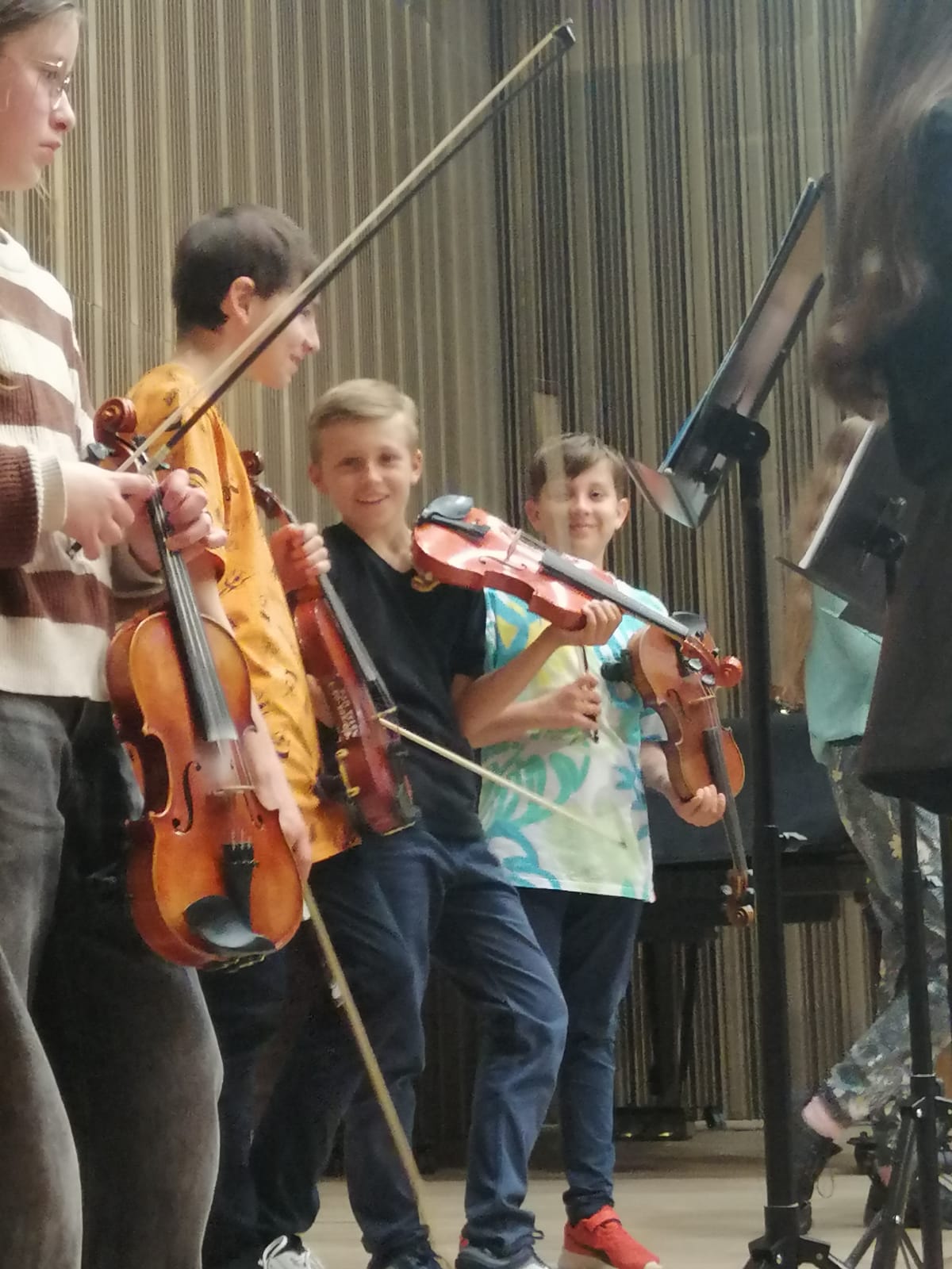 13 czerwca 2025 r. trójka naszych skrzypków: Franek, Filip i Kajetan reprezentowała naszą szkołę na warsztatach Gdyńskiej Kameralistyki Smyczkowej. W gdyńskiej szkole muzycznej pod okiem dyrygentki p. Katarzyny Doliwy-Dobrowolskiej mieli okazję zagrać w prawdziwej dziecięcej orkiestrze wzbogaconej o sekcję dętą oraz perkusję. Orkiestra składała się z dzieci i młodzieży z kilku różnych szkół muzycznych (Gdynia, Gdańsk, Gdańsk Orunia, Tczew, Pabianice). Dla Franka, Filipa i Kajtka było to cenne doświadczenie i świetnie się zaprezentowali na koncercie wieńczącym warsztaty. Na chłopców po intensywnej pracy z instrumentem czekały niespodzianki: zabawa na placu zabaw, pizza, lody oraz koncert szwedzkiej grupy bębniarzy, wykonującej rytmiczną muzykę afrykańską. Uczniów doskonale do występu przygotowały p. Marta Kołodziejska-Kacprzak i p. Aldona Śmietańska, która również zorganizowała wyjazd uczniów i opiekę. Opiekunem wycieczki była także p. Ludmiła Strzałkowska. Paniom nauczycielkom dziękujemy za świetne przygotowanie uczniów, a chłopcom gratulujemy występu!!