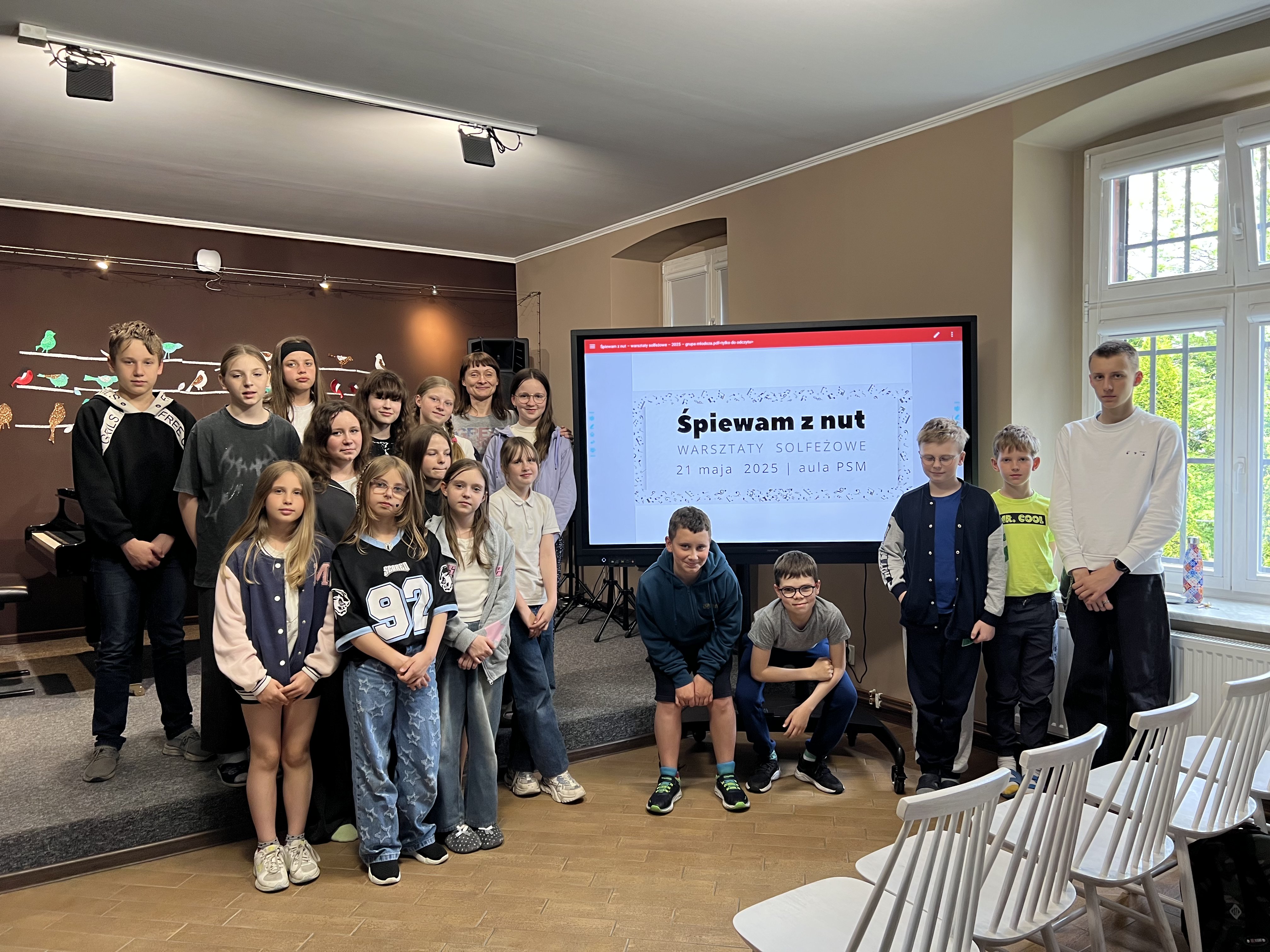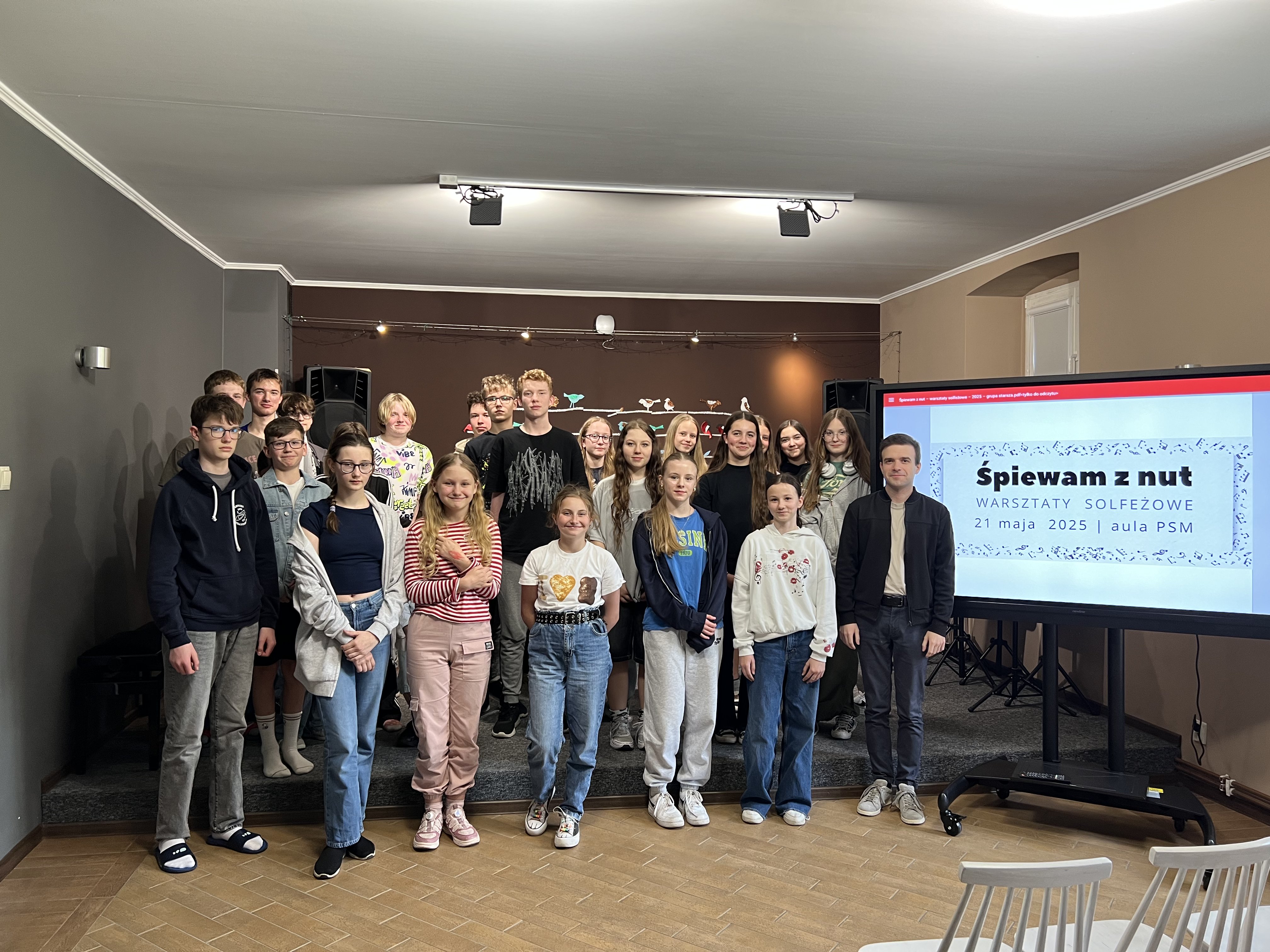 W szkole muzycznej poza licznymi koncertami, często nasi uczniowie mają okazję do pracy w grupach. 21 maja 2025 uczniowie klas starszych spotkali się na warsztatach solfeżowych "Śpiewam z nut". Pod czujnym okiem i uchem pani Ewy i pana Miłosza doskonalili umiejętność czytania nut głosem. Taka forma zajęć spotkała się z wielką aprobatą uczniów i przebiegła w radosnej i twórczej atmosferze.