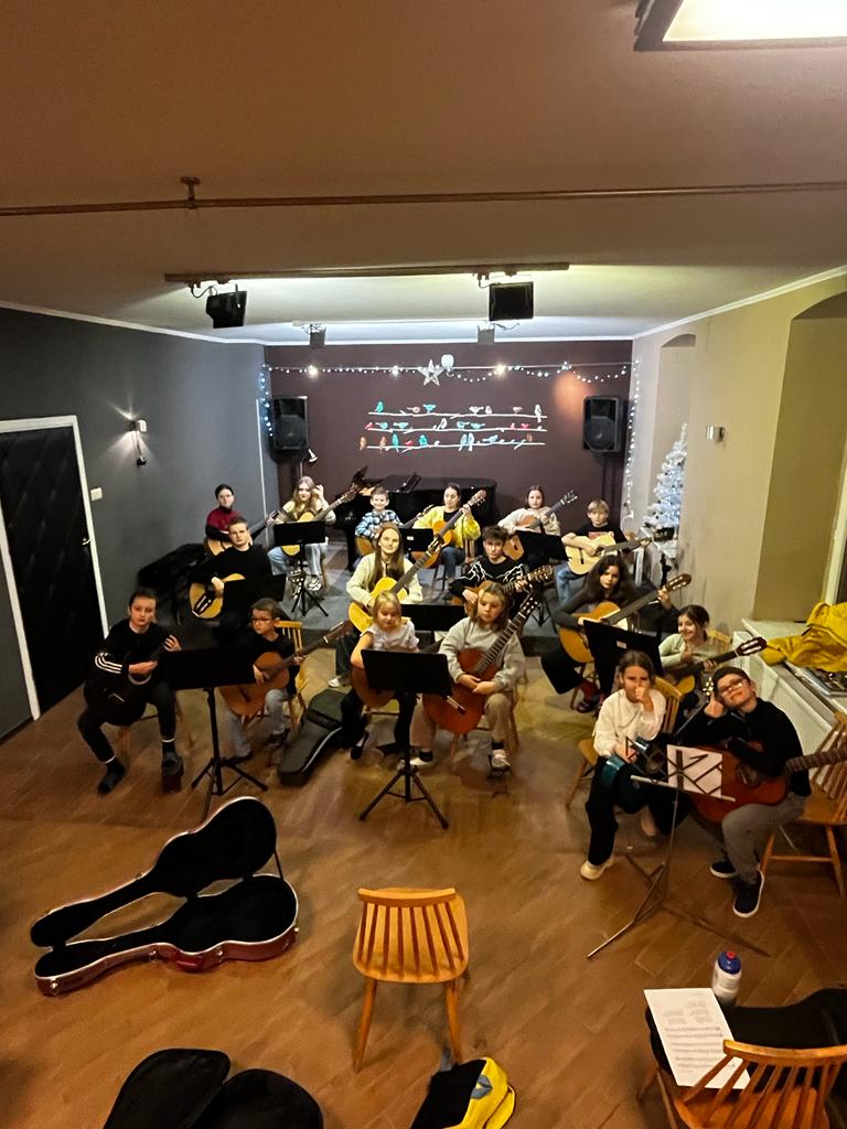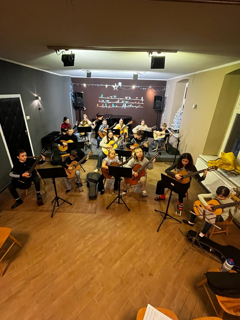 11 grudnia 2023 w naszej szkole (w sali koncertowej) odbyły się warsztaty świąteczne dla gitarzystów, które poprowadzili: p. Anna Bukowski i p. Antoni Jędrzejewski. W warsztatach udział wzięło blisko 20 gitarzystów! Powastała wielka gitarowa orkiestra, która uczyła się grać kolędy z podziałem na głosy - i najmłodsi i najstarsi grali razem. To było fantastyczne doświadczenie dla wszystkich. Na pewno będziemy chcieli w przyszłości powtórzyć takie kolędowanie.