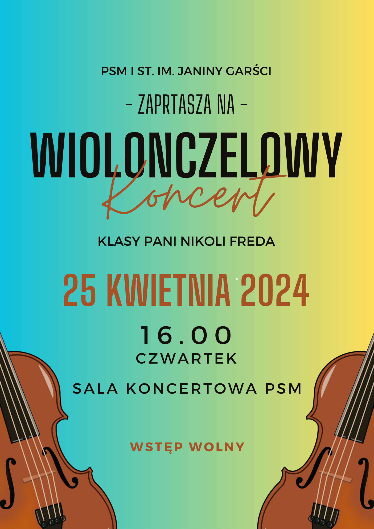 Zapraszamy na "Wiolonczelowy Koncert klasy pani Nikoli Fredy", który odbędzie się 25 kwietnia (czwartek) o godzinie 16:00 w sali koncertowej PSM Tczew.