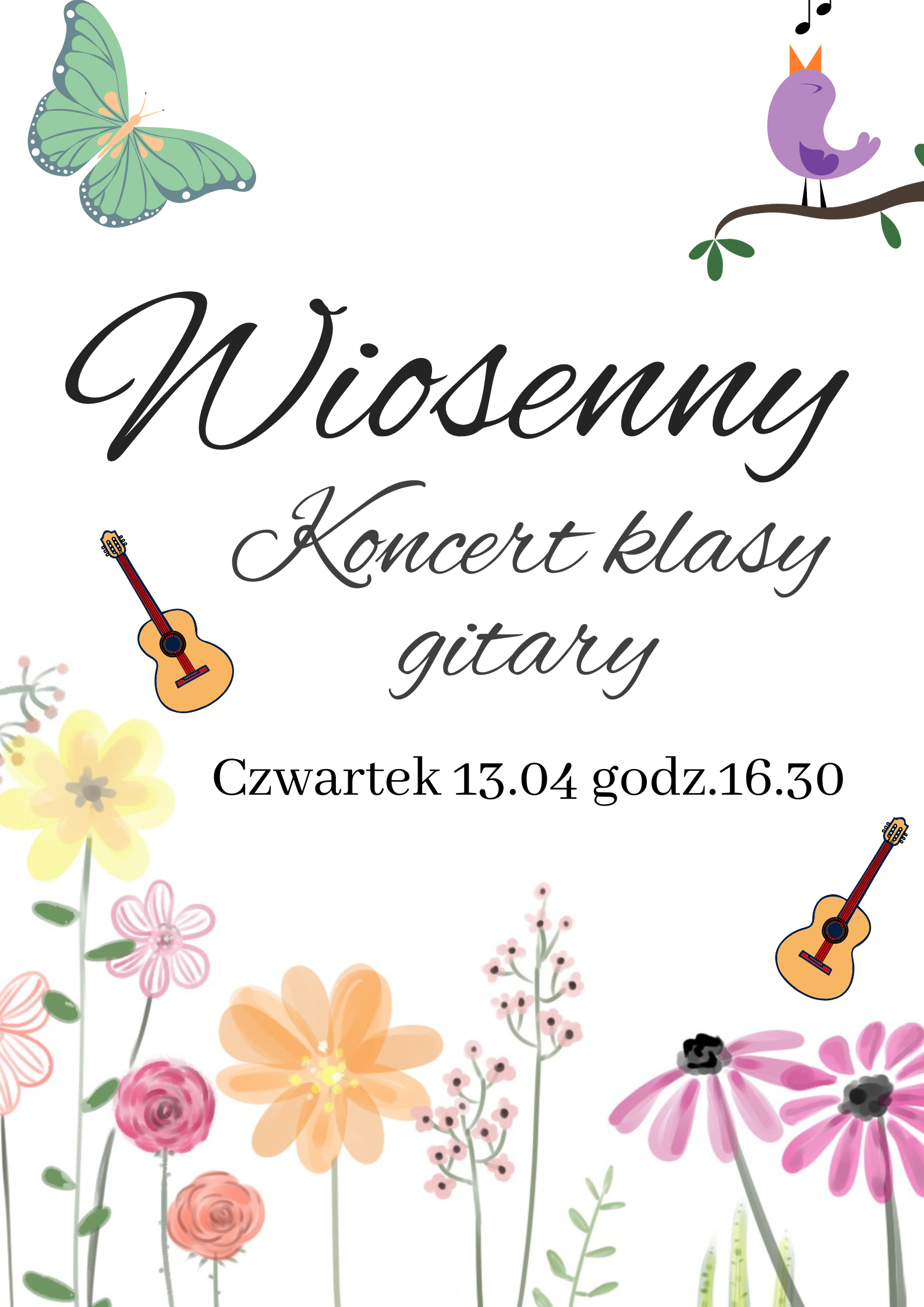 Serdecznie zapraszamy na "Wiosenny Koncert klasy gitary", który odbędzie się 13 kwietnia 2023 r. o godzinie 16:30 w auli PSM w Tczewie. Podczas koncertu wystąpią gitarzyści z klasy p. Anny Bukowskiej. Zapraszamy.