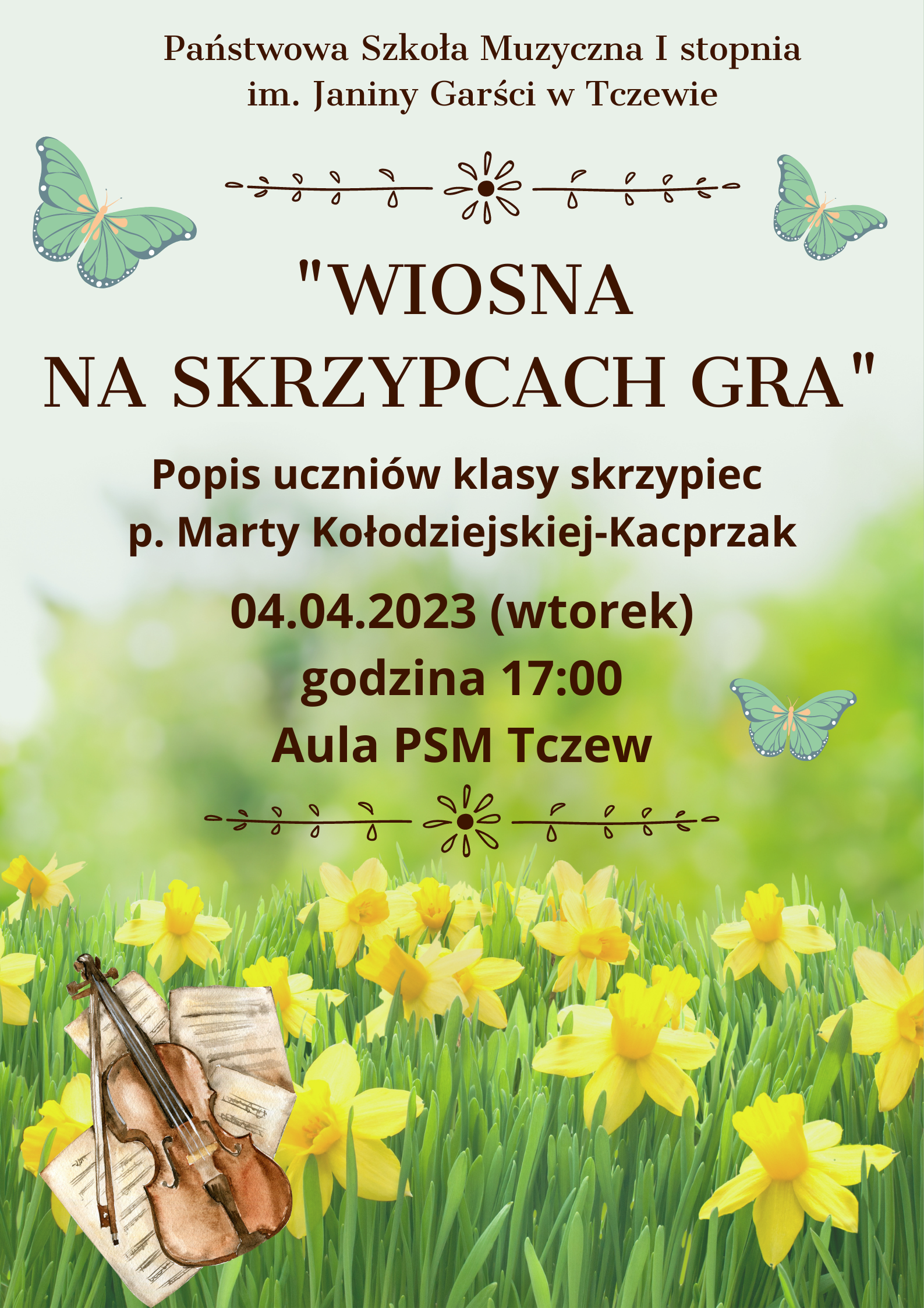 Serdecznie zapraszamy na Popis uczniów klasy skrzypiec p. Marty Kołodziejskiej-Kacprzak - "Wiosna na skrzypcach gra", który odbędzie się 04 kwietnia 2023 r. (wtorek) o godzinie 17:00 w Auli PSM Tczew. Wystąpią: Marysia, Liwia, Kajetan, Nadia, Julia, Oliwia, Iga, Agata, Martyna, Dominika i trio skrzypcowe. Przy fortepianie uczniom towarzyszyć będzie p. Marcin Hinz i p. Marcin Maliszewski. Wstęp wolny. Zapraszamy!