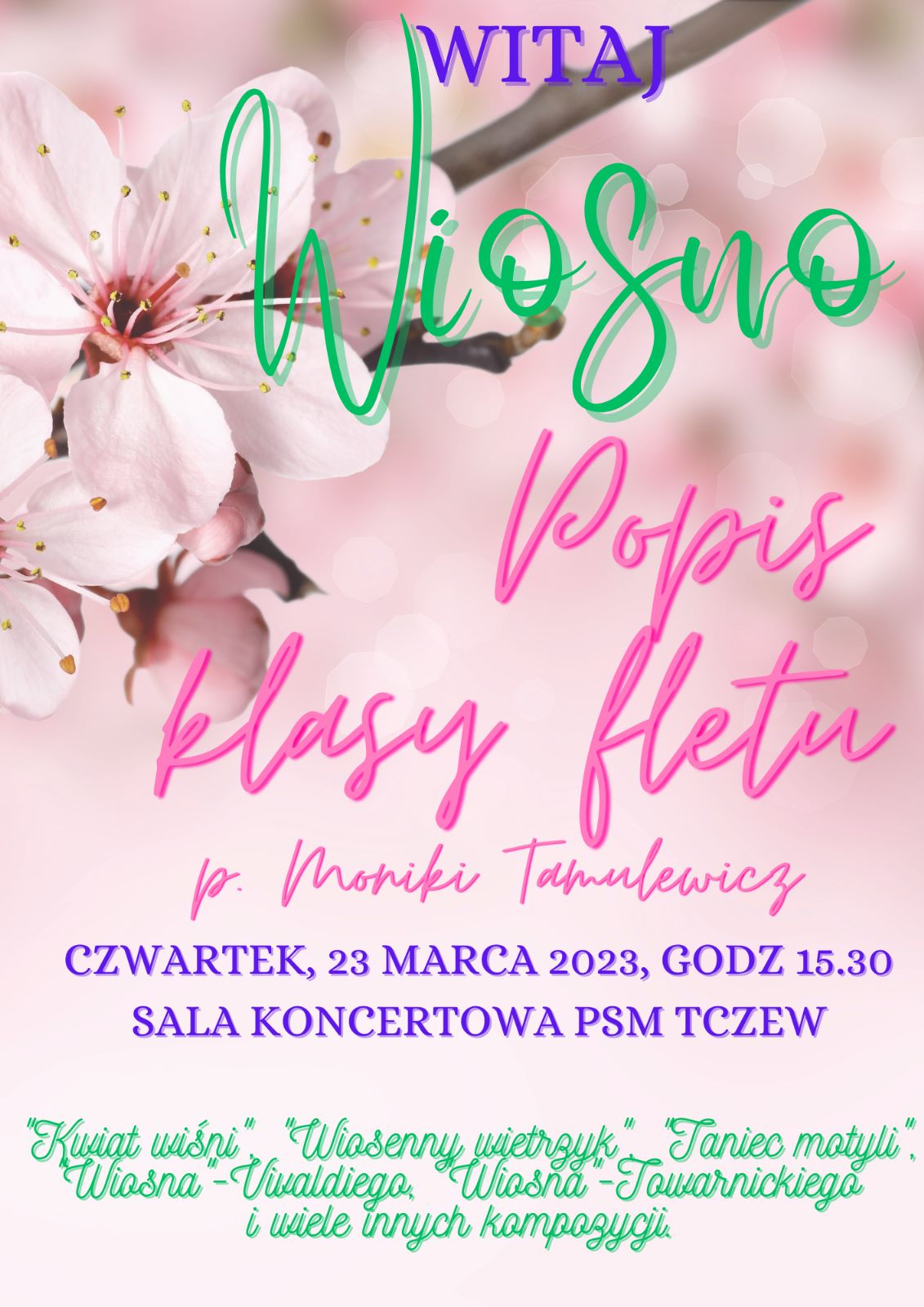 Serdecznie zaparszamy na kolejny koncert wiosenny - "Witaj wiosno" - Popis klasy fletu p. Moniki Tamulewicz. Koncert odbędzie się 23 marca 2023 r. o godzinie 15:30 w sali koncertowej PSM Tczew. w programie m.in. utwory: "Kwiat wiśni", "Wiosenny wietrzyk", "Taniec motyli", "Wiosna - Vivaldiego", Wiosna - Towarnickiego" i wiele innych kompozycji. Zapraszamy!