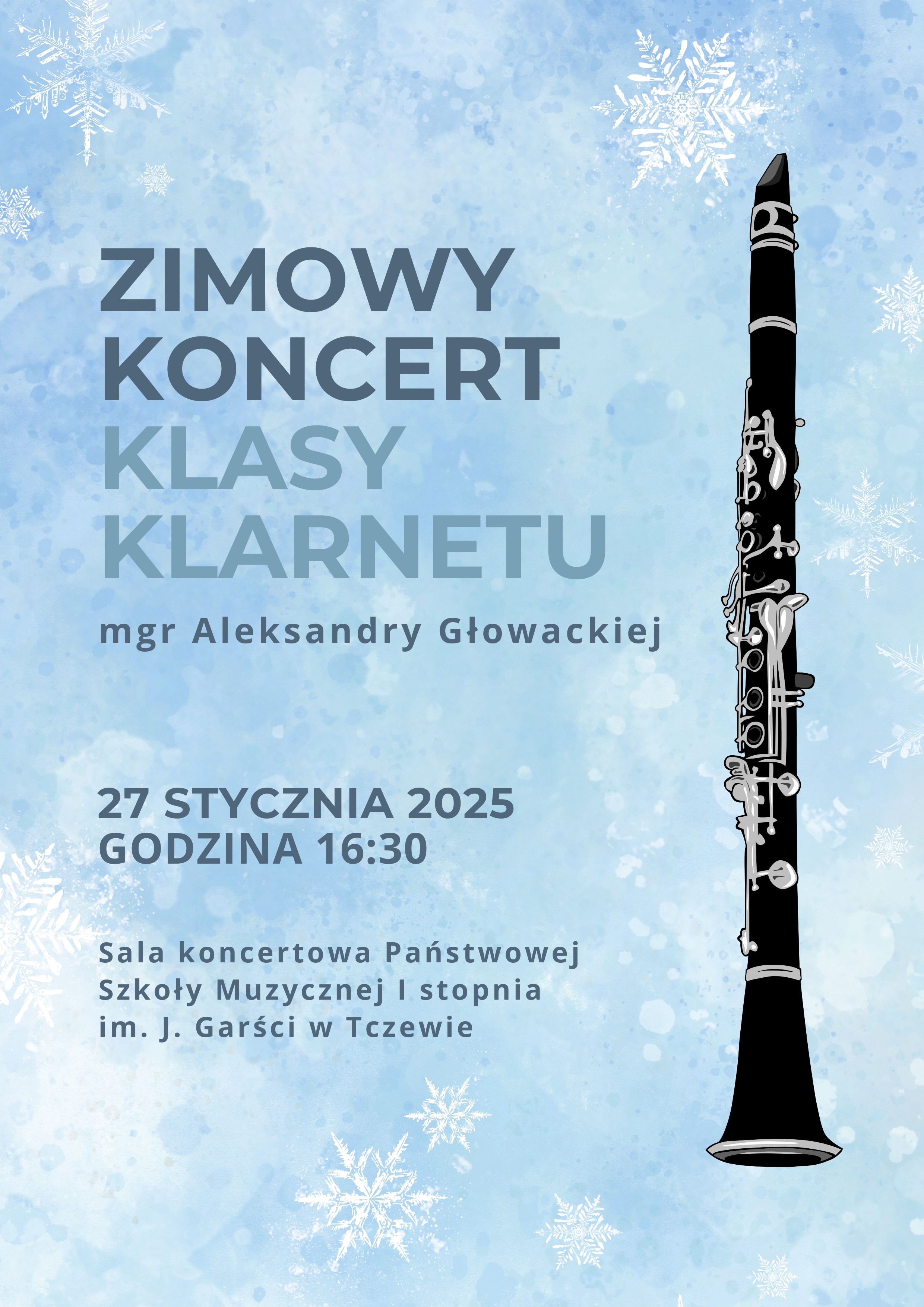 27 stycznia br. na godzinę 16:30 zapraszamy do sali koncertowej naszej szkoły, gdzie odędzie się "Zimowy koncert klasy klarnetu mgr Aleksandry Głowackiej". ZAPRASZAMY!