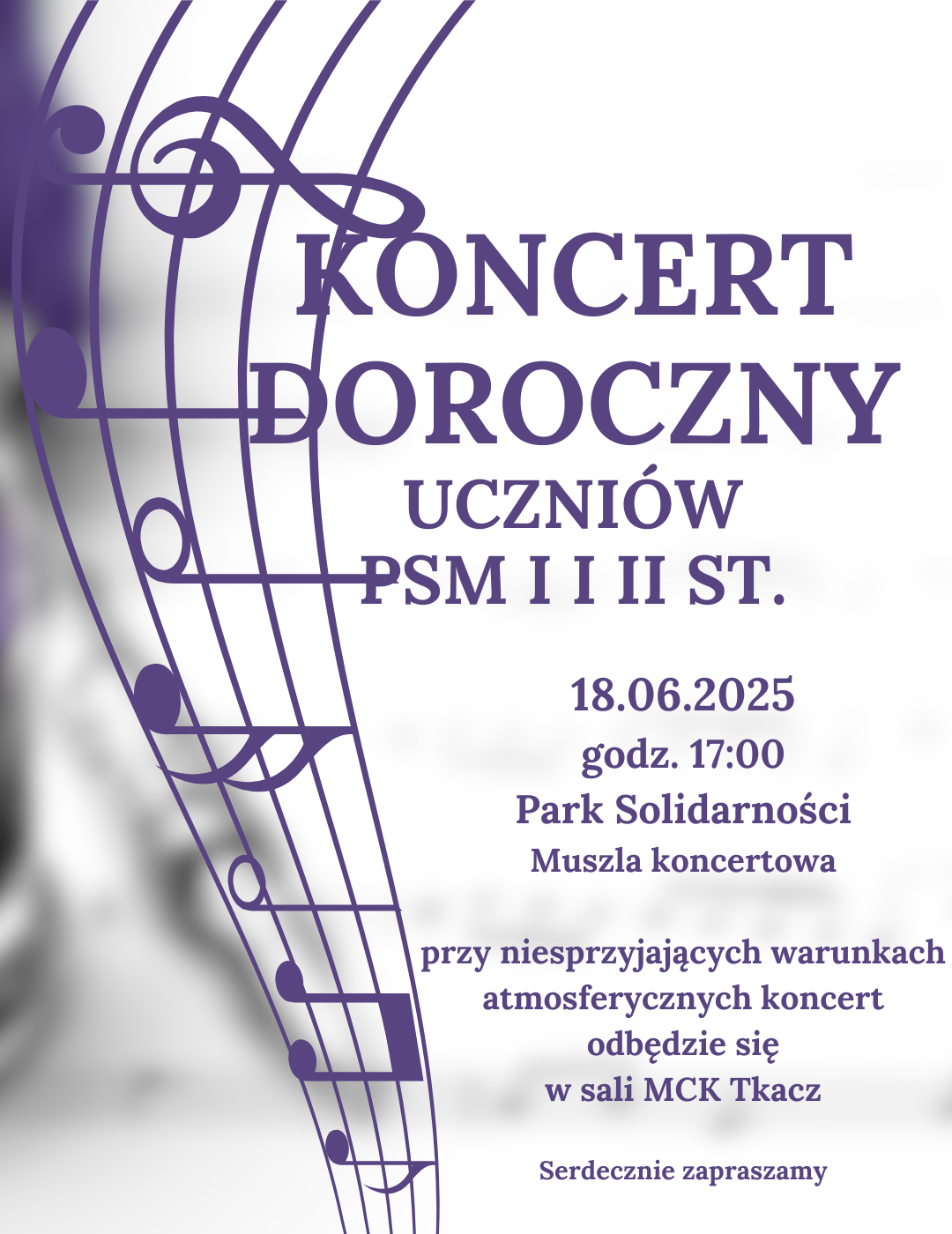 Serdecznie zapraszamy na koncert uczniów Państwowej Szkoły Muzycznej I i II stopnia, który odbędzie się 18.06.2025 r. (środa) o godz. 17:00. w Muszli Koncertowej Parku Solidarności.