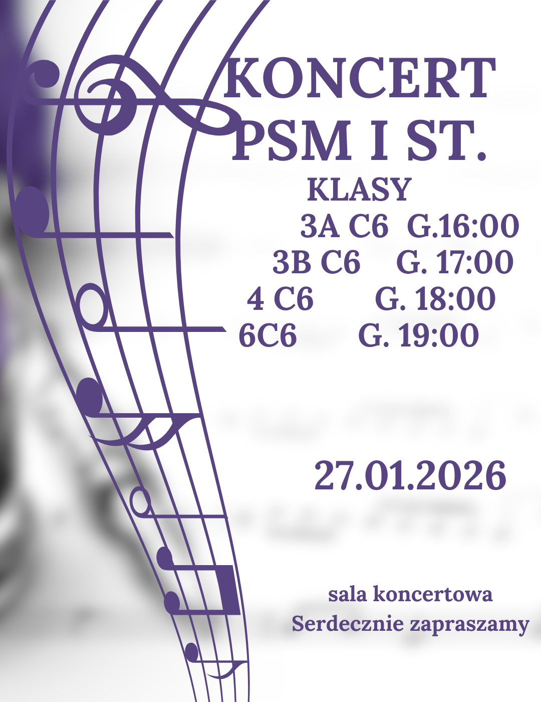 Serdecznie zapraszamy na koncerty klasowe uczniów Państwowej Szkoły Muzycznej I stopnia cyklu 6-letniego: