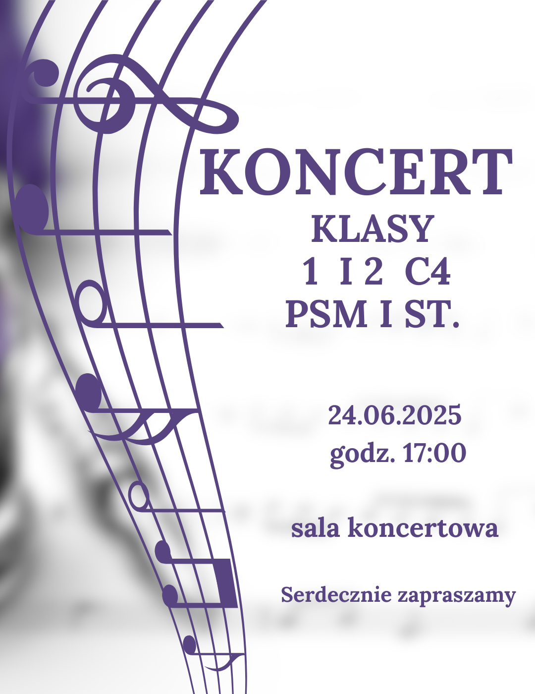Serdecznie zapraszamy na koncert klasy 1 i 2 cyklu 4-letniego PSM I st., który odbędzie się 24.06.2025 (wtorek) o godz. 17:00.