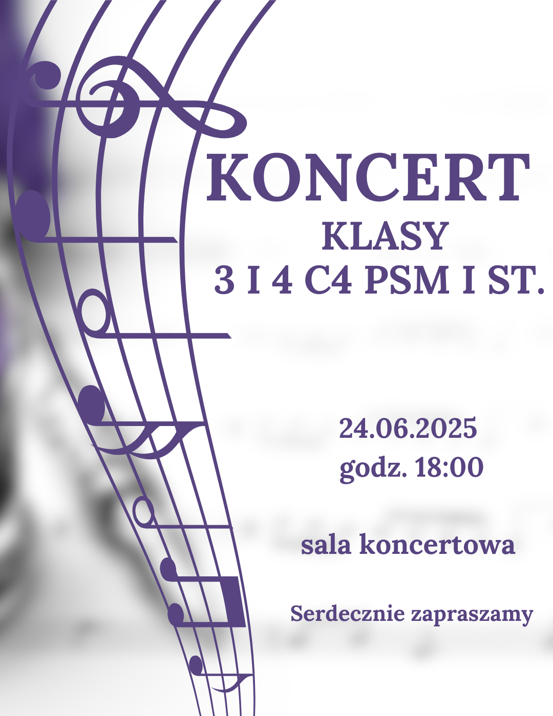 Serdecznie zapraszamy na koncert klasy 3 i 4 cyklu 4-letniego PSM I st., który odbędzie się 24.06.2025 (wtorek) o godz. 18:00.