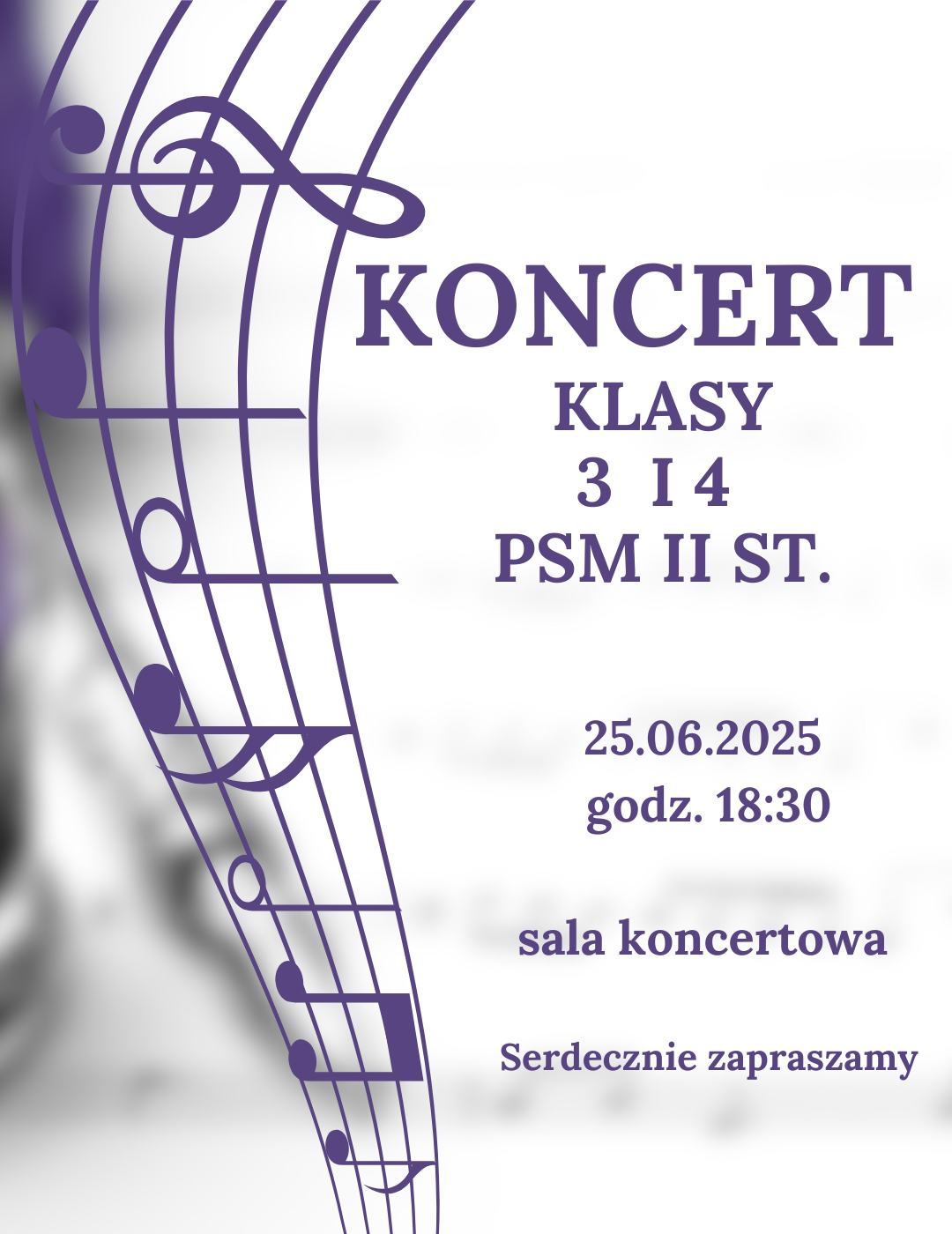 Serdecznie zapraszamy na koncert klasy 3 i 4 PSM II st., który odbędzie się 25.06.2025 (środa) o godz. 18:30.