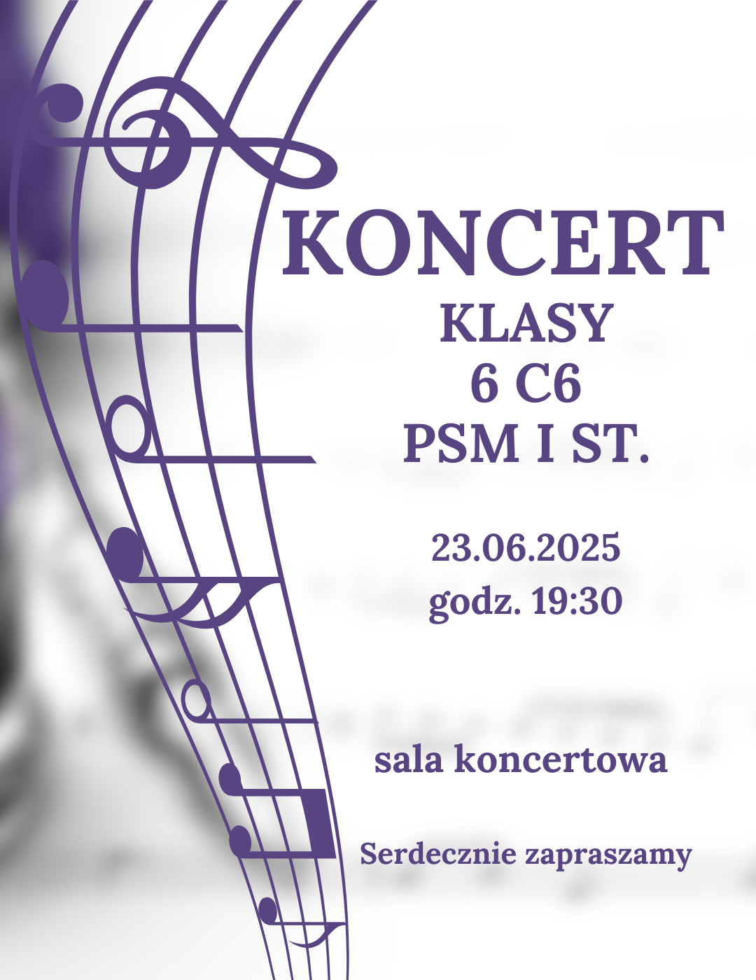 Serdecznie zapraszamy na koncert klasy 6 cyklu 6-letniego PSM I st., który odbędzie się 23.06.2025 (poniedziałek) o godz. 19:30.