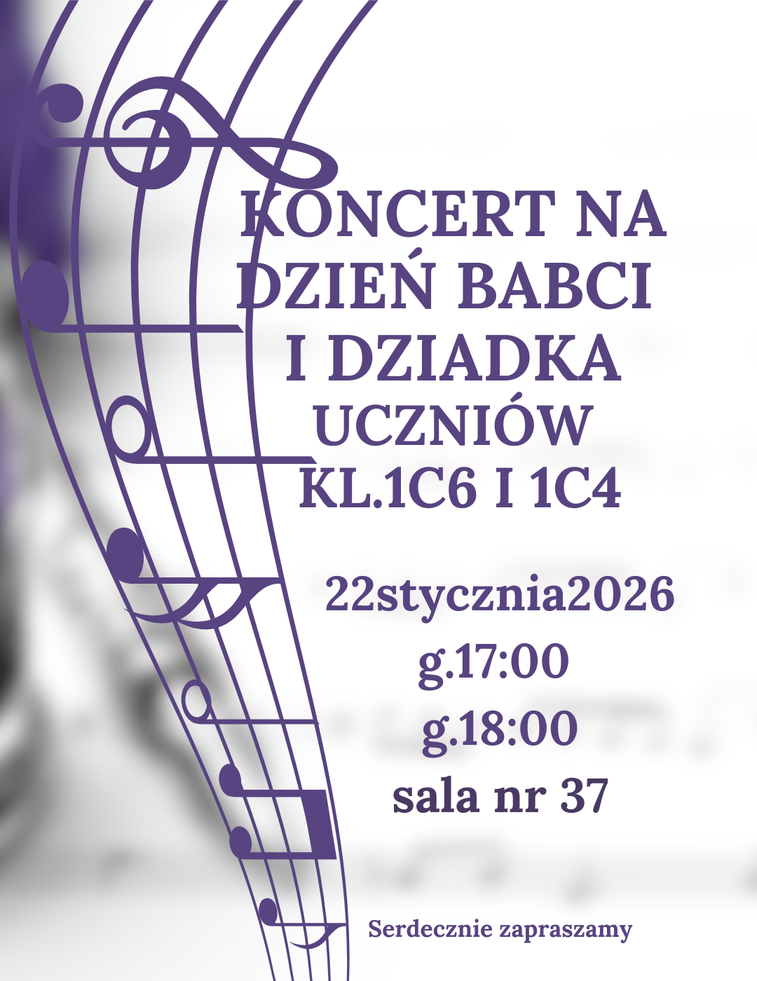 Z okazji Dnia Babci i Dziadka serdecznie zapraszamy 22 stycznia 2026 (czwartek) o godzinie 17:00 i 18:00 na koncert uczniów klas I, przygotowany z myślą o Was – z miłością, radością i uśmiechem.