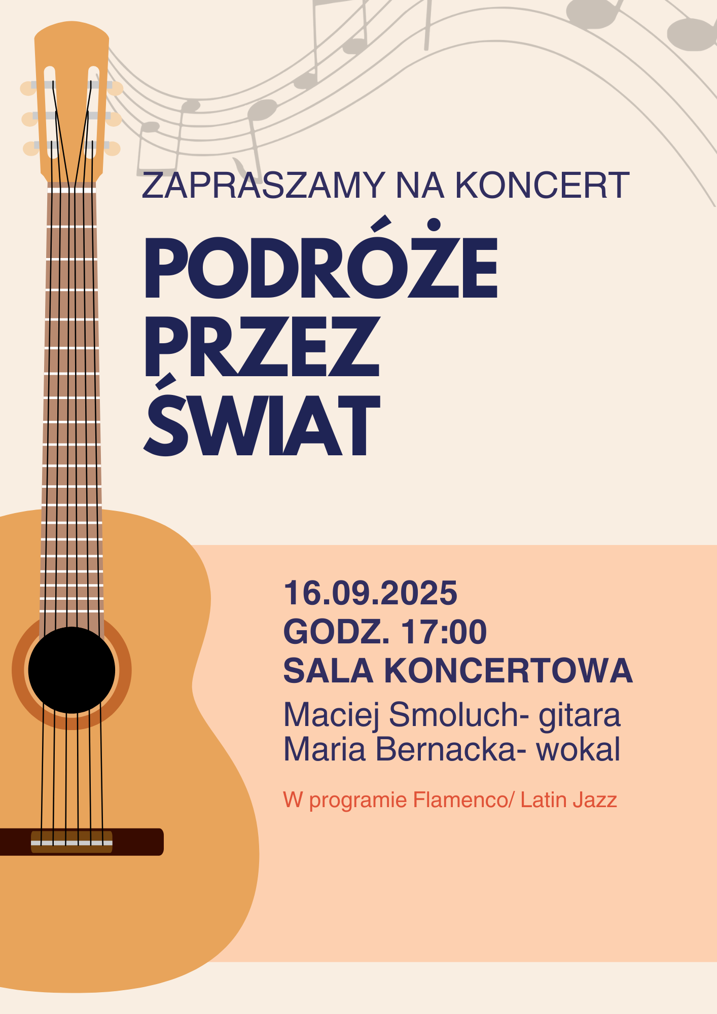 Serdecznie zapraszamy wszystkich miłośników muzyki gitarowej oraz muzyki argentyńskiej na koncert "Podróże przez świat", który odbędzie się 16 września 2025 roku o godzinie 17:00, w sali koncertowej naszej szkoły, w wykonaniu