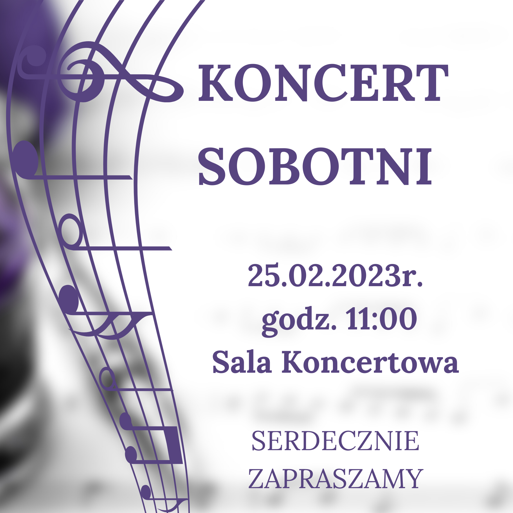 Zapraszamy wszystkich na Koncert Sobotni w dniu 25.02.2023 r. o godzinie 11:00, w sali 28.