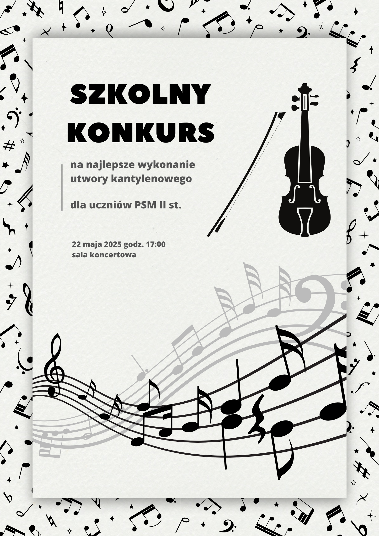Serdecznie zapraszamy wszystkich uczniów szkoły muzycznej II stopnia do udziału w szkolnym konkursie na najlepsze wykonanie utworu kantylenowego. Jest to konkurs otwarty dla publiczności więc będzie on przeprowadzony w charakterze koncertu, zatem zapraszamy również wszystkich melomanów muzyki kantylenowej do wzięcia udziału w tym wydarzeniu.