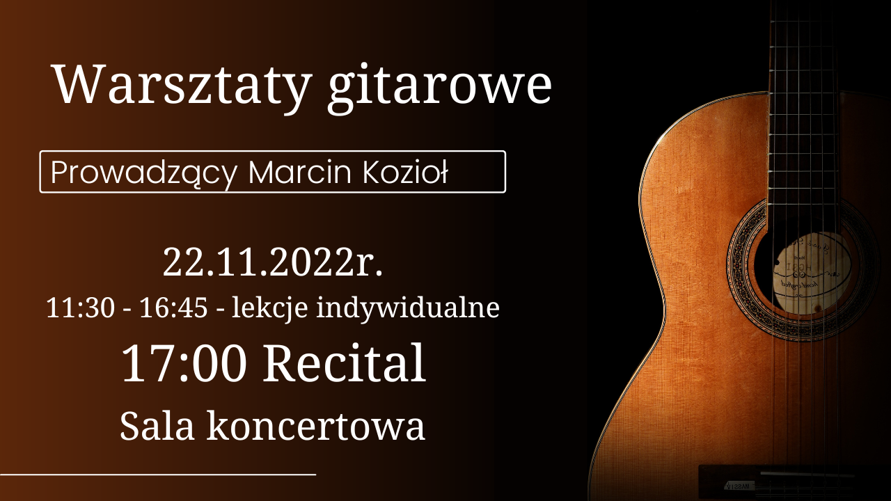 22.11.2022r będziemy mieli przyjemność gościć w naszej szkole doktora sztuk muzycznych Pana Marcina Kozioła. To wybitny gitarzysta, nauczyciel, aranżer, wydawca, kompozytor. Nasi uczniowie będą mieli możliwość wzięcia udziału w owocnych warsztatach , które prowadzi. Po zajeciach Pan Marcin Kozioł, wykona recital ,w którego programie usłyszymy myzykę polskich kompozytorów: F. Horeckigo, S. Moniuszkę ( w opr. M. Drożdżowskiego) i A. Tansmana.