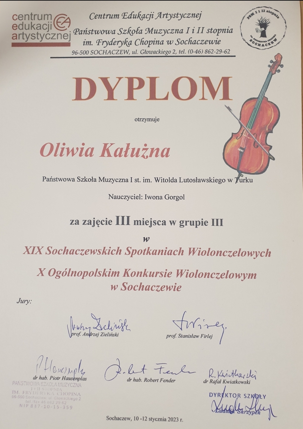 Z dumą informujemy o kolejnym sukcesie naszej uczennicy. Oliwia Kałużna z klasy wiolonczeli p. Iwony Gorgol zajęła III miejsce na "X Ogólnopolskim Konkursie Wiolonczelowym" w Sochaczewie. Laureatce akompaniowała p. Katarzyna Drzewiecka - Łużniak.