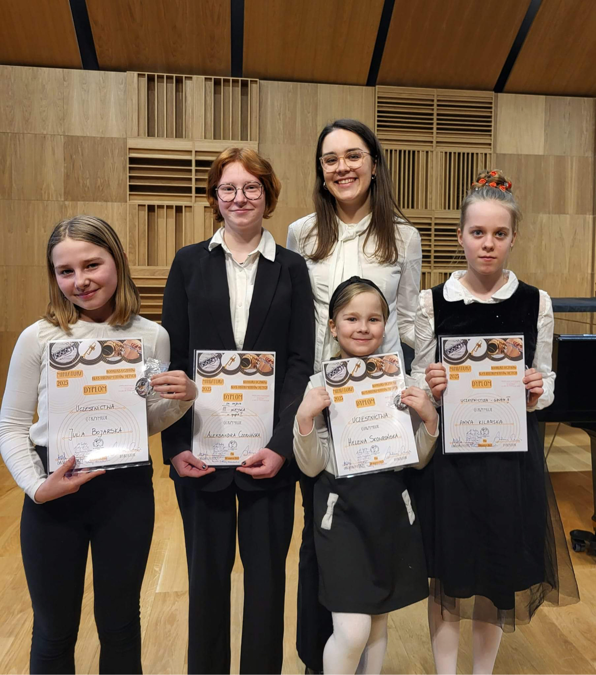 Uczniowie klasy fletu i saksofonu z Państwowej Szkoły Muzycznej I st. im. B. Zielińskiego wzięli udział w konkursie dla uczniów szkół muzycznych w Zespole Szkół Muzycznych im. F. Chopina w Pile. Aleksandra Czerwińska zajęła III miejsce w grupie pierwszej. Helena Skowrońska, Julia Bojarska i Anna Kilarska otrzymały dyplomy uczestnictwa. Dziewczynki zostały przygotowane przez P. Katarzynę Janus i P. Martę Gryc, zaś akompaniował P. Karol Drynkowski.