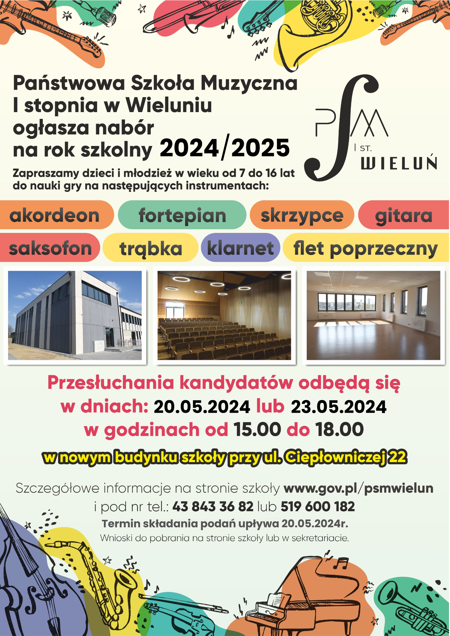 Lista osób przyjętych i nieprzyjętych do PSM I st. w Wieluniu zostanie wywieszona w budynku szkoły.